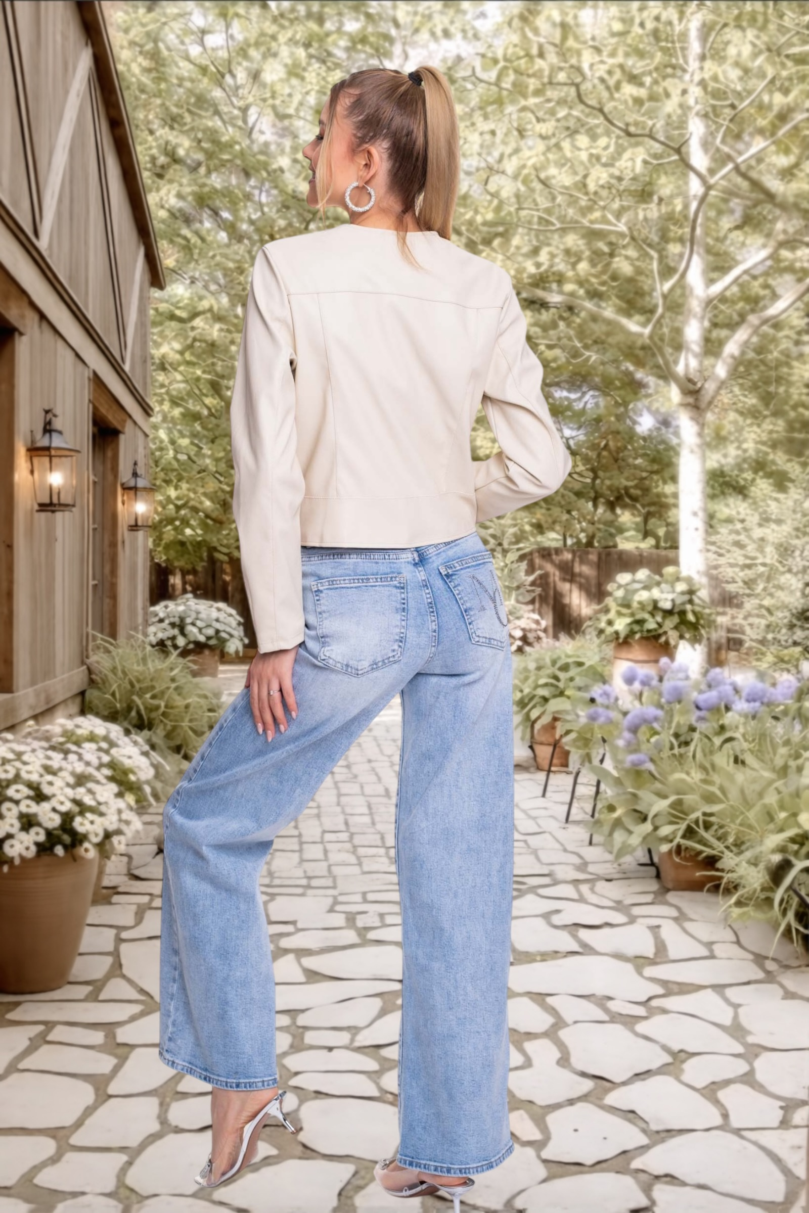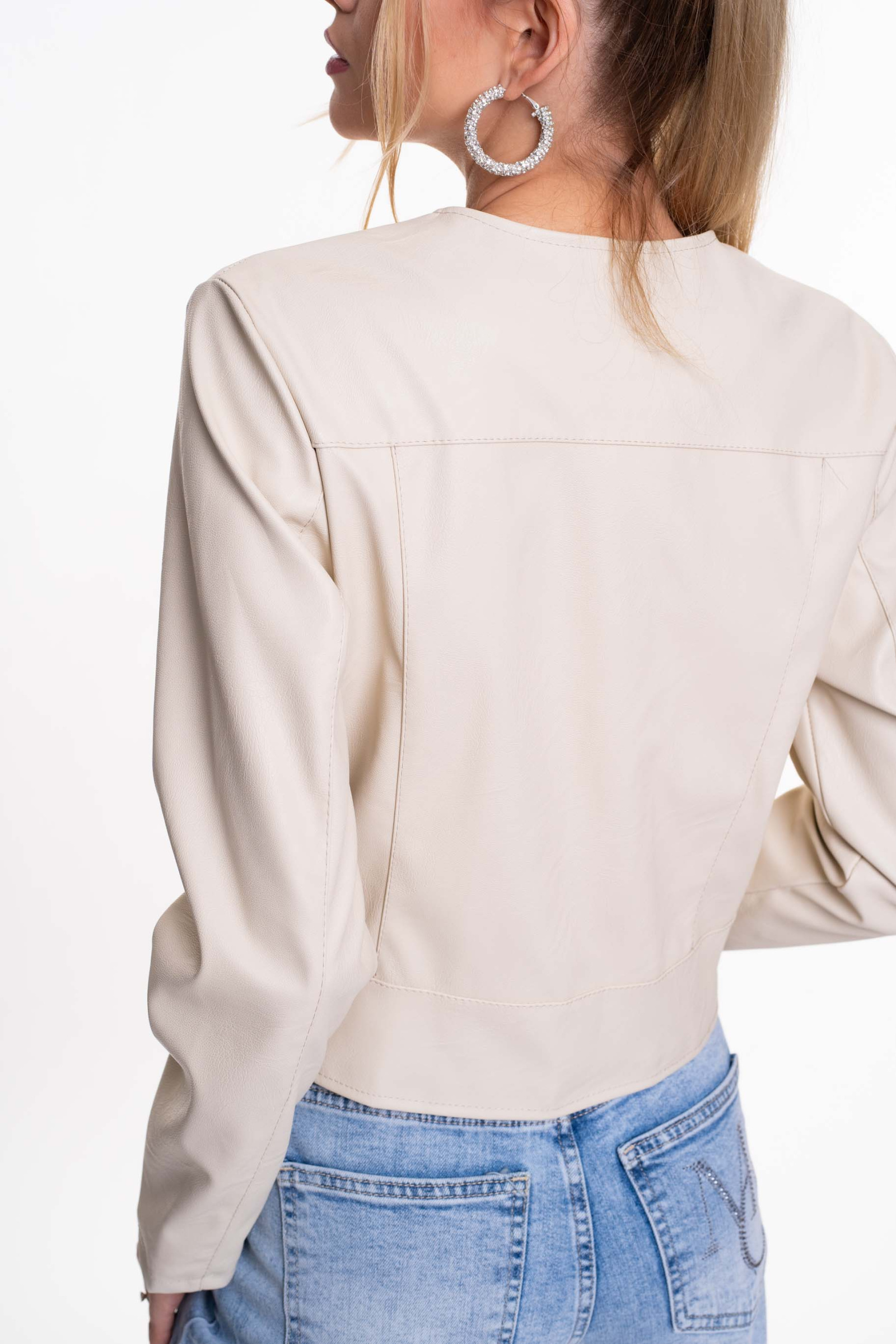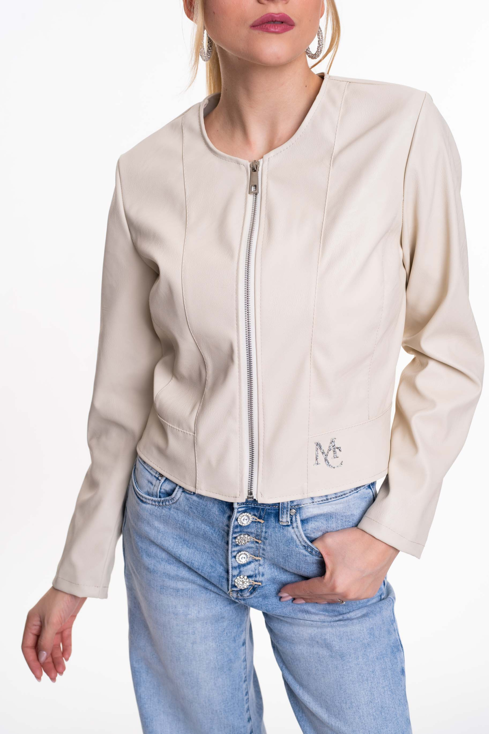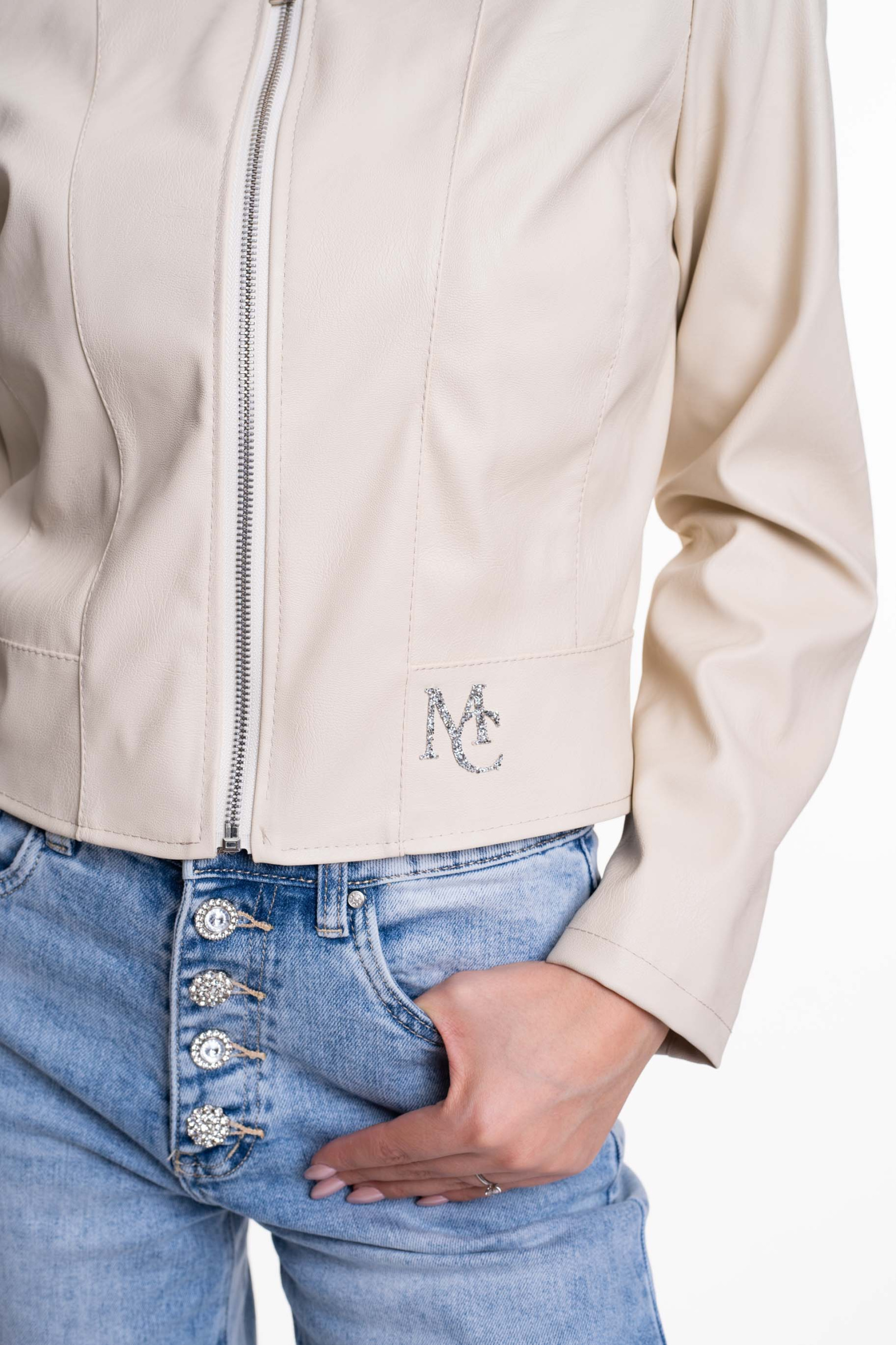 Műbőrből készült, cippzáras záródású, rövid fazonú dzseki, alján strasszos matrica nyomott márkajelzéssel.