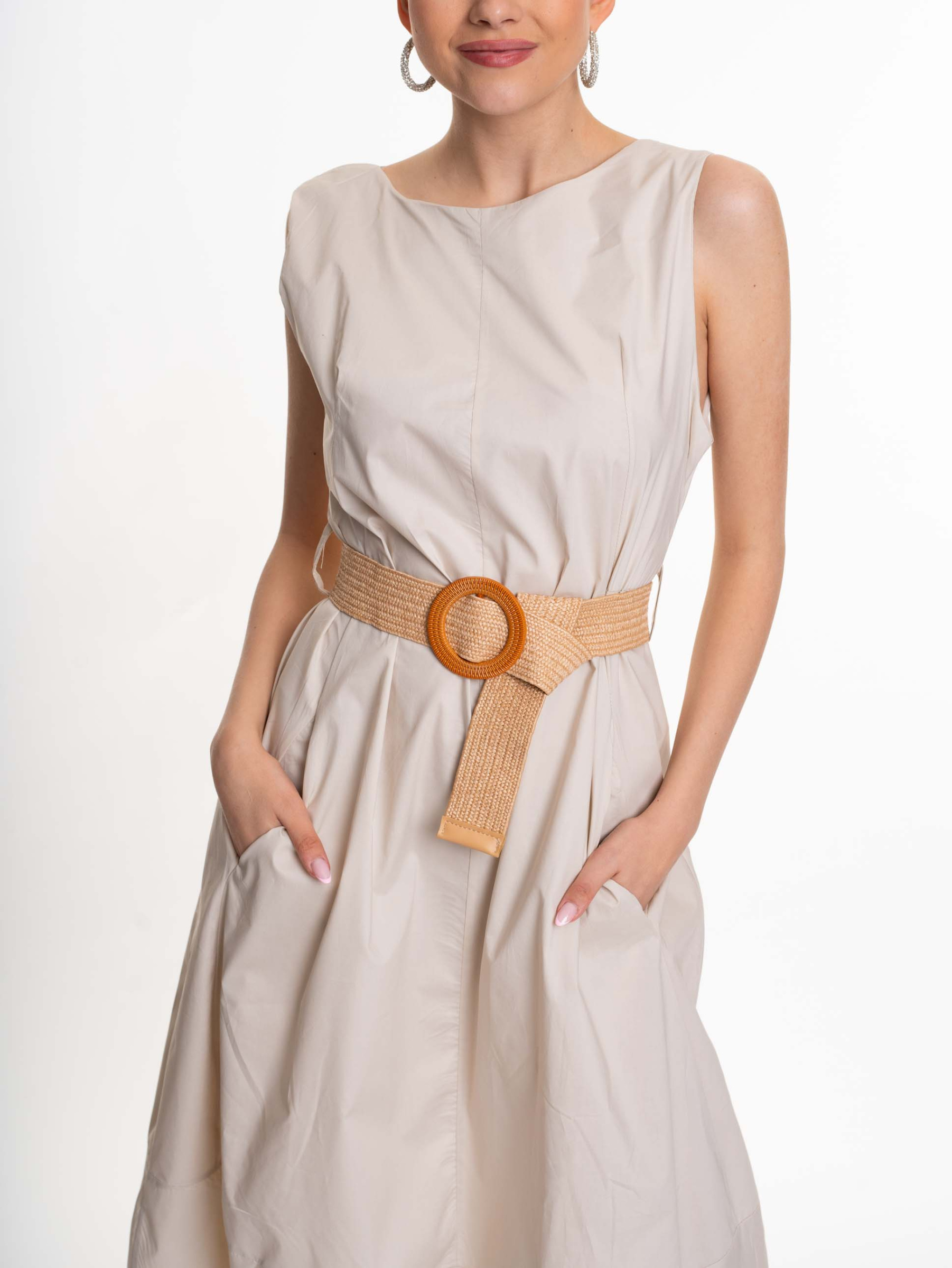 Fix anyagból készült zsebes ruha, lezser szabású alsórésszel, öv kiegészítővel, mosáshoz levehető márkajelzéssel.