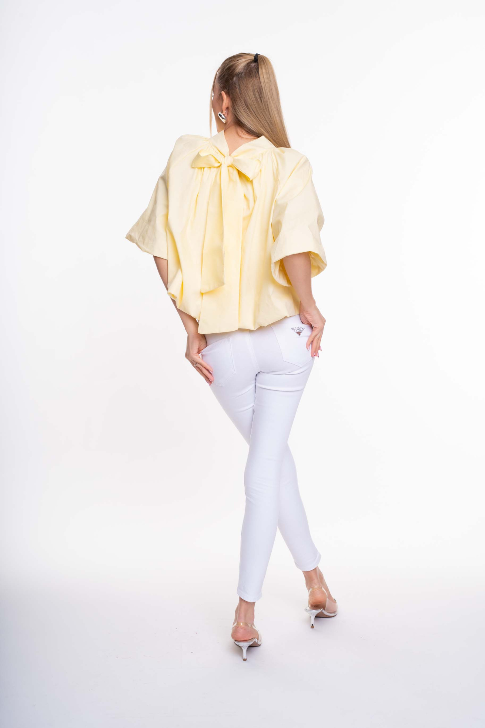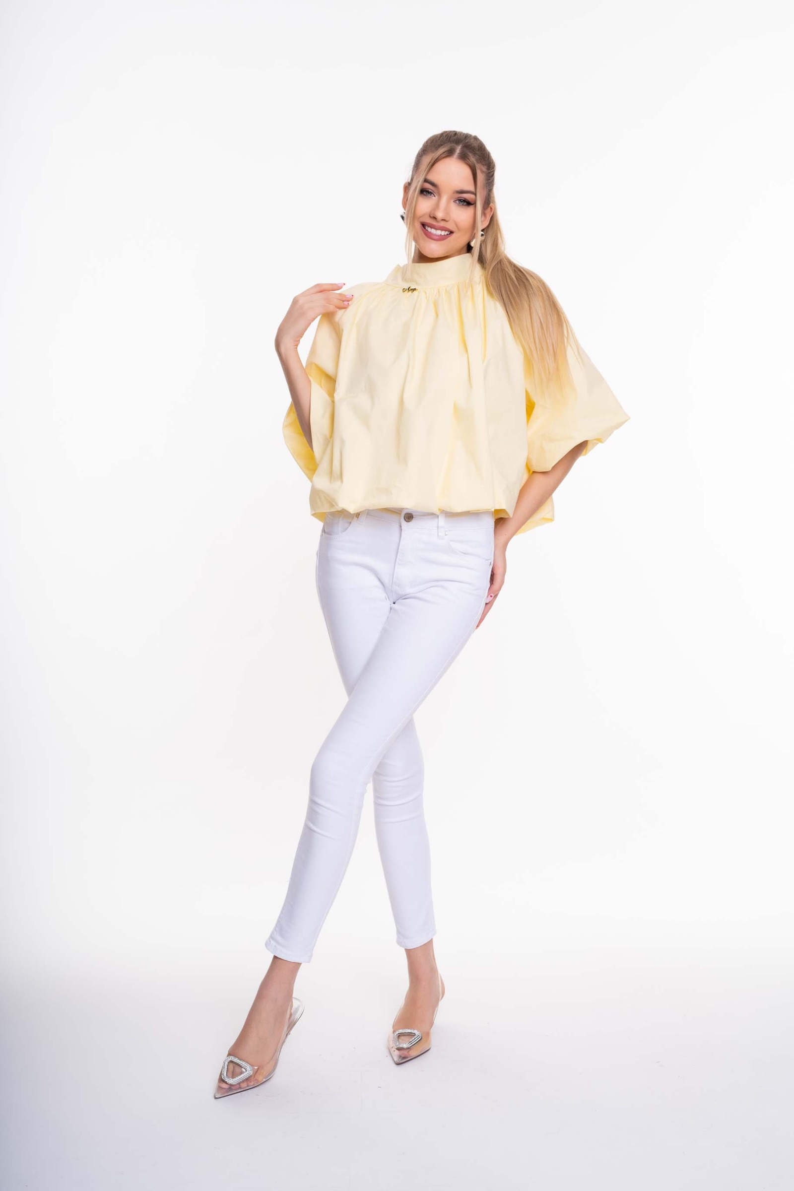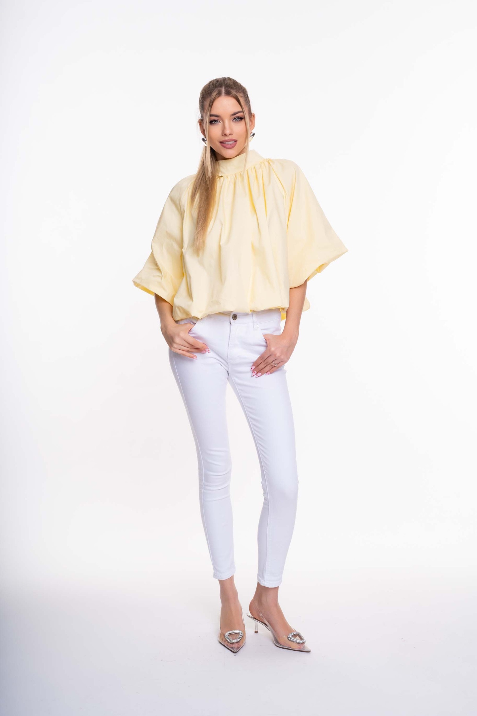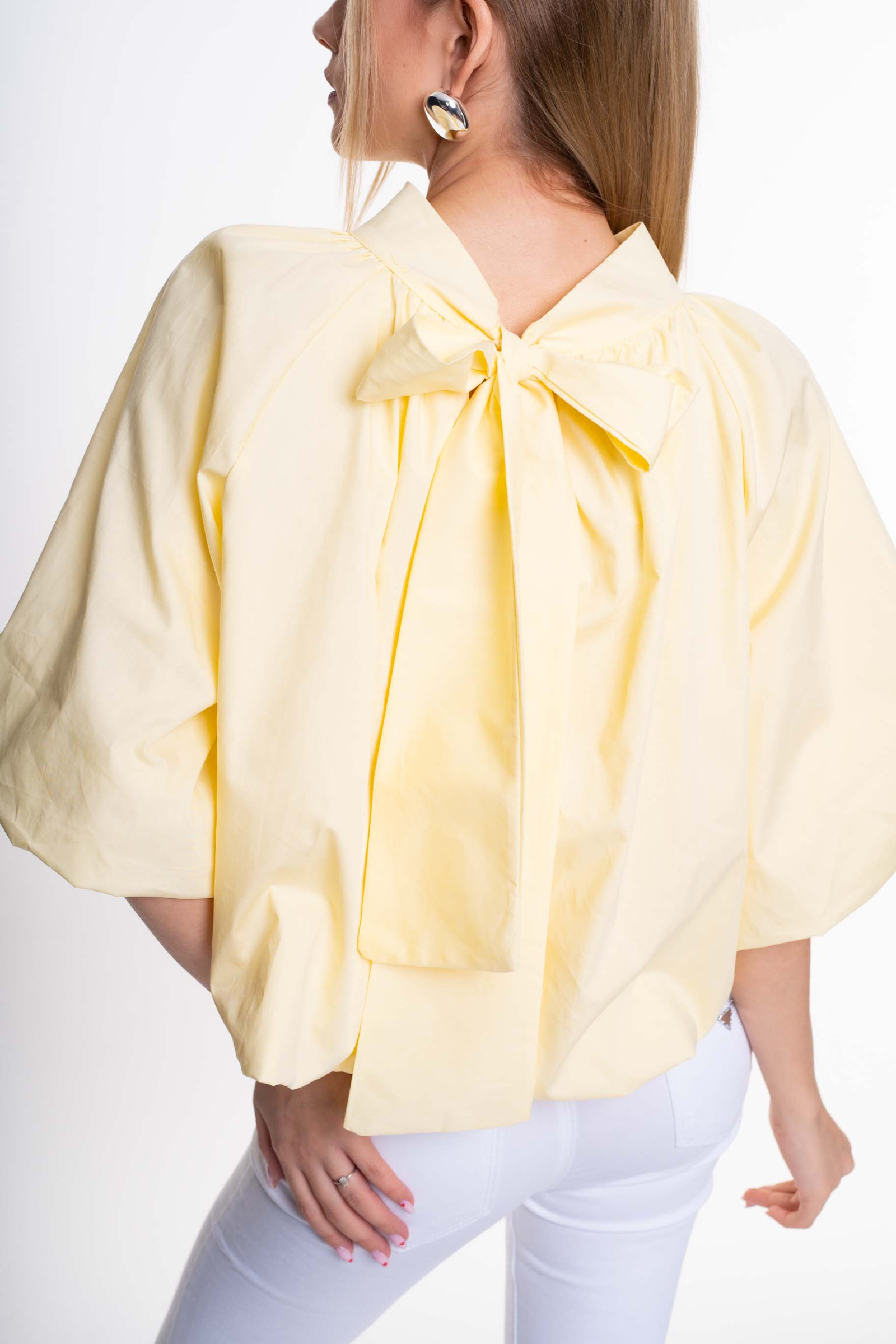 Fix puplin anyagból készült, buggyos blúz bélelővel, alján gumírozással, mosáshoz levehető kis fém márkajelzéssel.