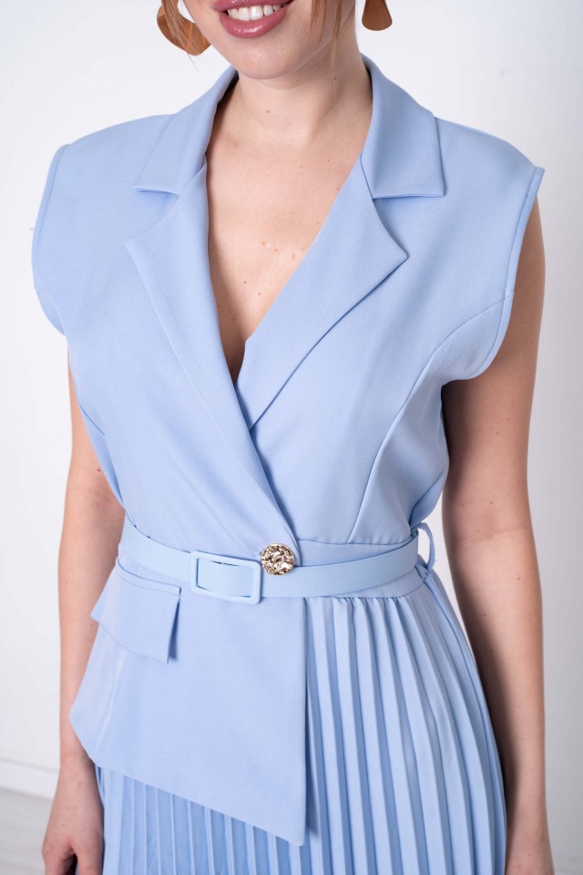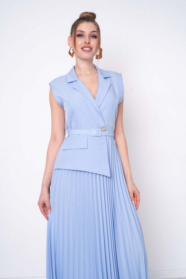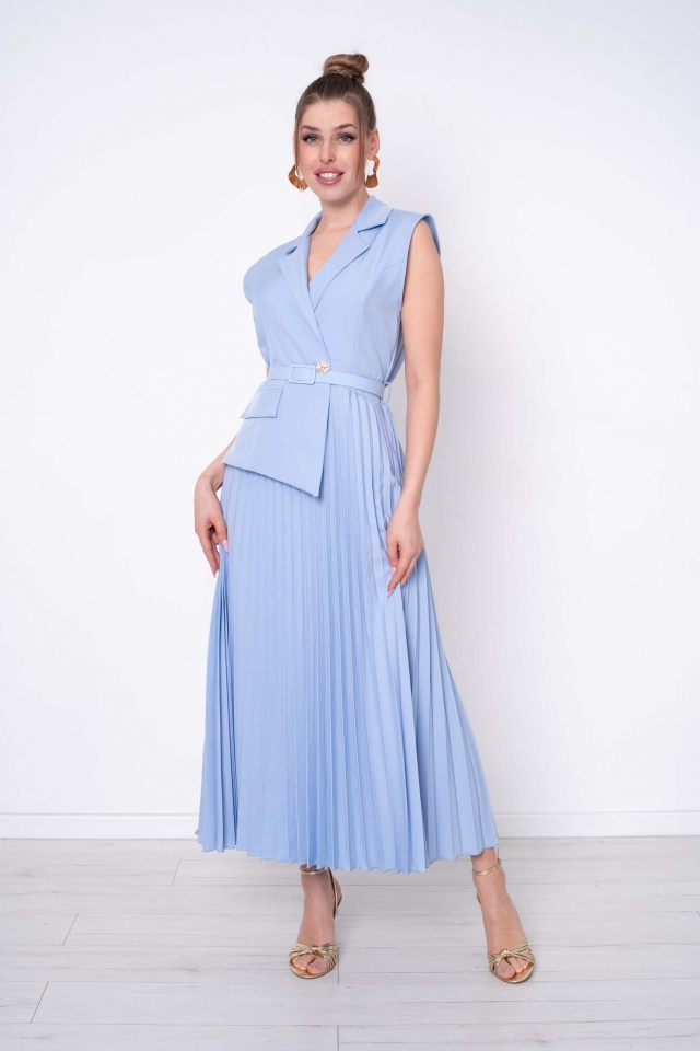 Enyhén elasztikus anyagból készült ruha plisszírozott szoknyarésszel, aszimmetrikus eleje szabásvonallal, gumírozott derekán öv kiegészítővel, levehető fém bross márkajelzéssel.