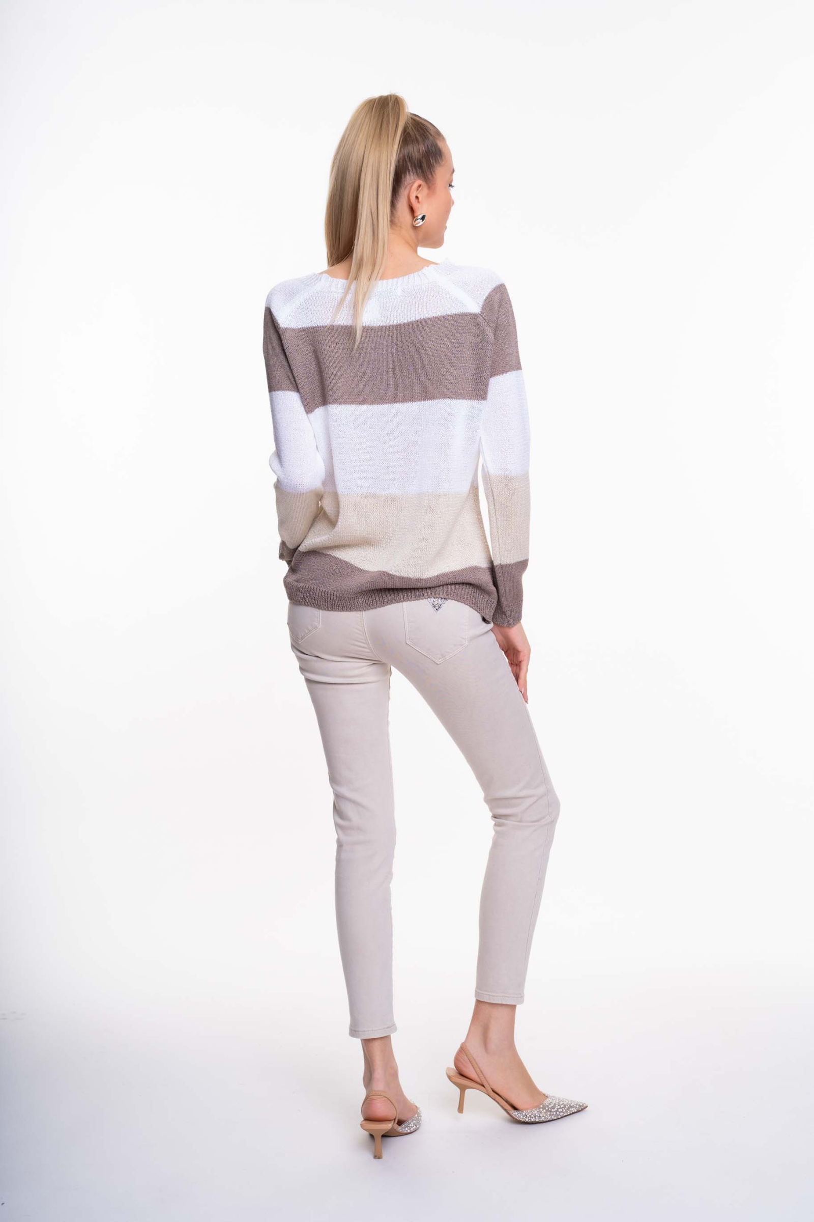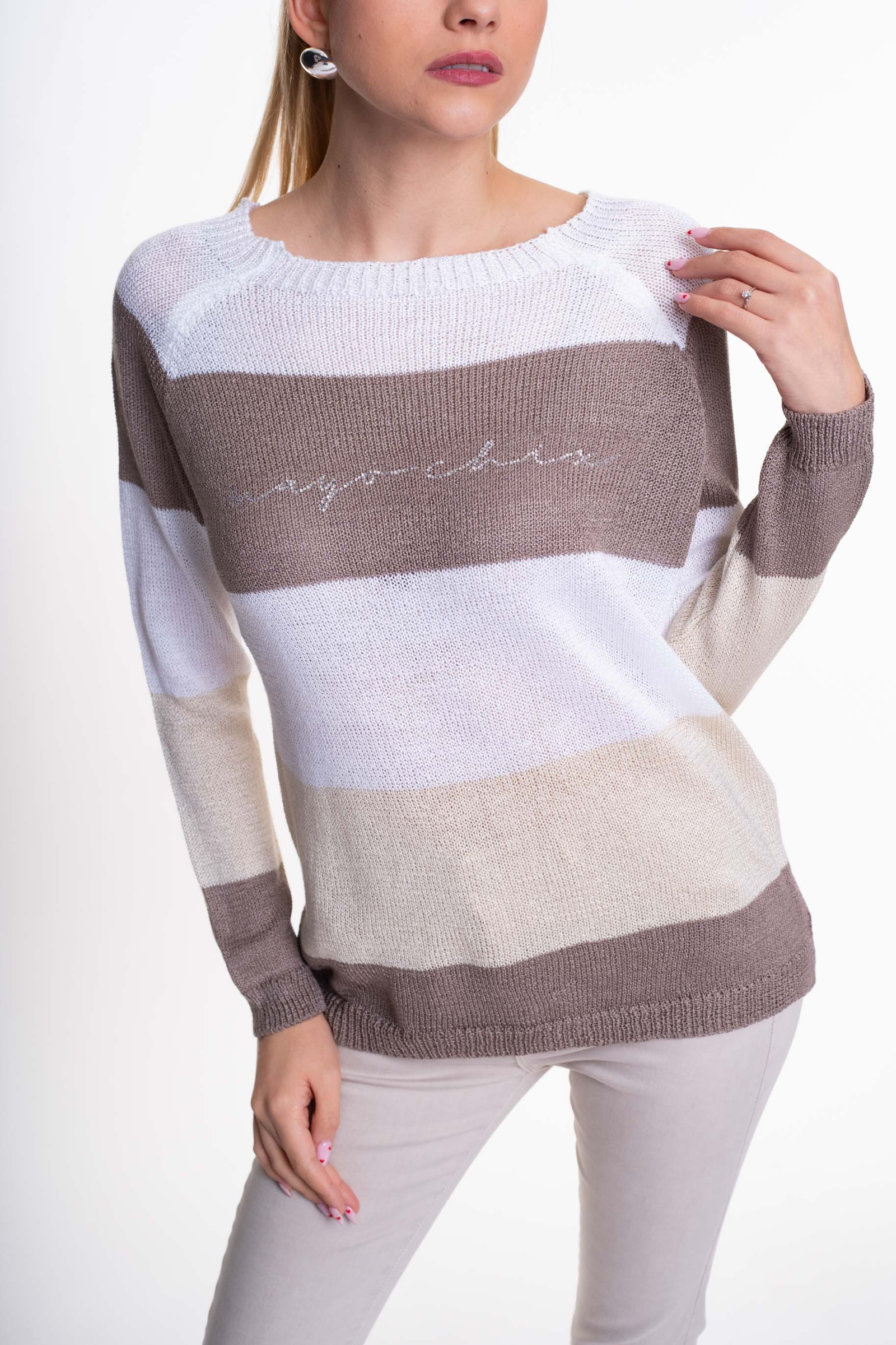 Vékony kötött anyagú, lezser szabásvonalú pulóver, strasszköves márkajelzéssel.