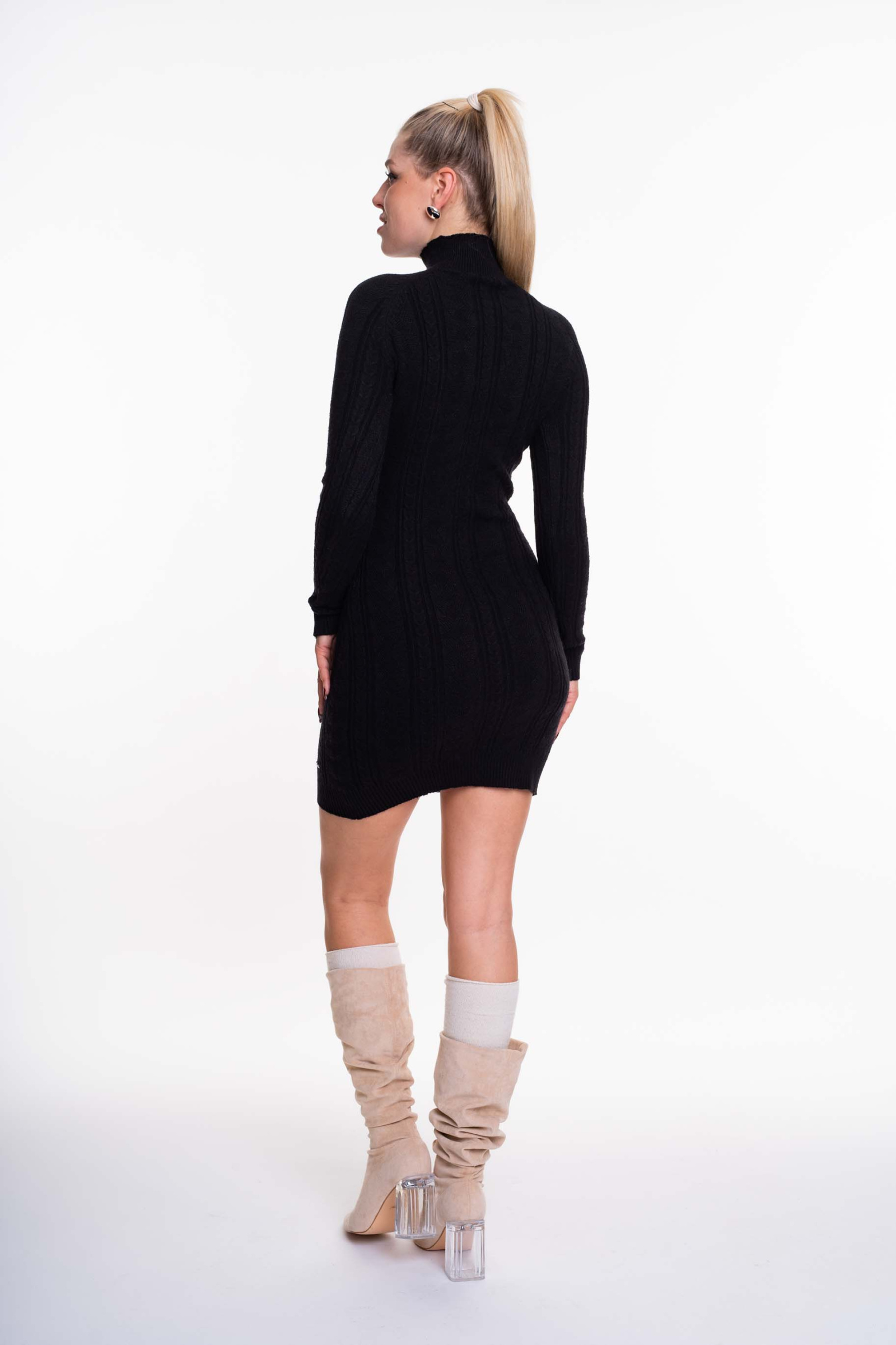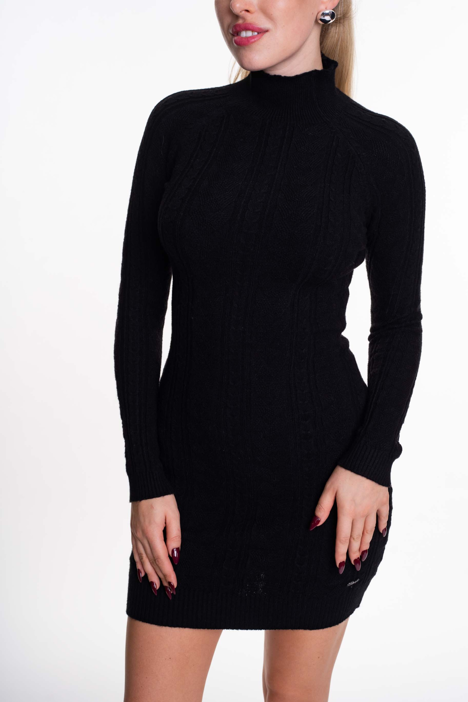 Fonott mintás, elasztikus kötött anyagból készült raglán ujjú ruha emelt nyakrésszel, kis fém márkajelzéssel.