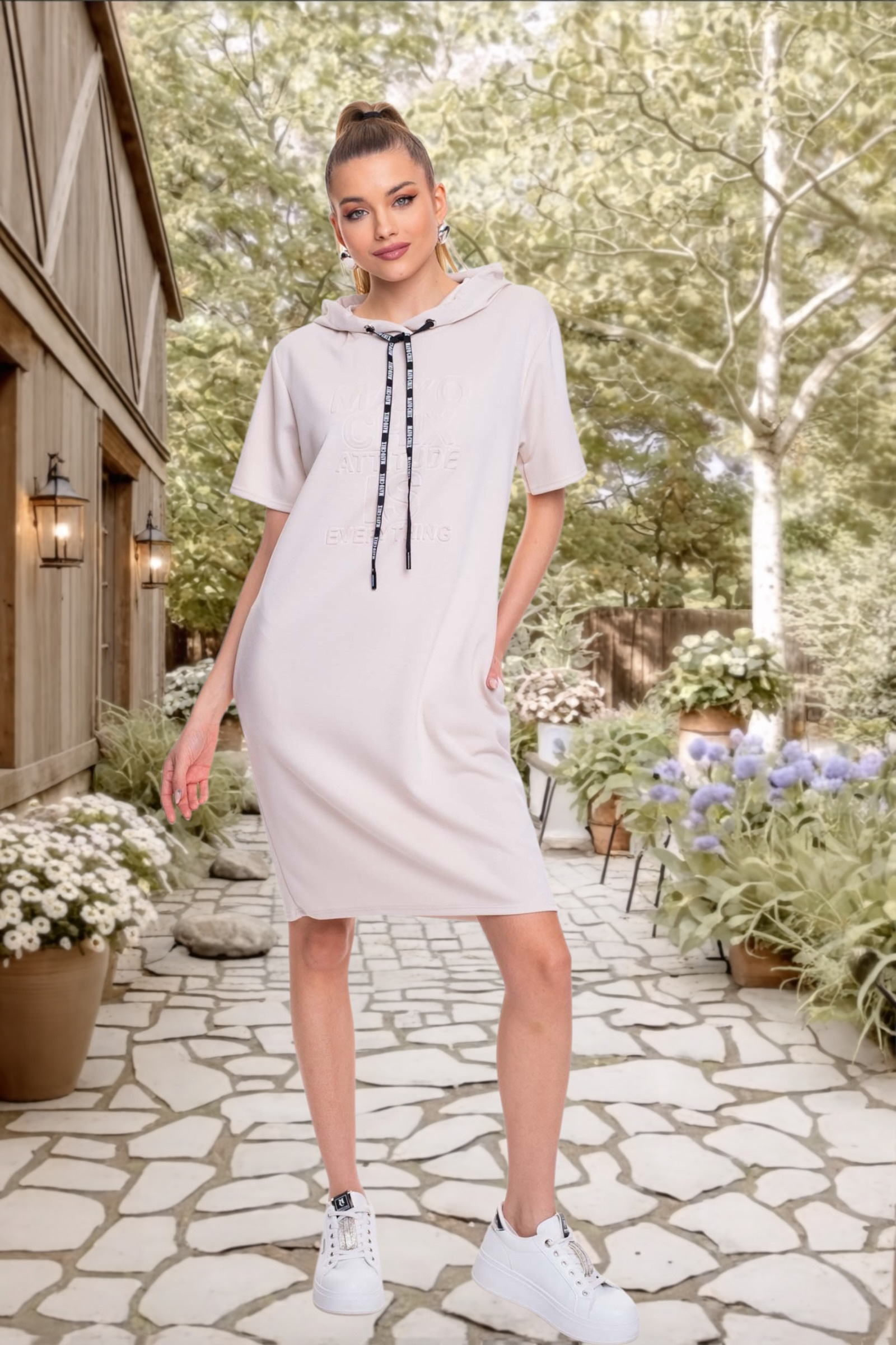 Elasztikus anyagból készült zsebes ruha kapucnival, márka jelzett behúzóval, dombor nyomott díszitéssel.