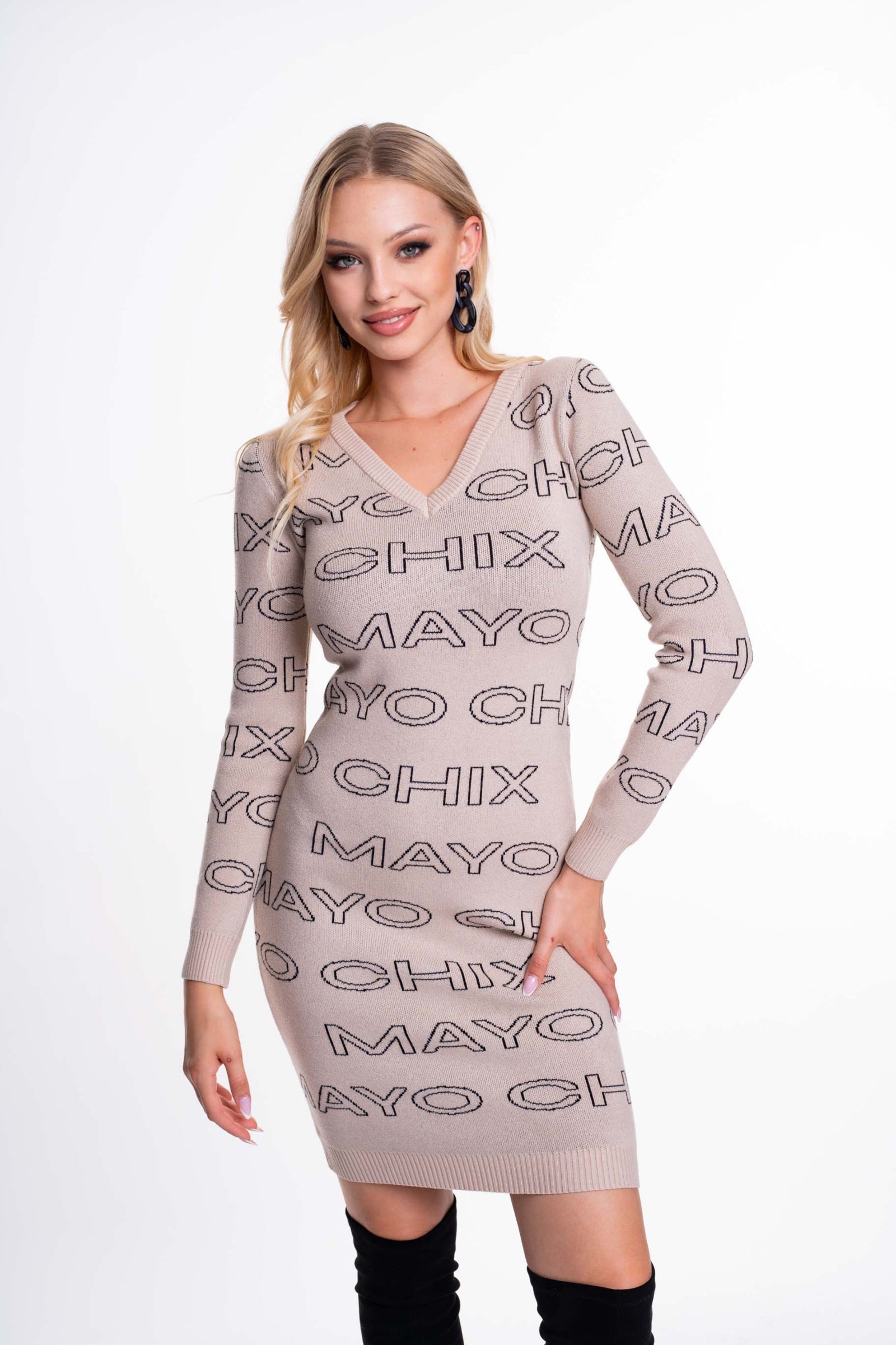 Puha, kötött anyagú, karcsúsított fazonú ruha bordás passzéval, anyagában kötött mintával és márkajelzéssel.