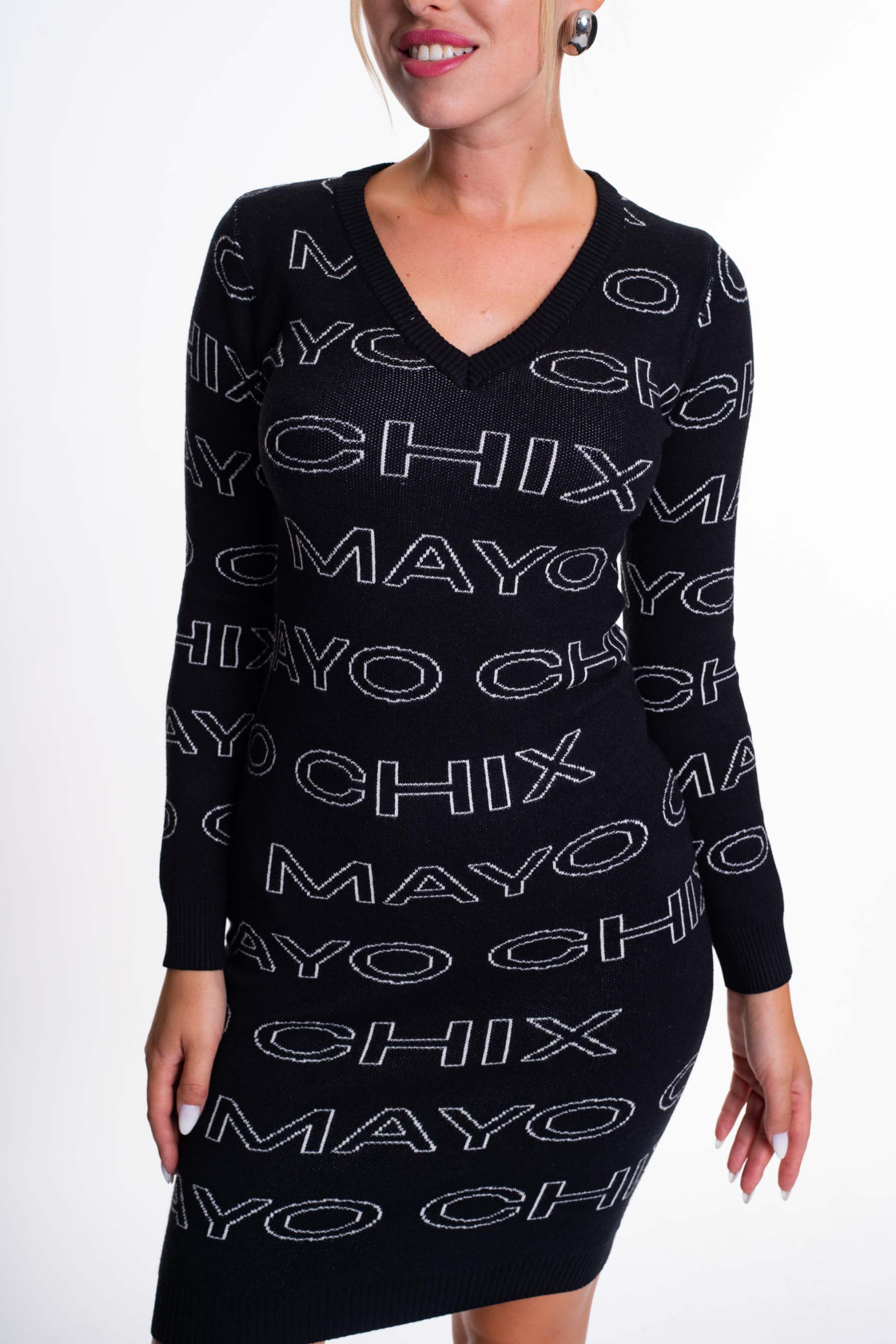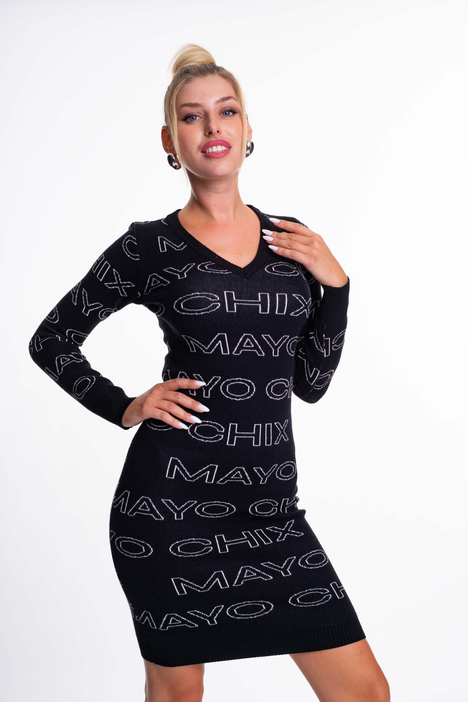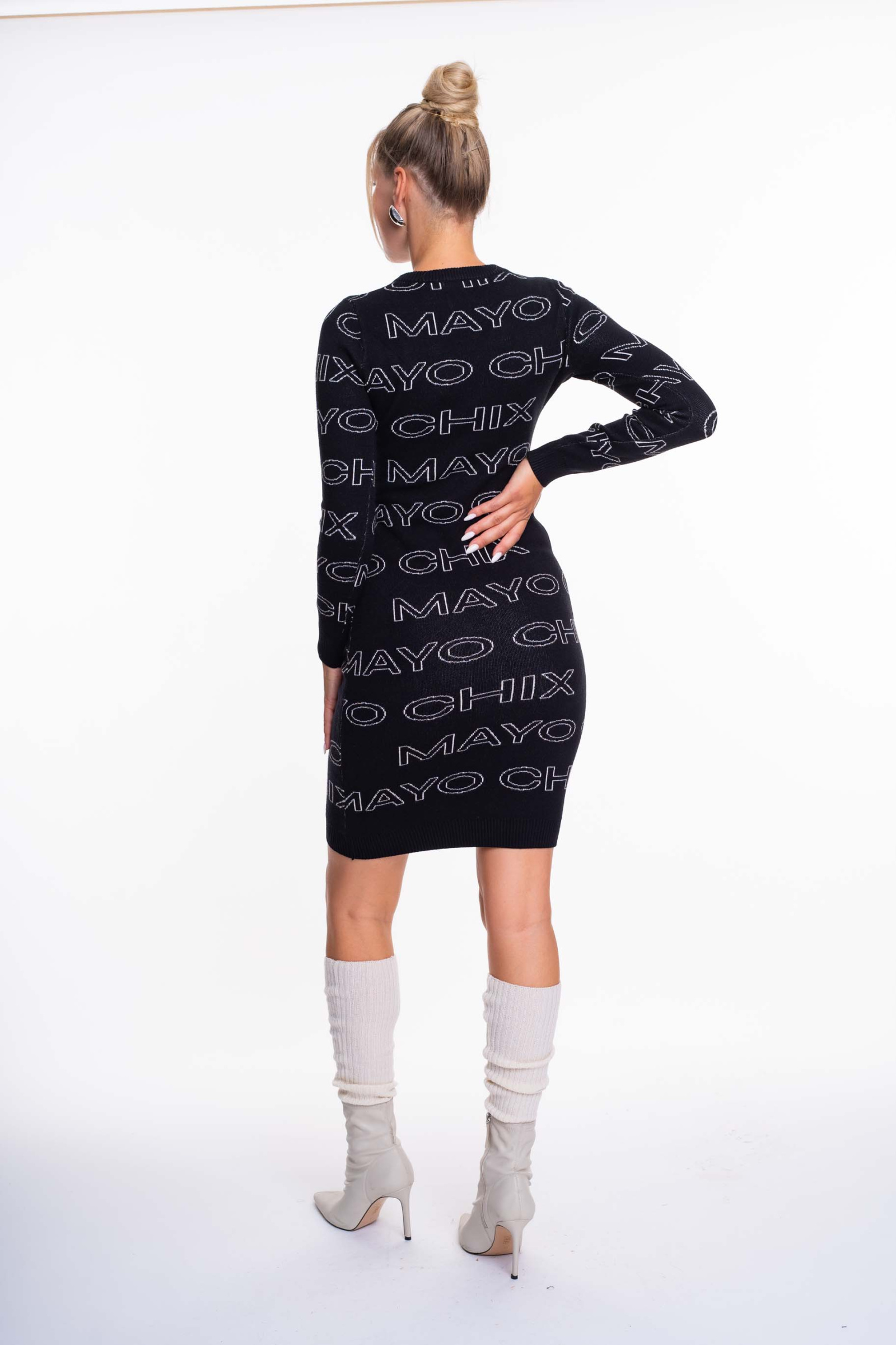 Puha, kötött anyagú, karcsúsított fazonú ruha bordás passzéval, anyagában kötött mintával és márkajelzéssel.