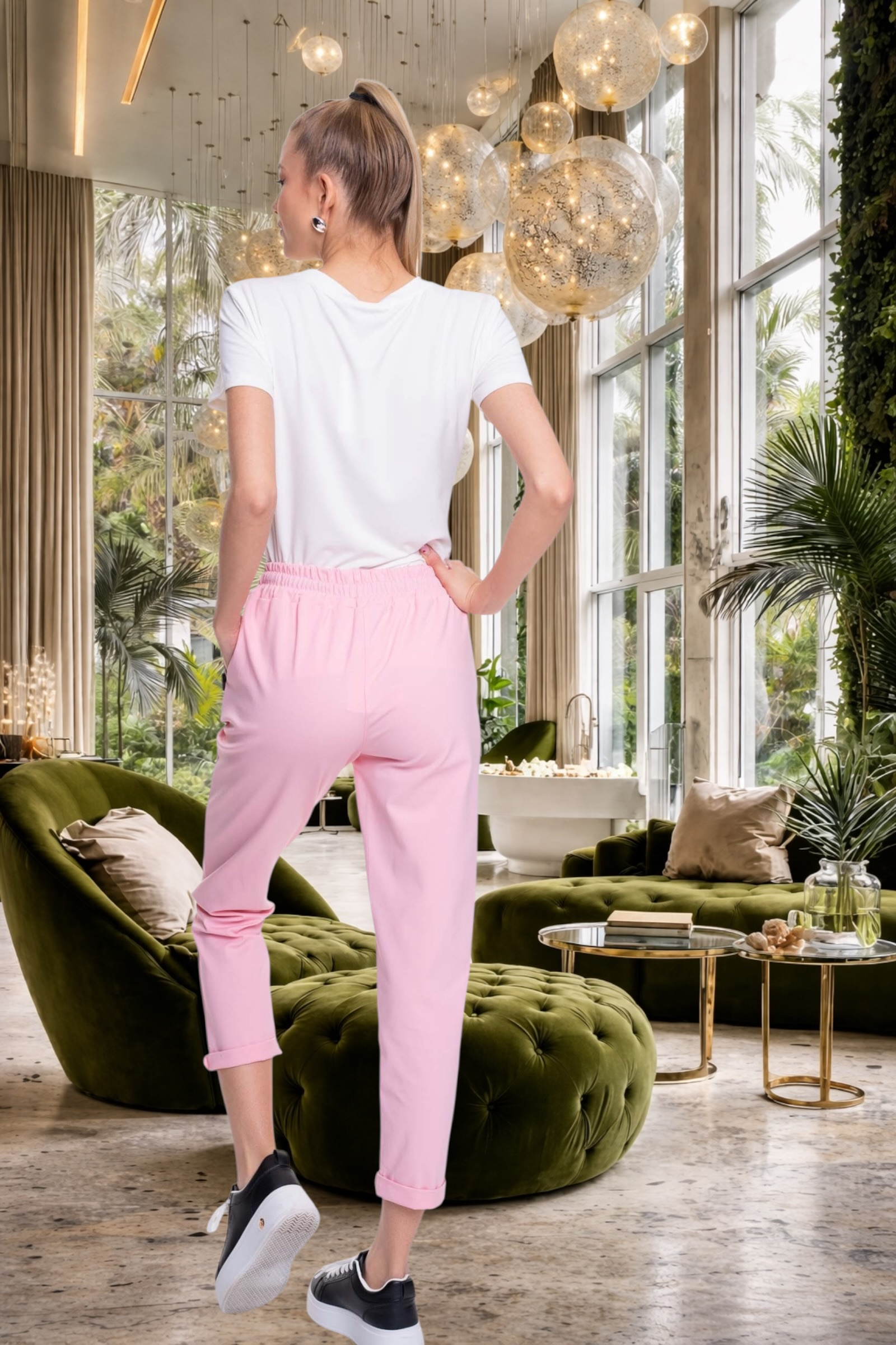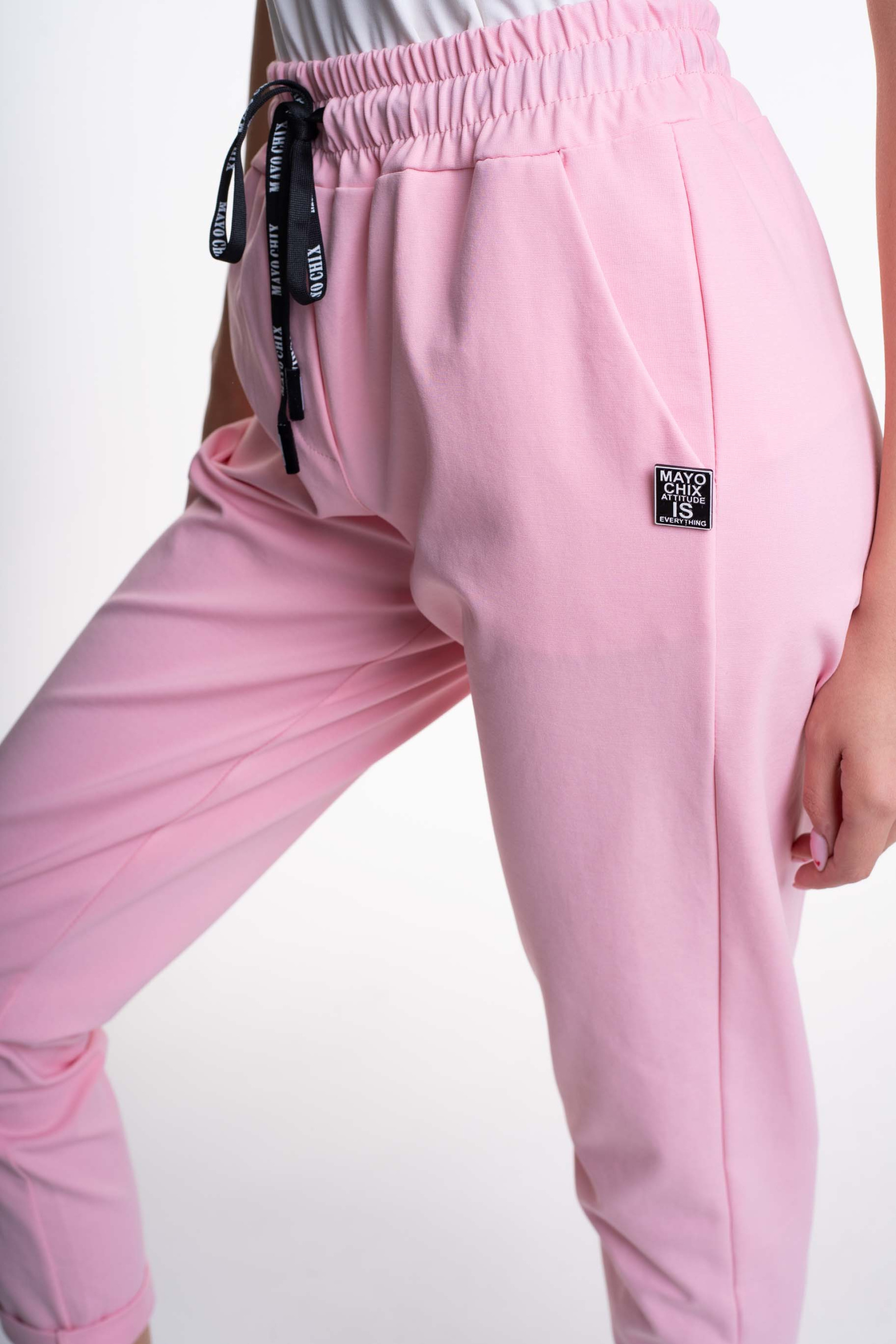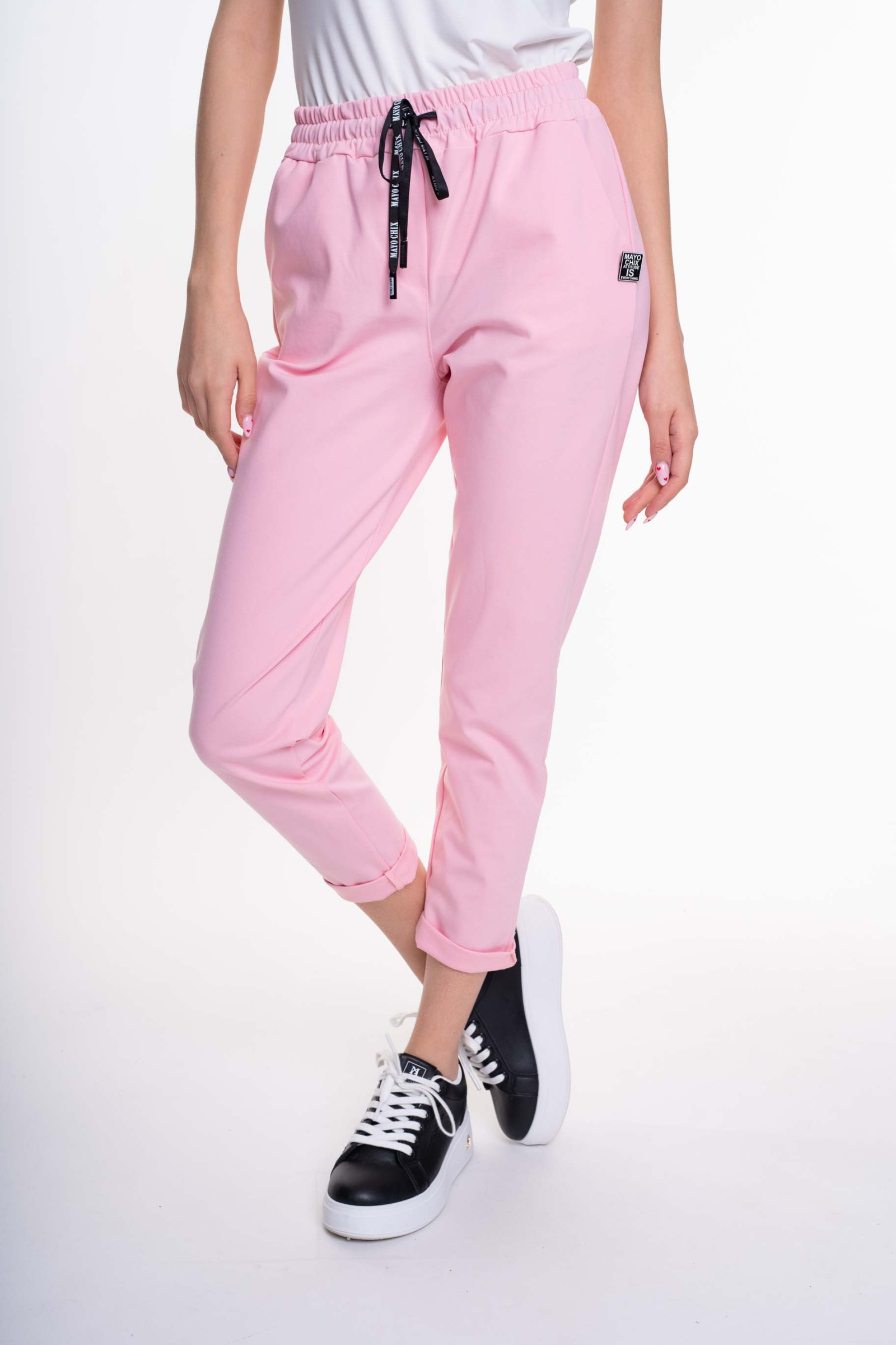 Elasztikus anyagból készült, svéd zsebes nadrág, gumis derékrésszel, márka jelzett megkötővel és bross kiegészítővel.