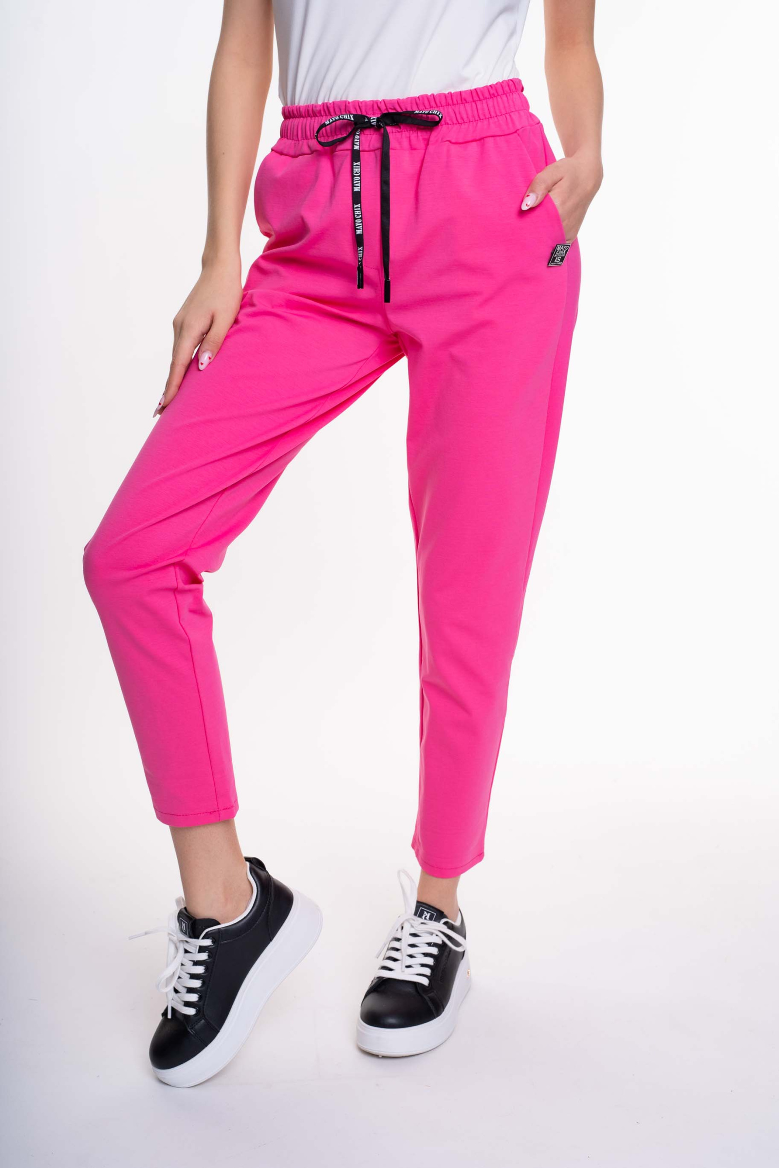 Elasztikus anyagból készült, svéd zsebes nadrág, gumis derékrésszel, márka jelzett megkötővel és bross kiegészítővel.