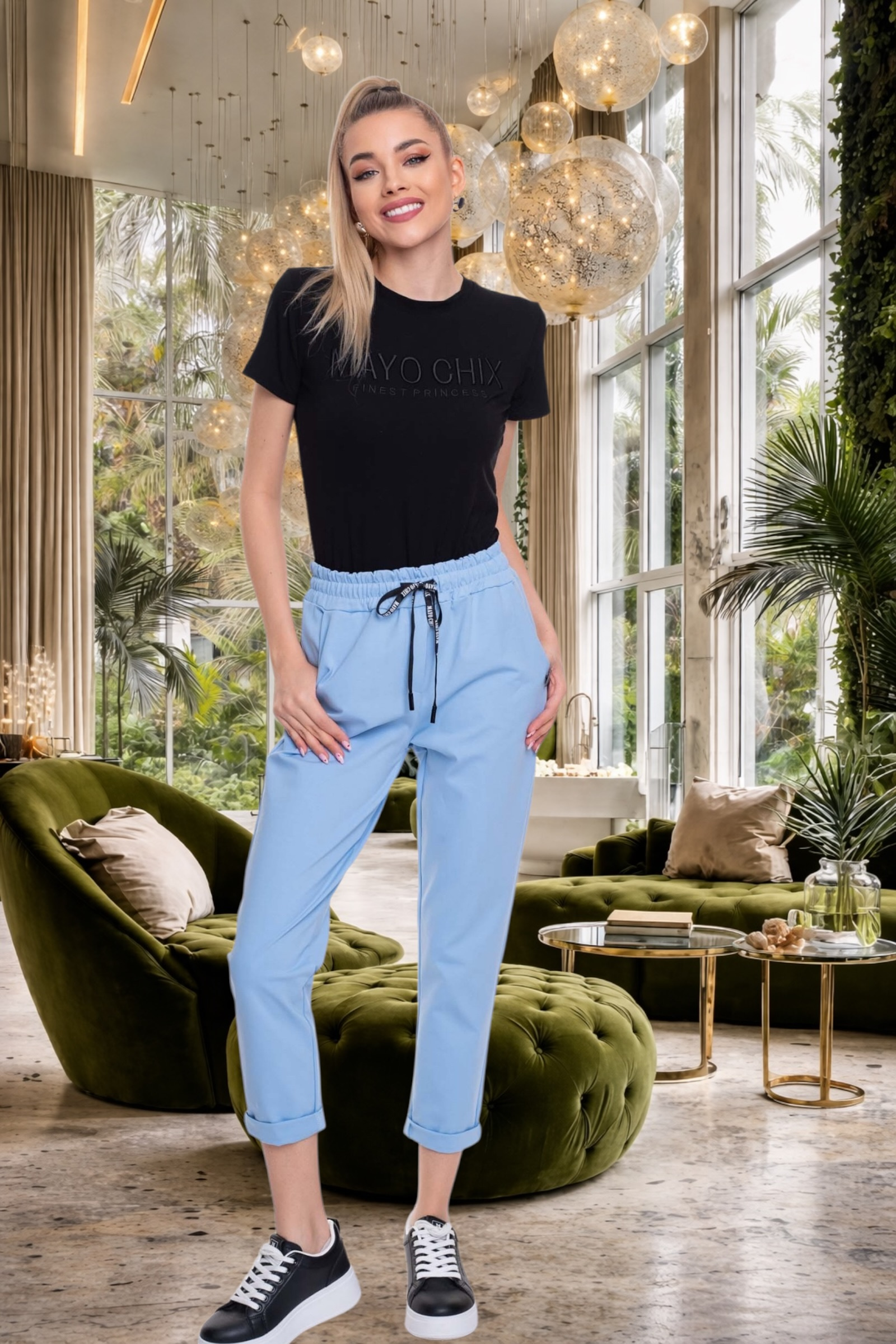 Elasztikus anyagból készült, svéd zsebes nadrág, gumis derékrésszel, márka jelzett megkötővel és bross kiegészítővel.