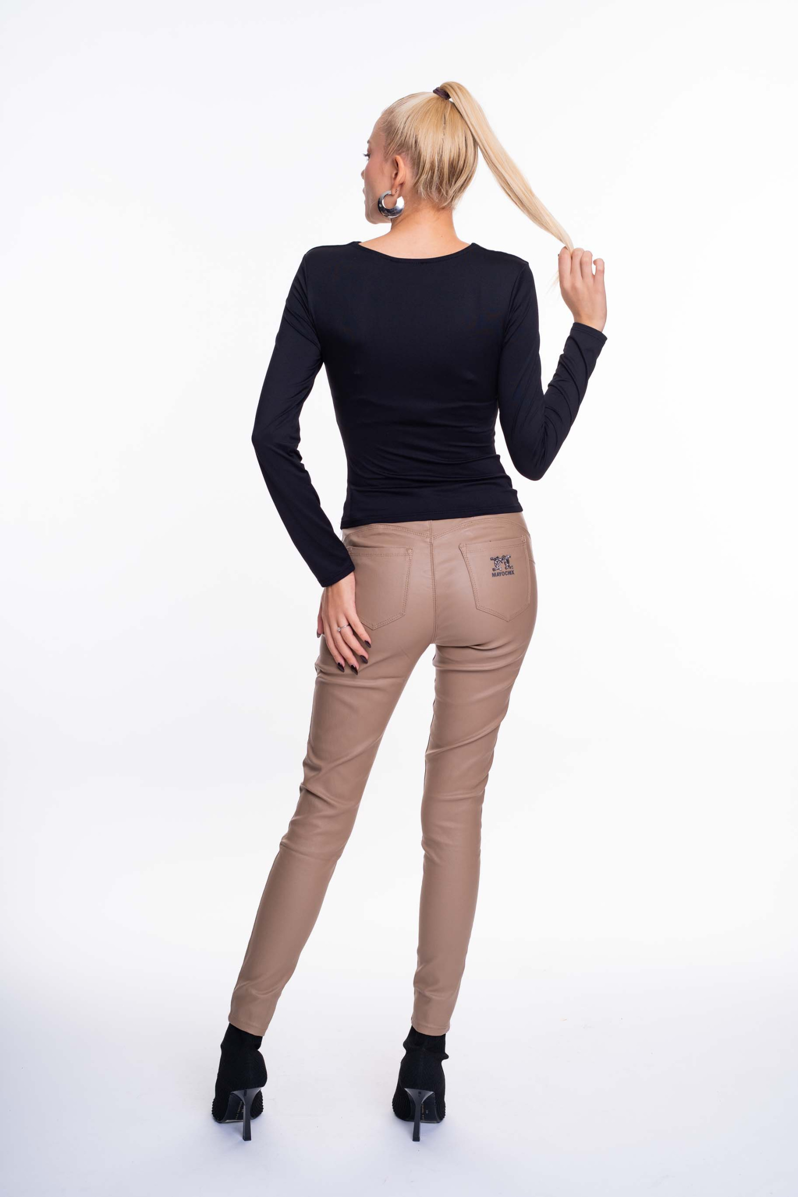 Elasztikus anyagból készült, karcsúsított fazonú felső, mellrészen bélelővel és fém díszítéssel, kis fém márkajelzéssel.
