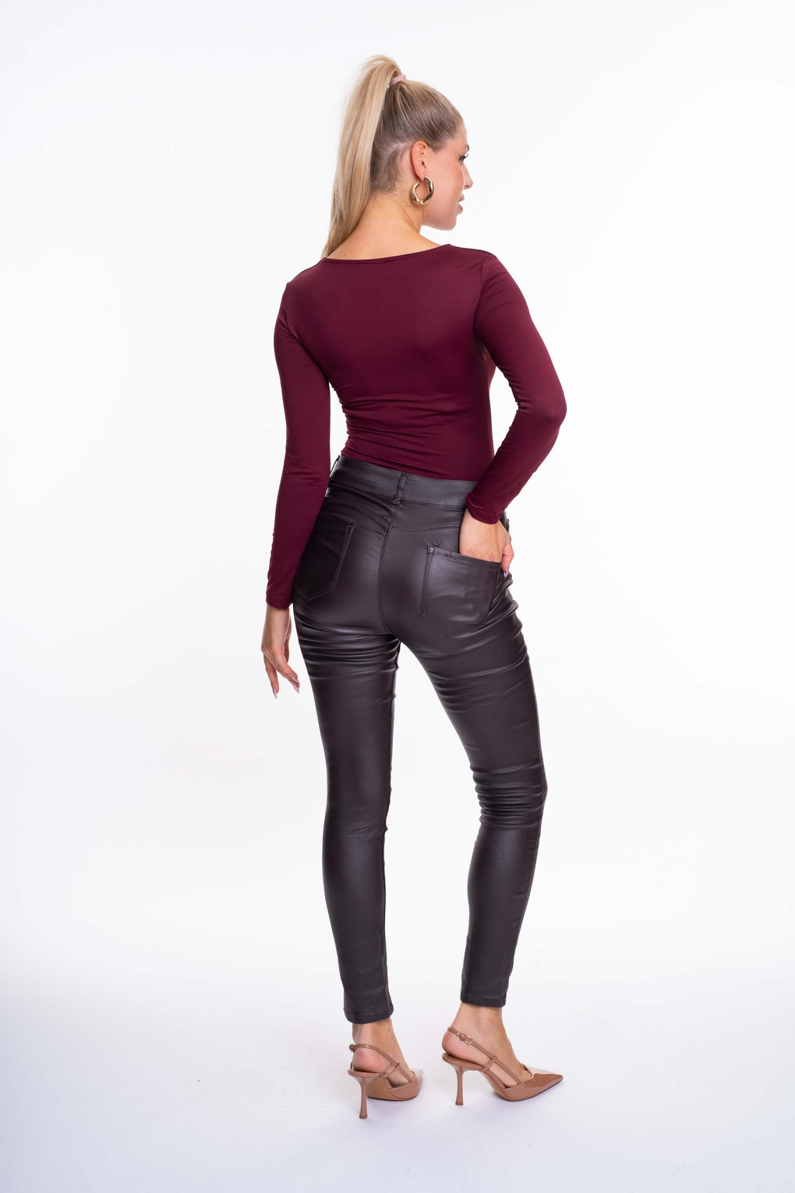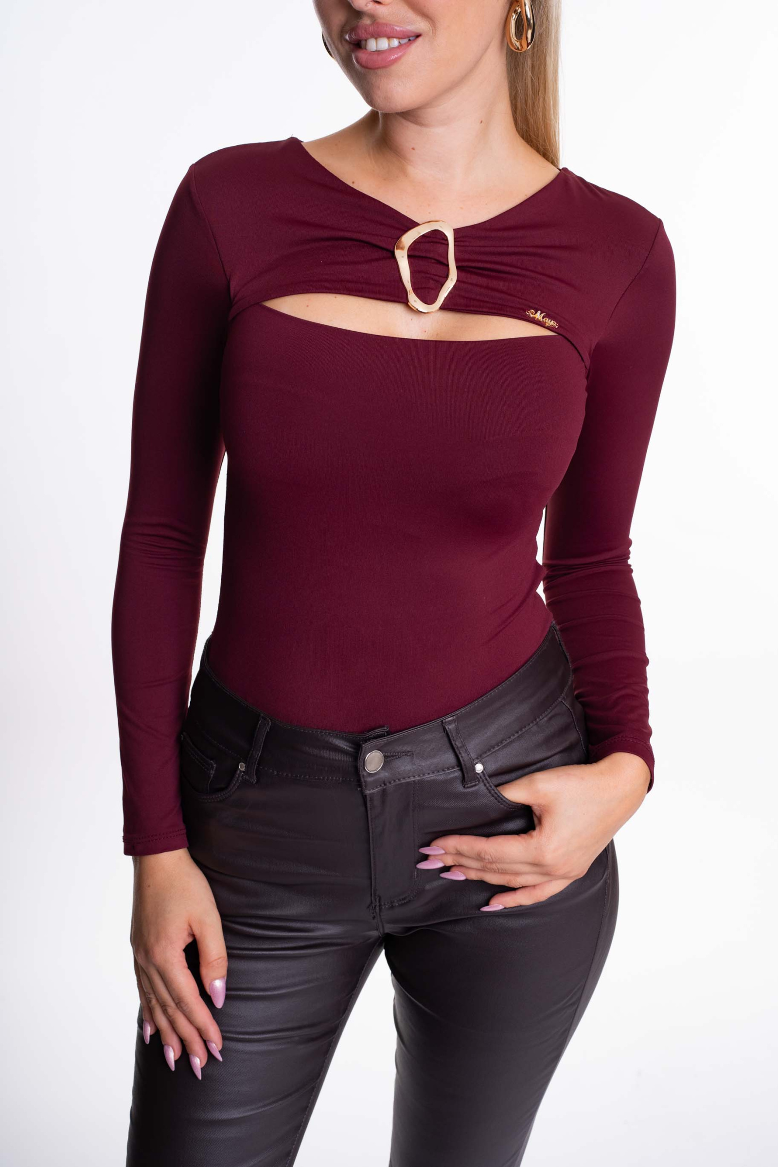 Elasztikus anyagból készült, karcsúsított fazonú felső, mellrészen bélelővel és fém díszítéssel, kis fém márkajelzéssel.