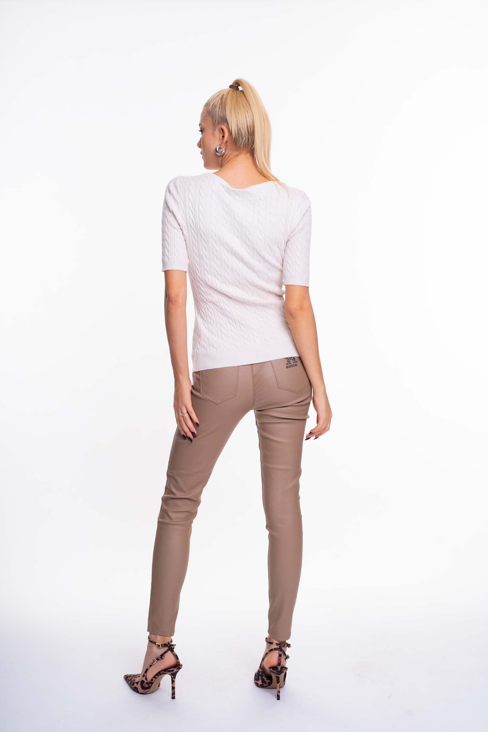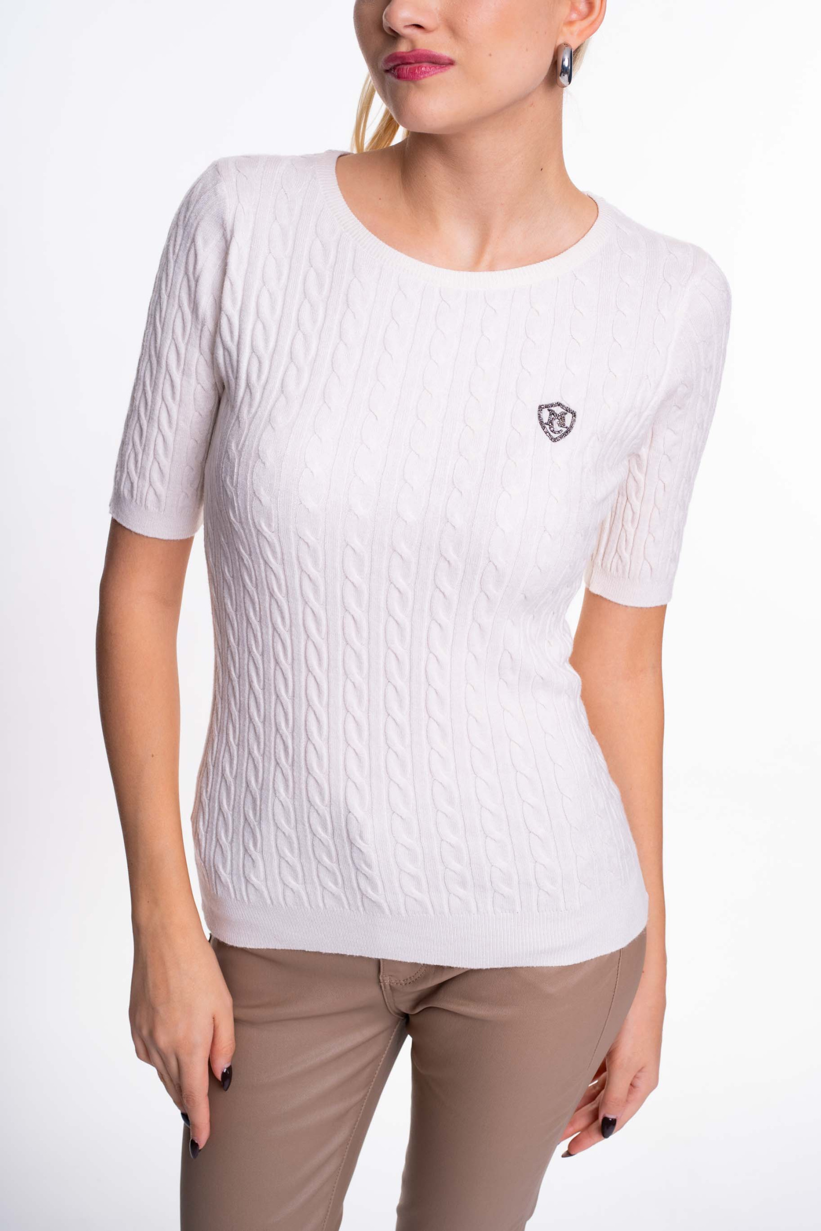 Vékony kötött anyagú pulóver, anyagában kötött fonott mintával, strasszköves matrica nyomott márkajelzéssel.