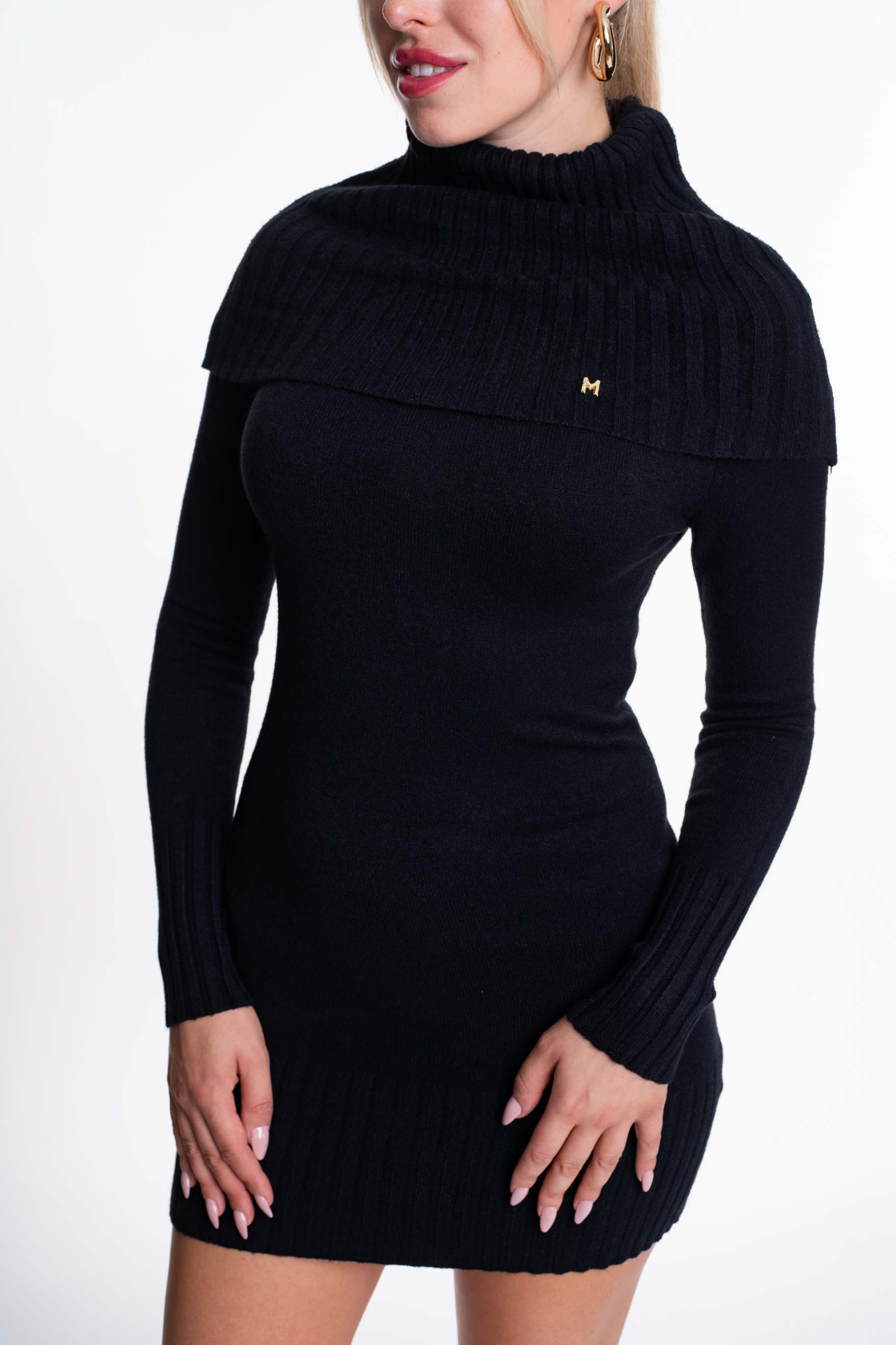 Vékony kötött anyagú, zsabós ruha, bordás passzékkal, mosáshoz levehető fém bross márkajelzéssel.