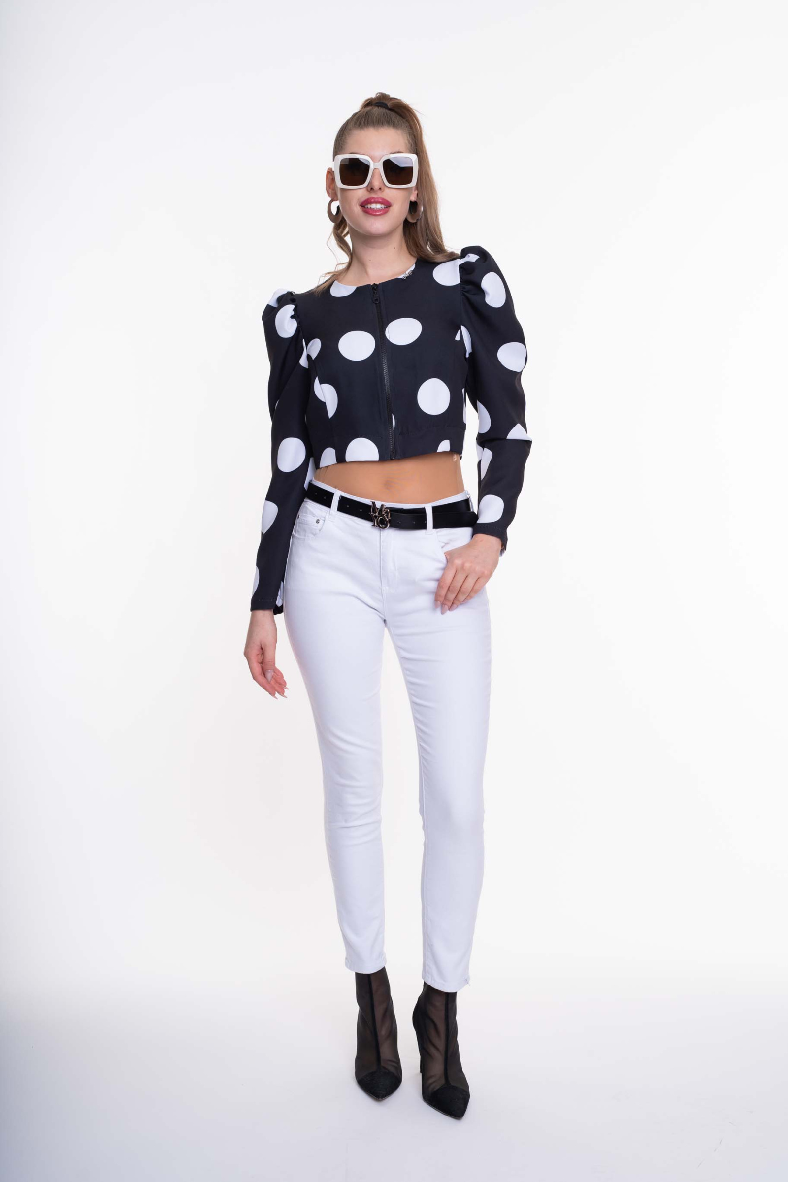 Enyhén elasztikus anyagból készült, rövid fazonú blézer cippzáras záródással, buggyos vállakkal, kis fém márkajelzéssel.