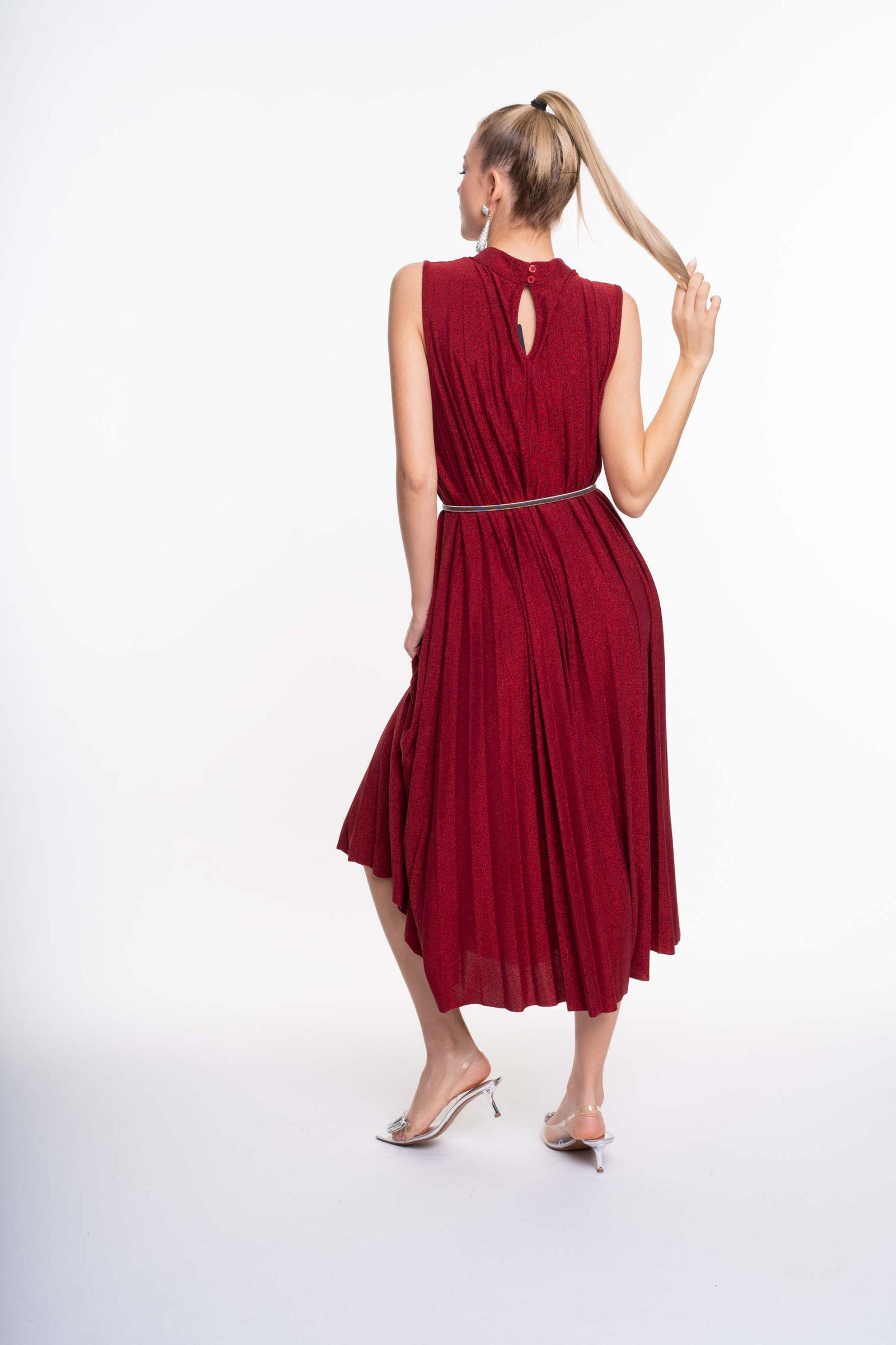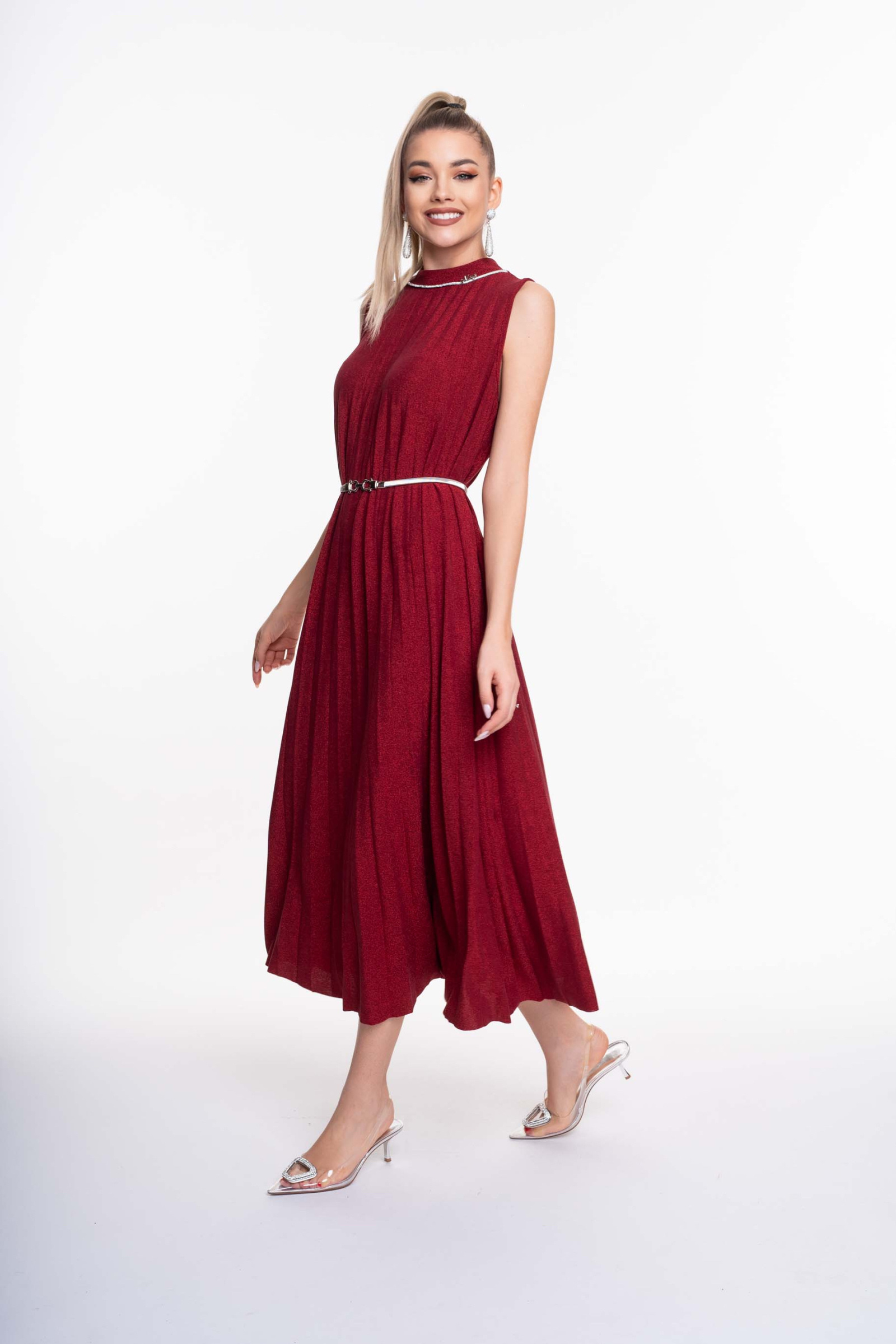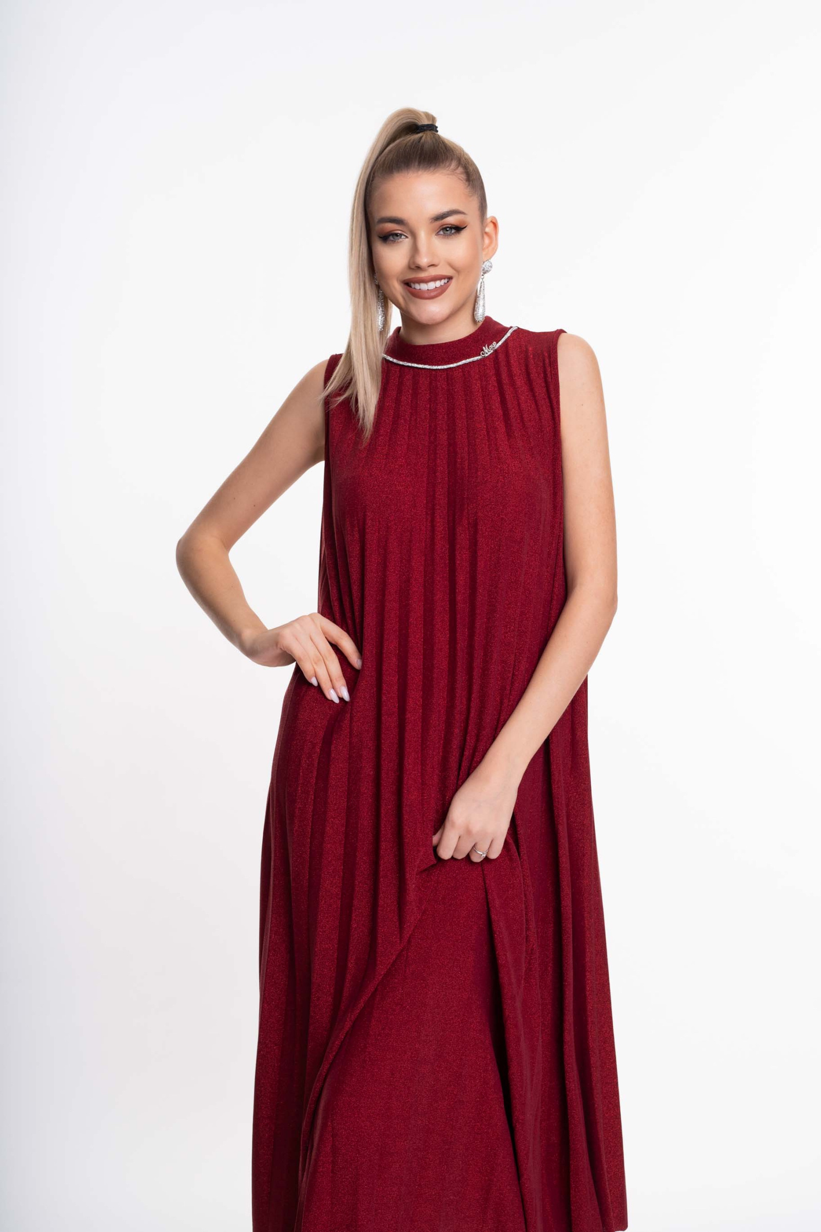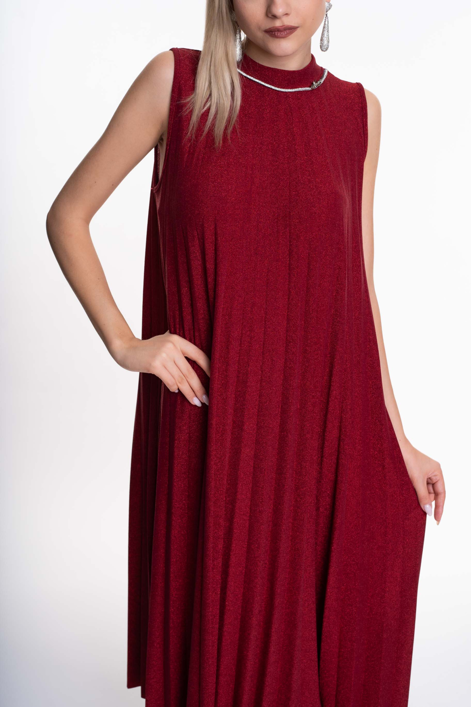 Elasztikus alkalmi anyagból készült, A vonalú ruha, nyakrészen strasszköves díszítéssel, fém bross márkajelzéssel.