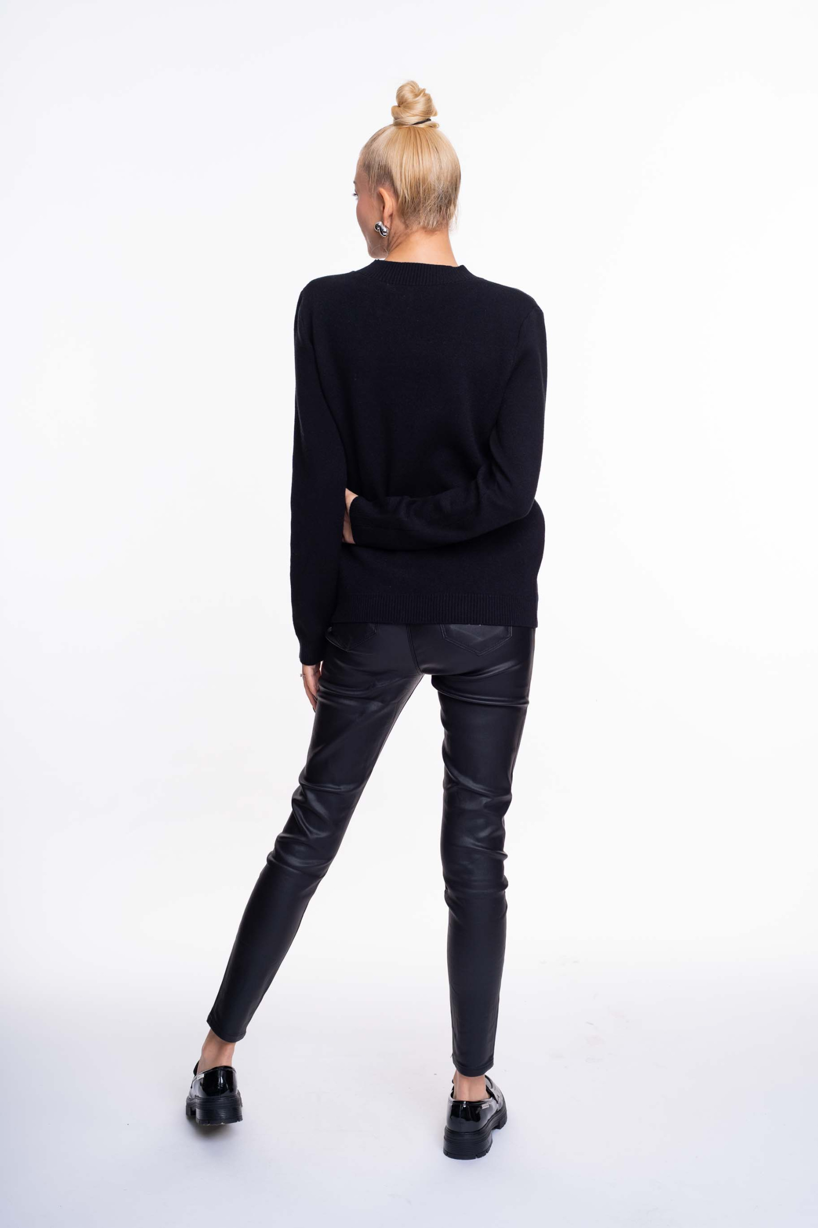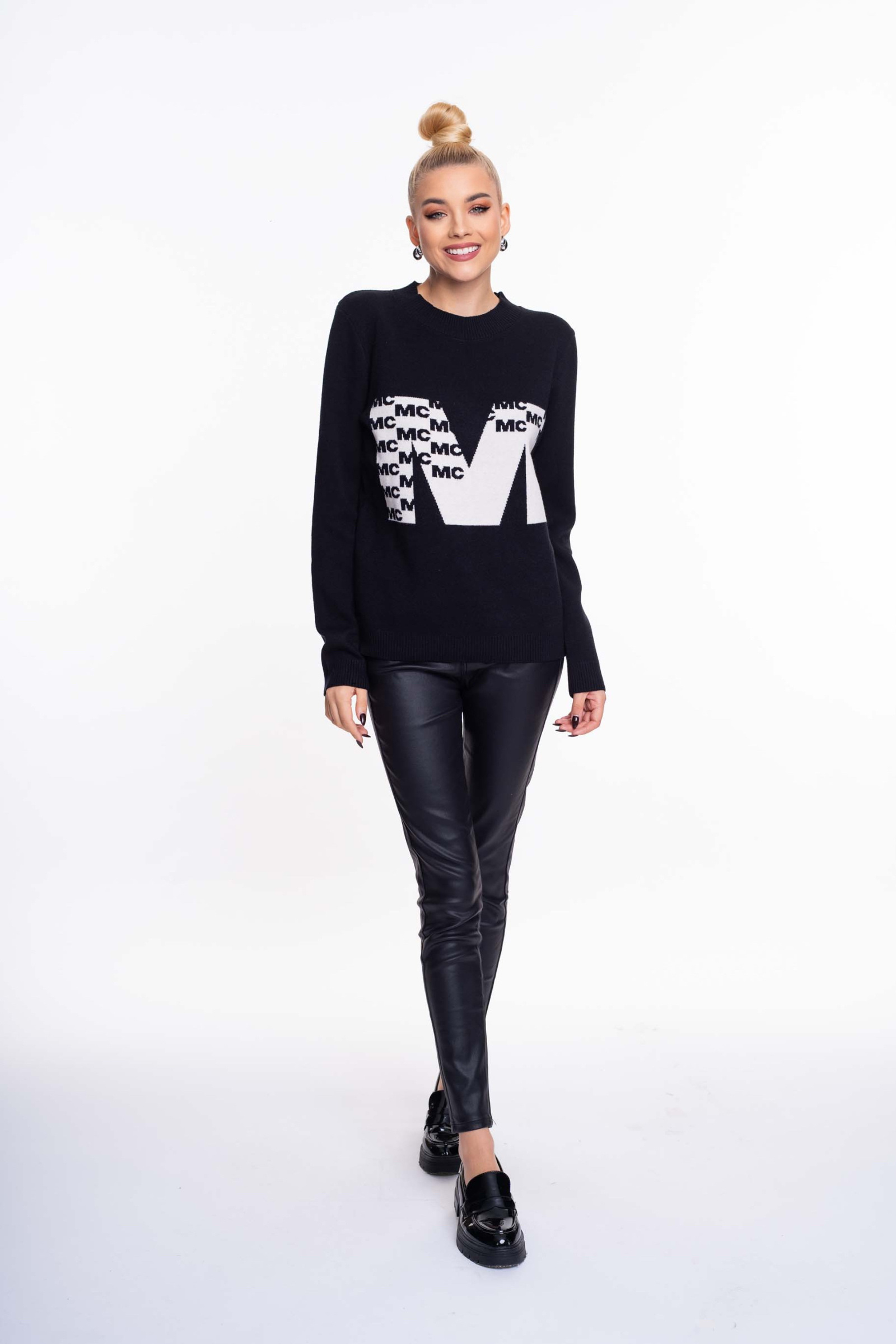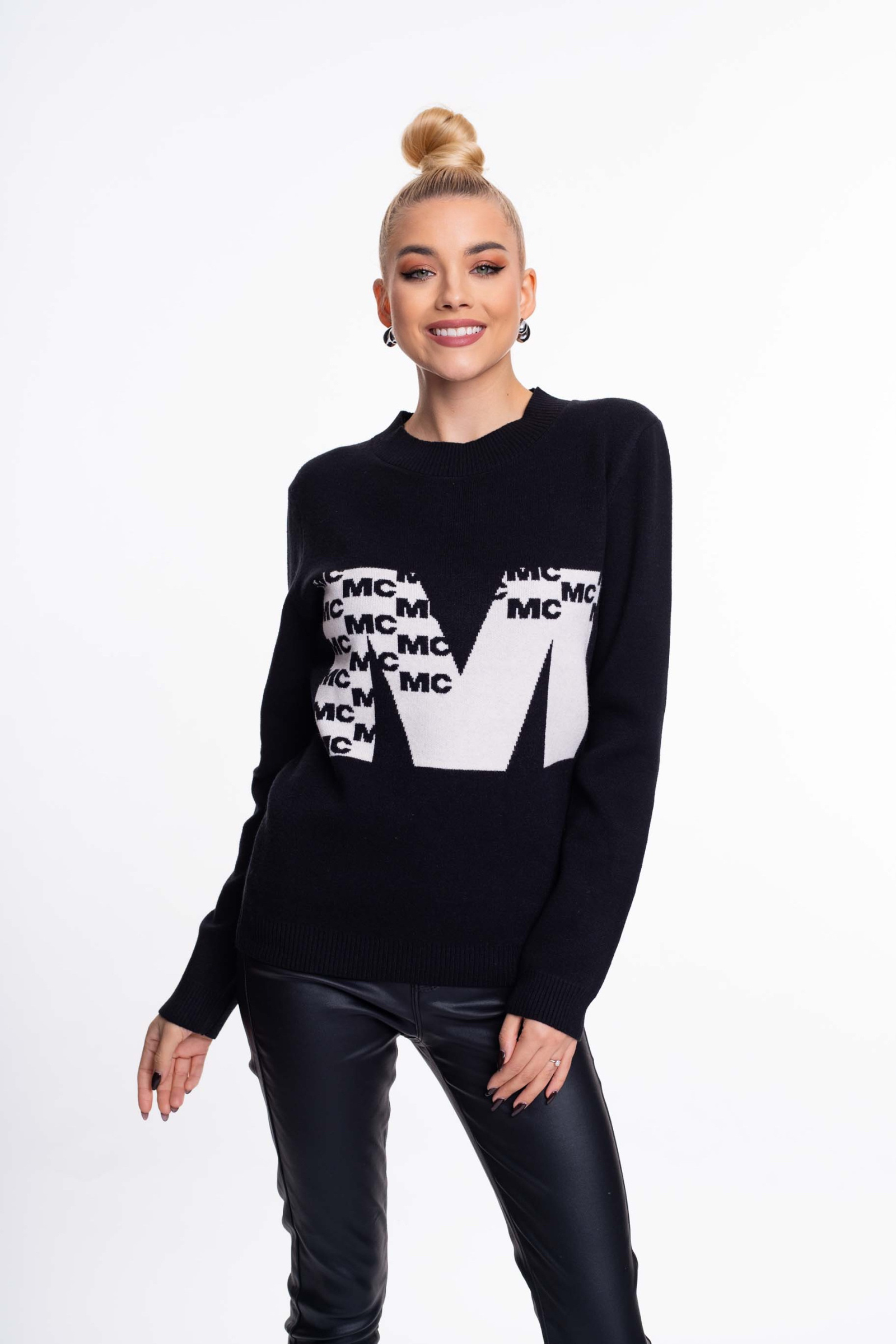 Puha, kötött anyagból készült, lezser szabásvonalú pulóver, anyagában kötött mintával.