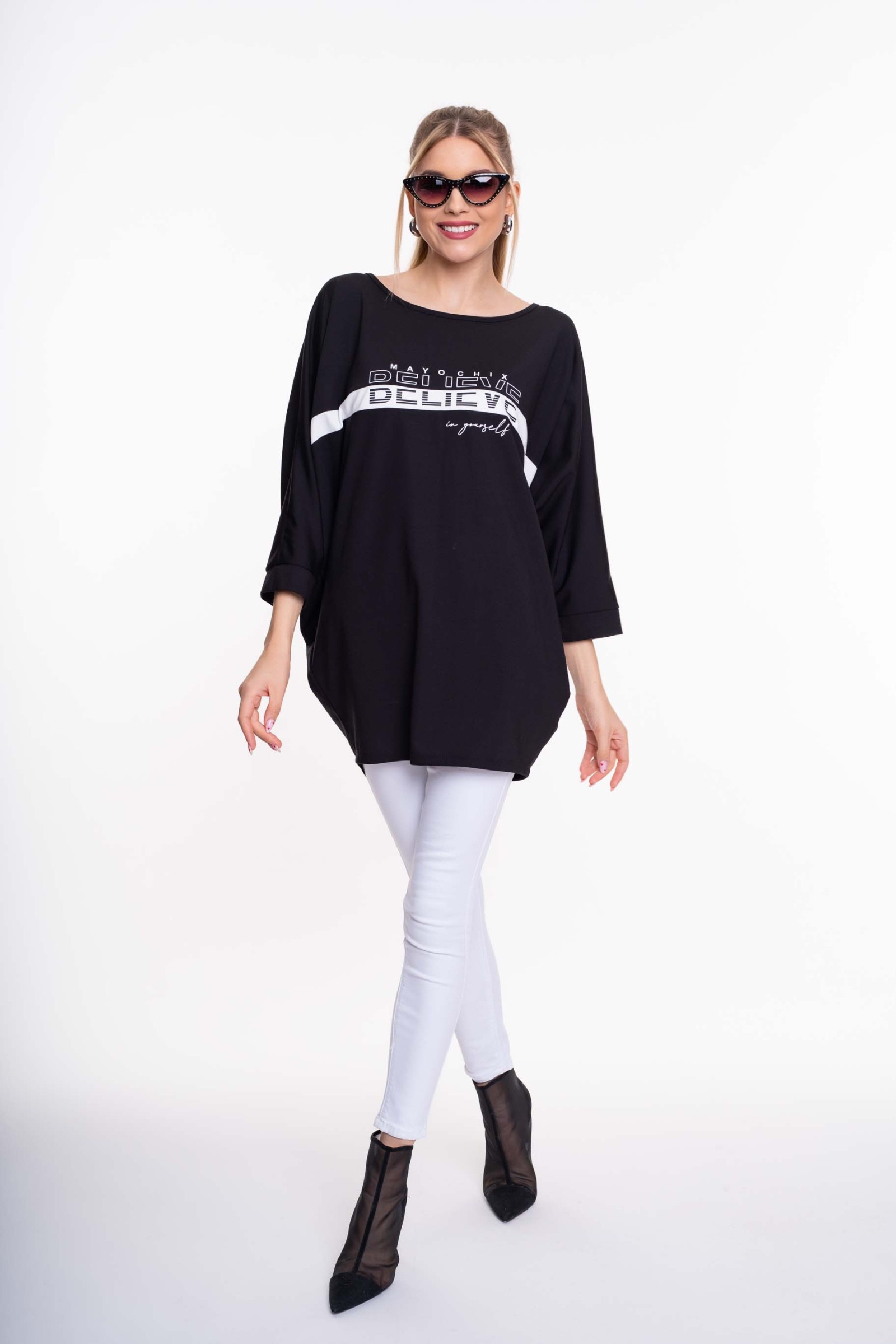 Elasztikus anyagból készült, bő szabásvonalú tunika, ejtett vállrésszel, film nyomott díszítéssel.