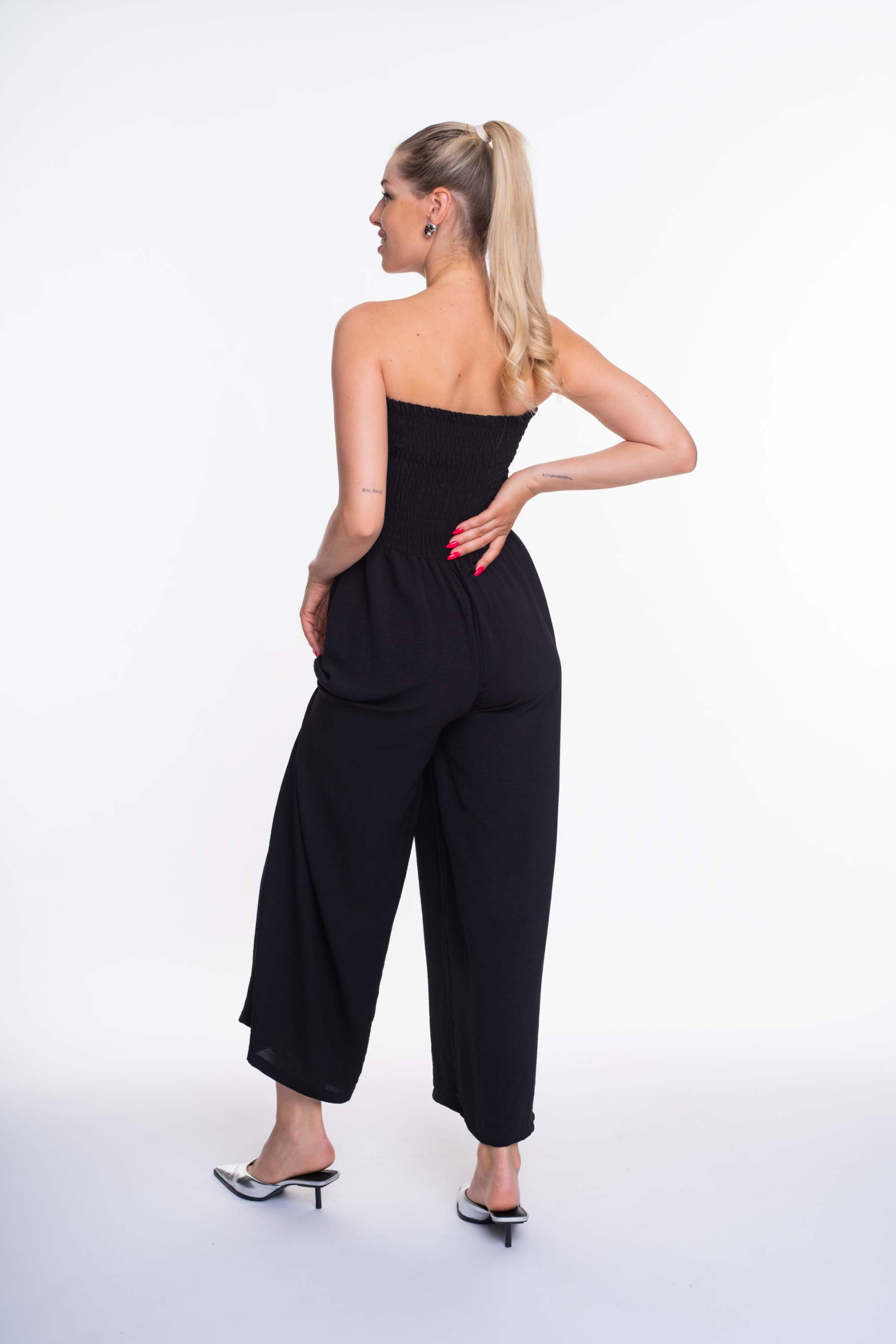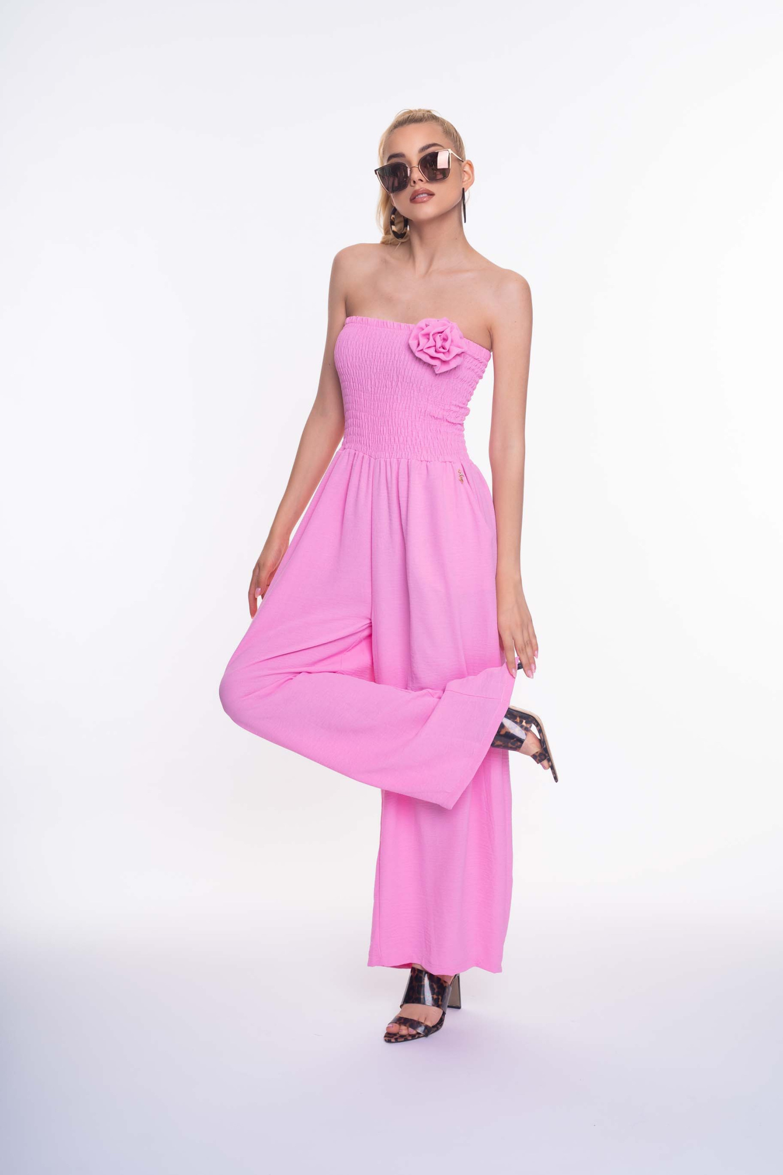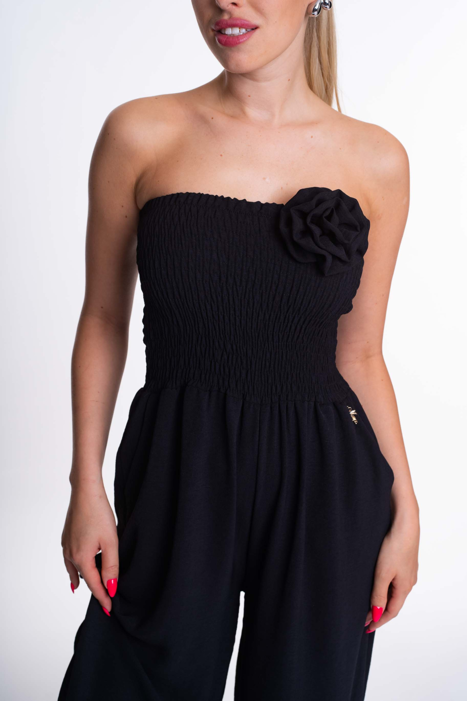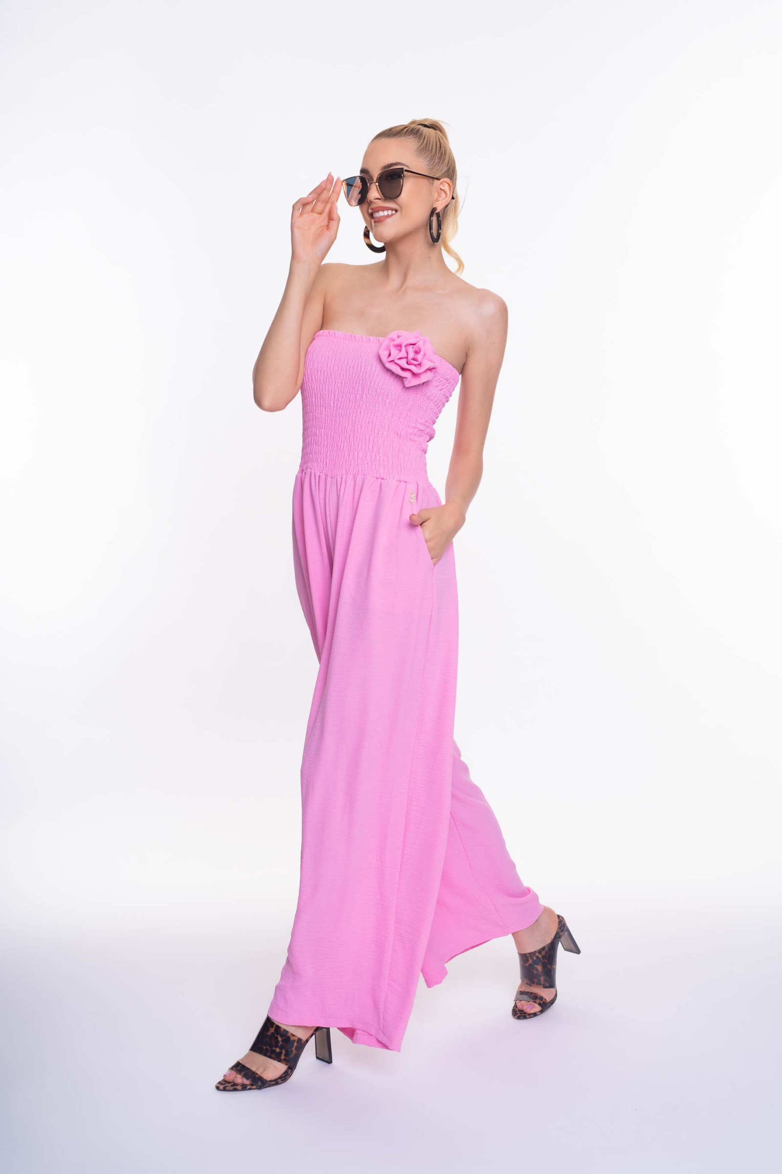 Enyhén elasztikus krepp anyagból készült, bő szárú zsebes overall, gumírozott felsőrésszel, bross kiegészítővel, kis fém márkajelzéssel.
