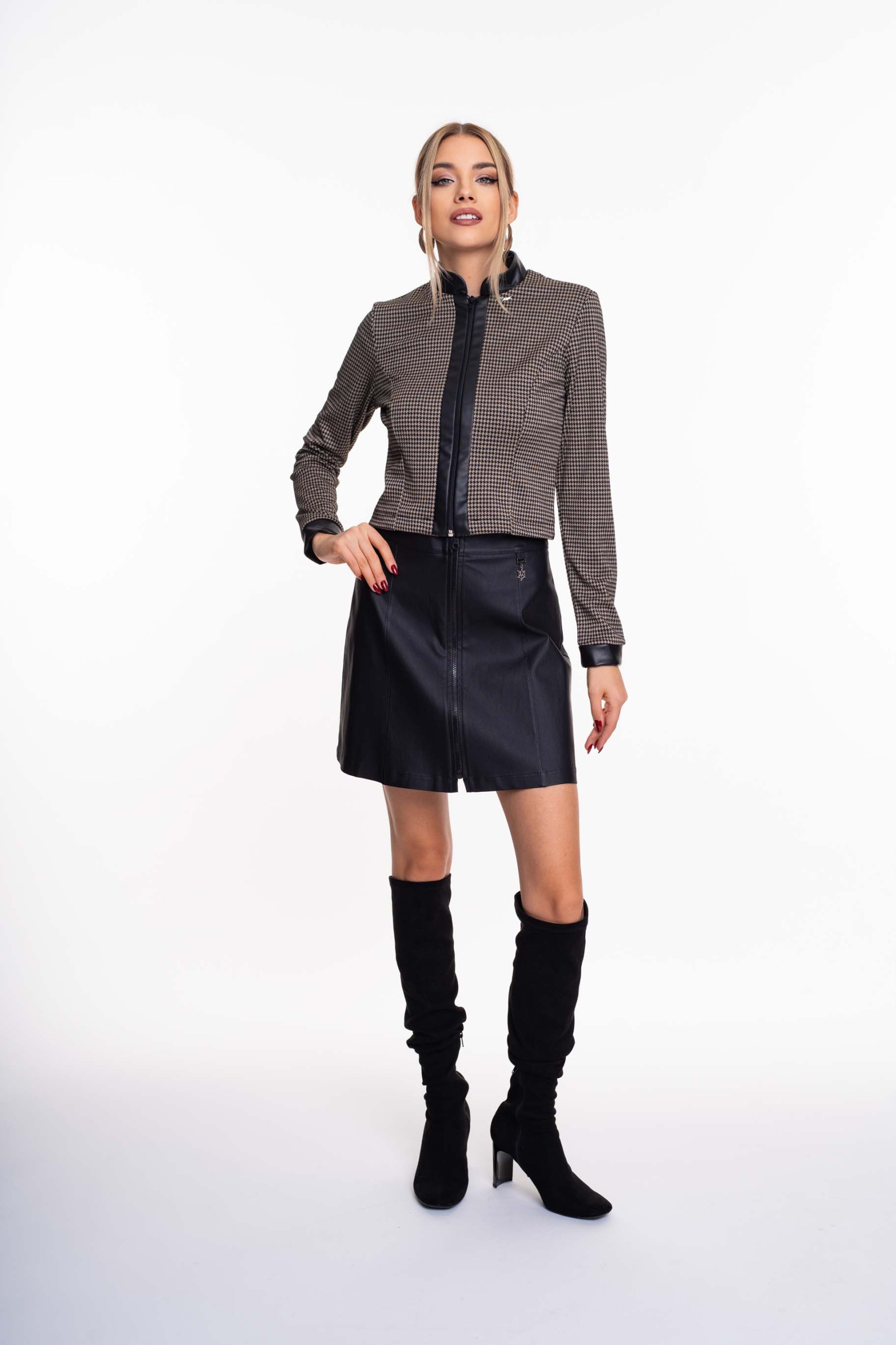 Elasztikus anyagból készült, rövid fazonú blézer műbőrrel kombinálva, kis fém márkajelzéssel.