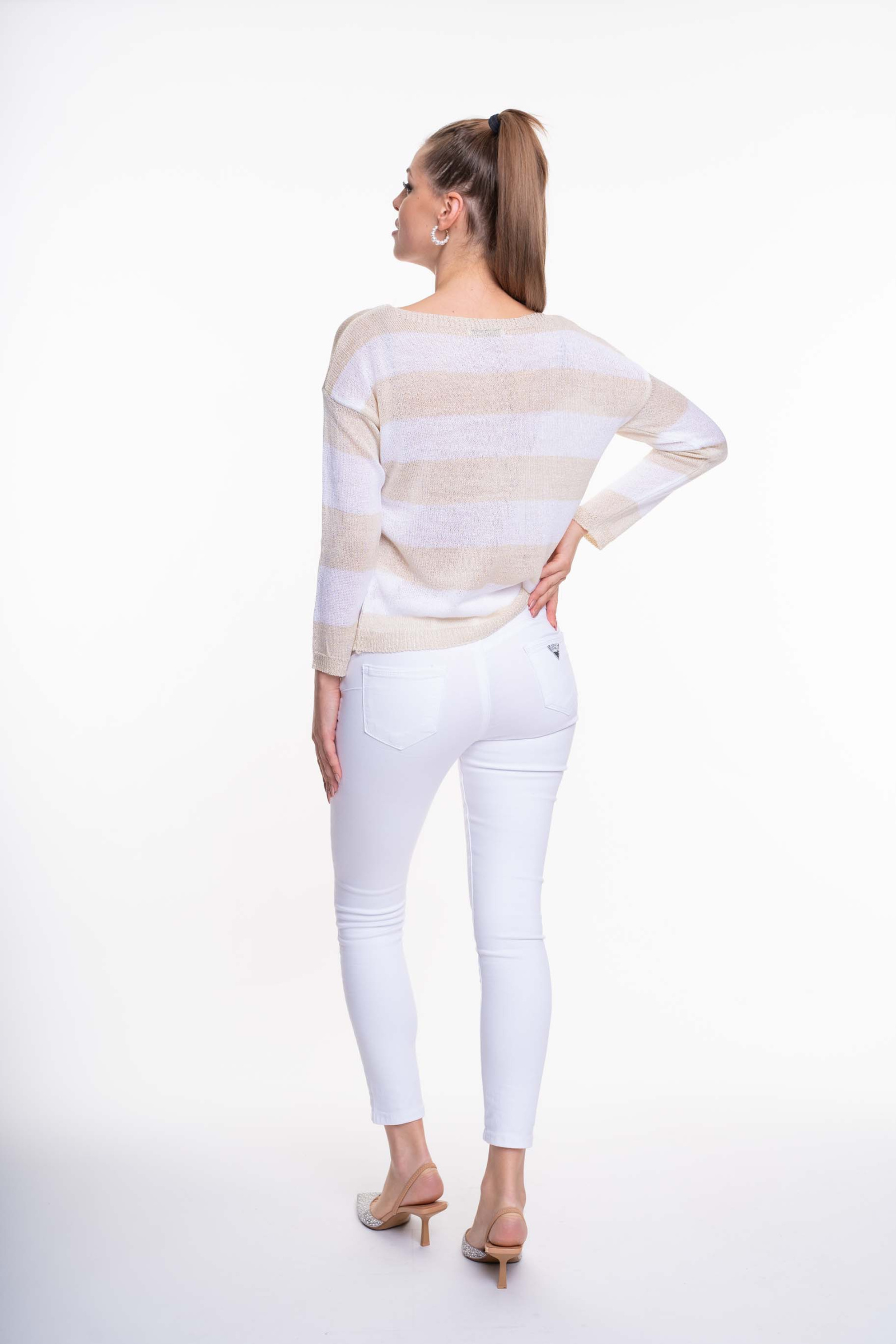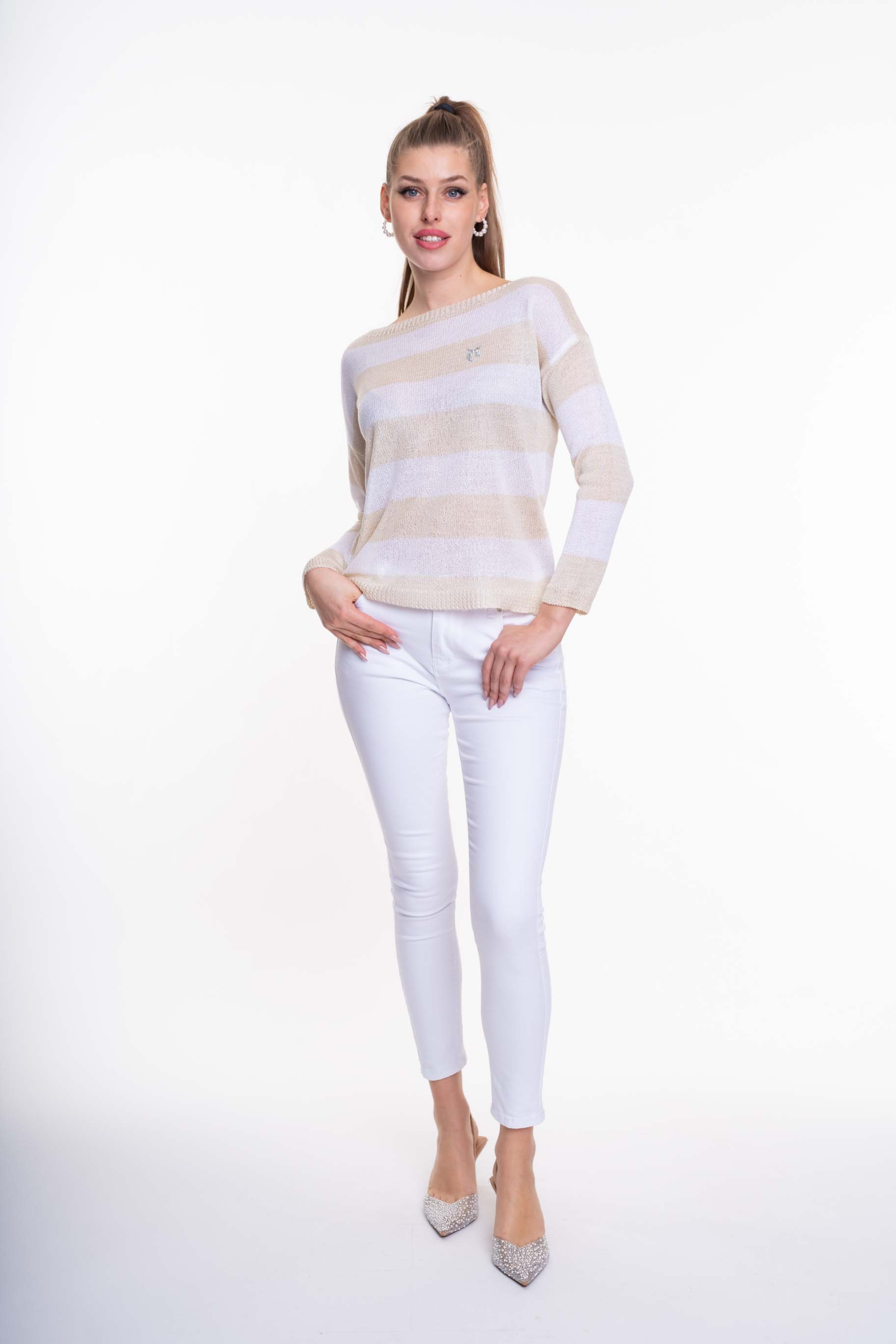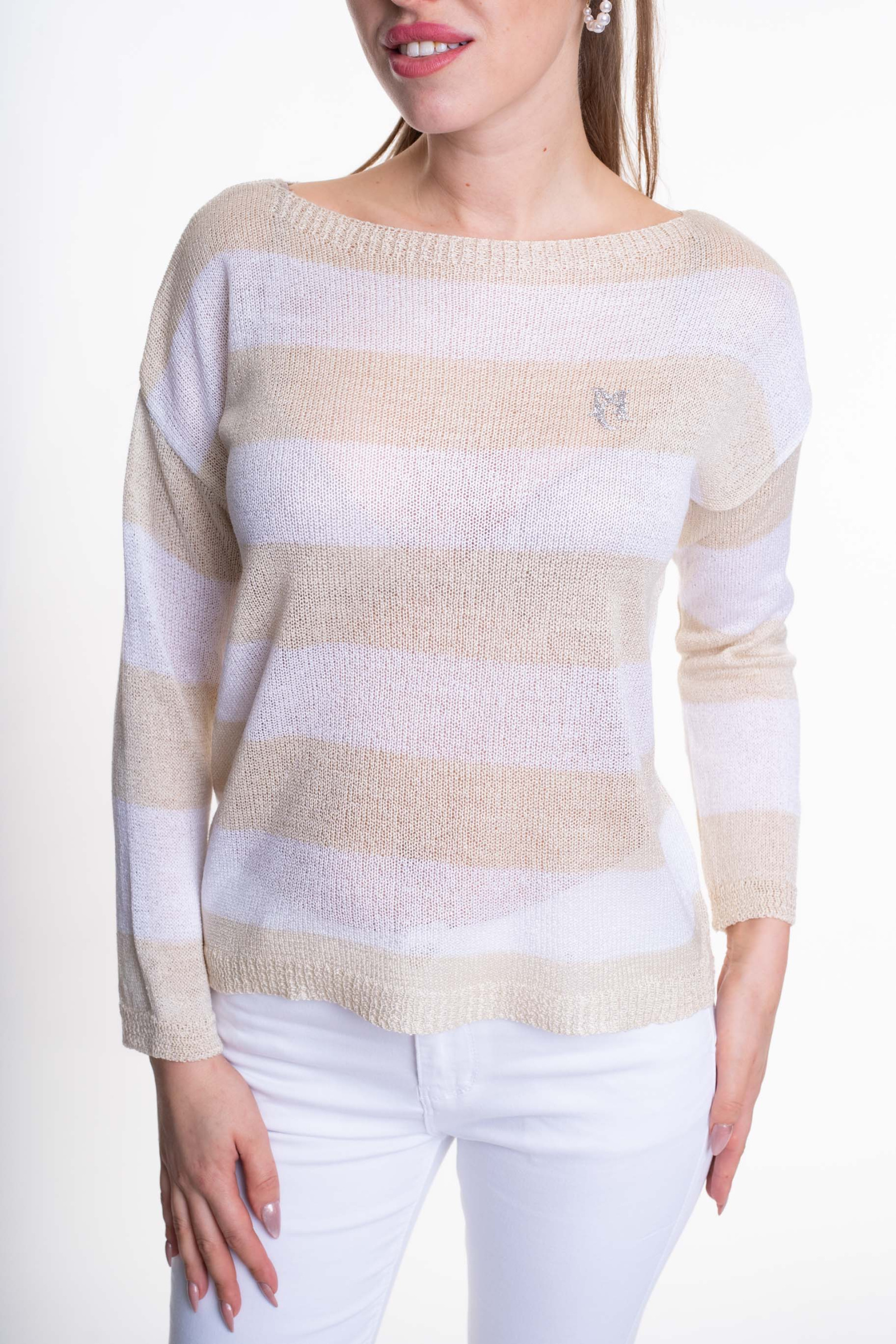 Laza kötésű, lezser szabásvonalú pulóver, strasszos matrica nyomott márkajelzéssel.
