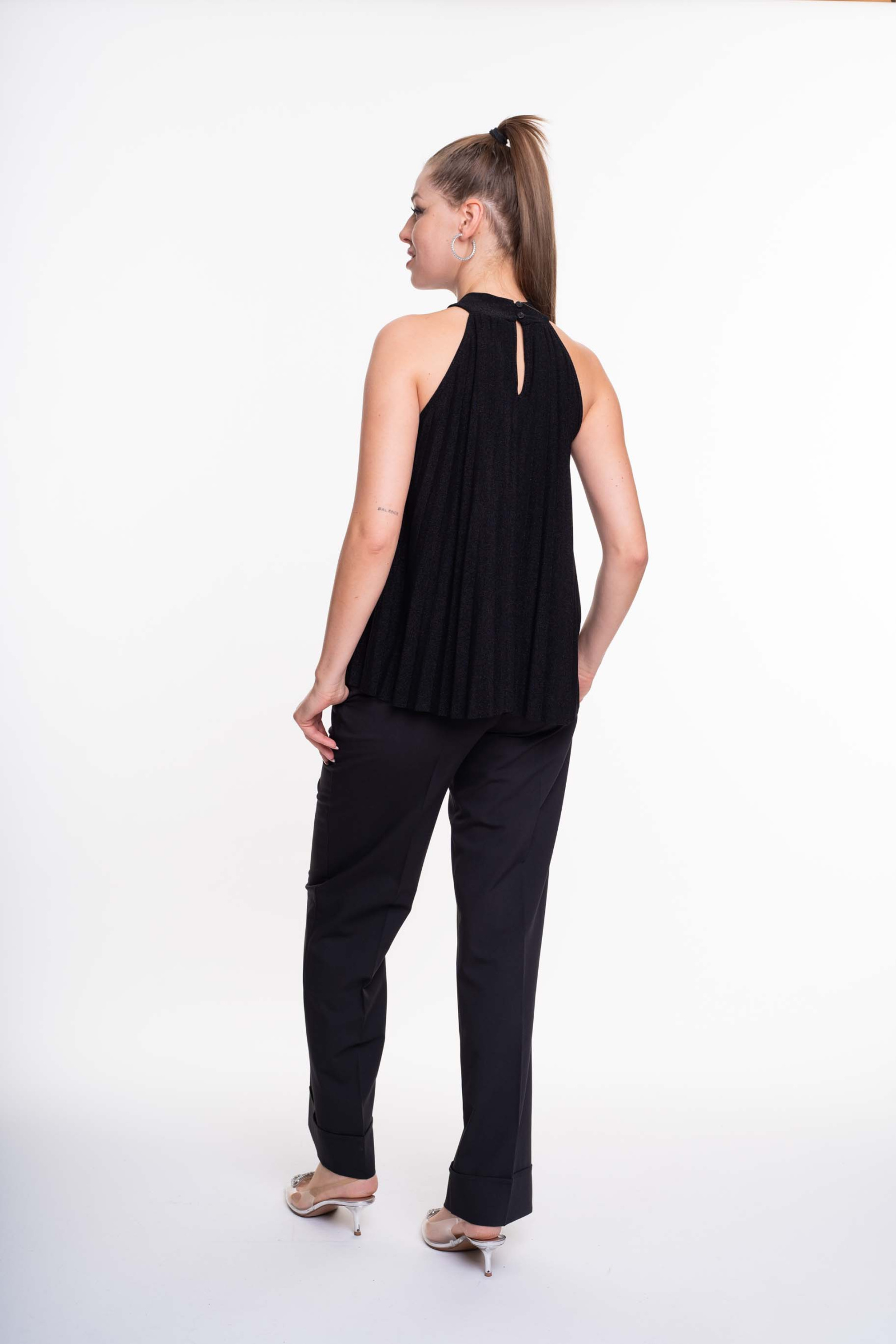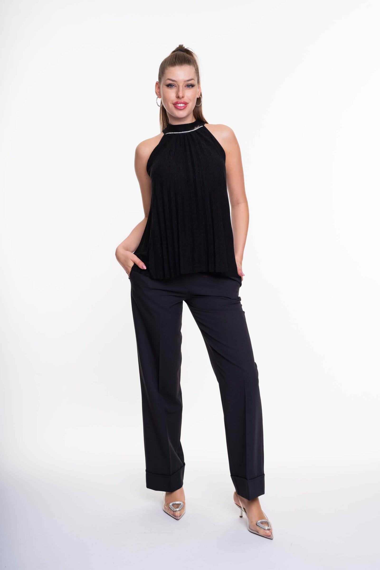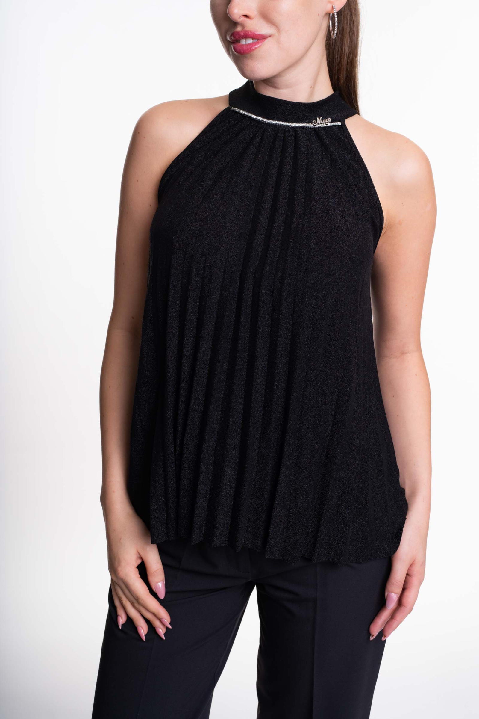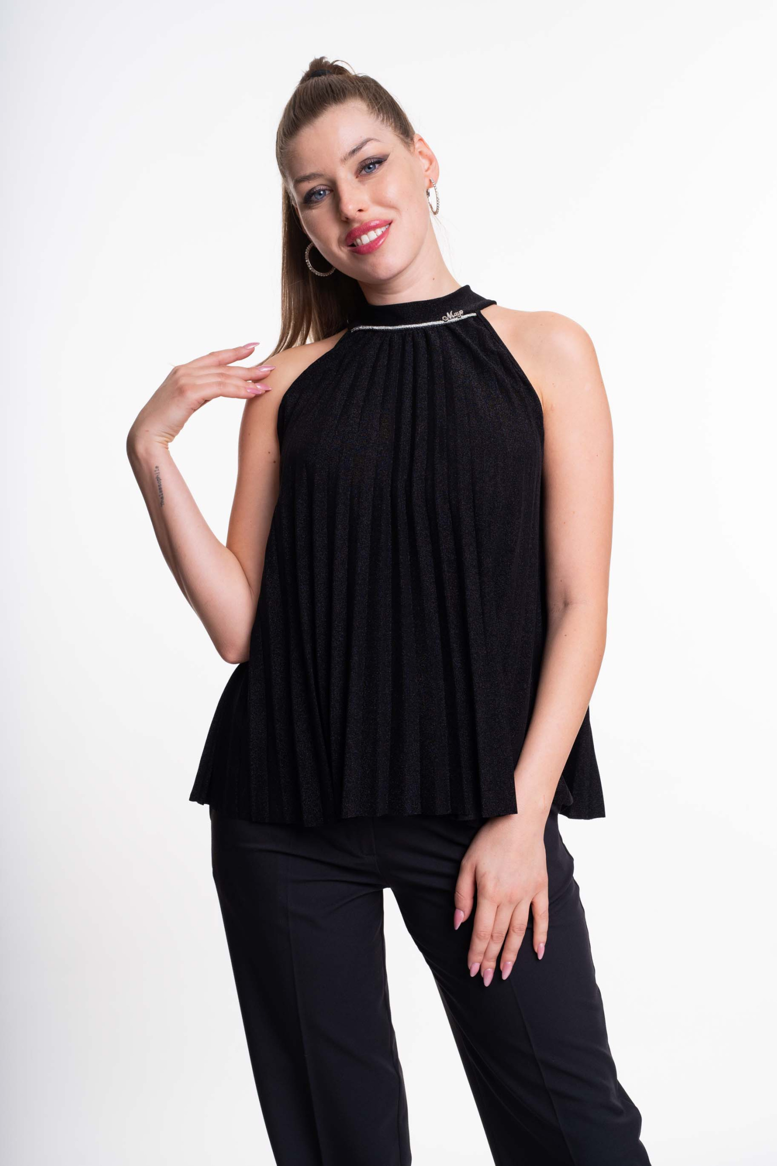 Elasztikus alkalmi anyagból készült, A vonalú felső, nyakrészen strasszköves díszítéssel, fém bross márkajelzéssel.