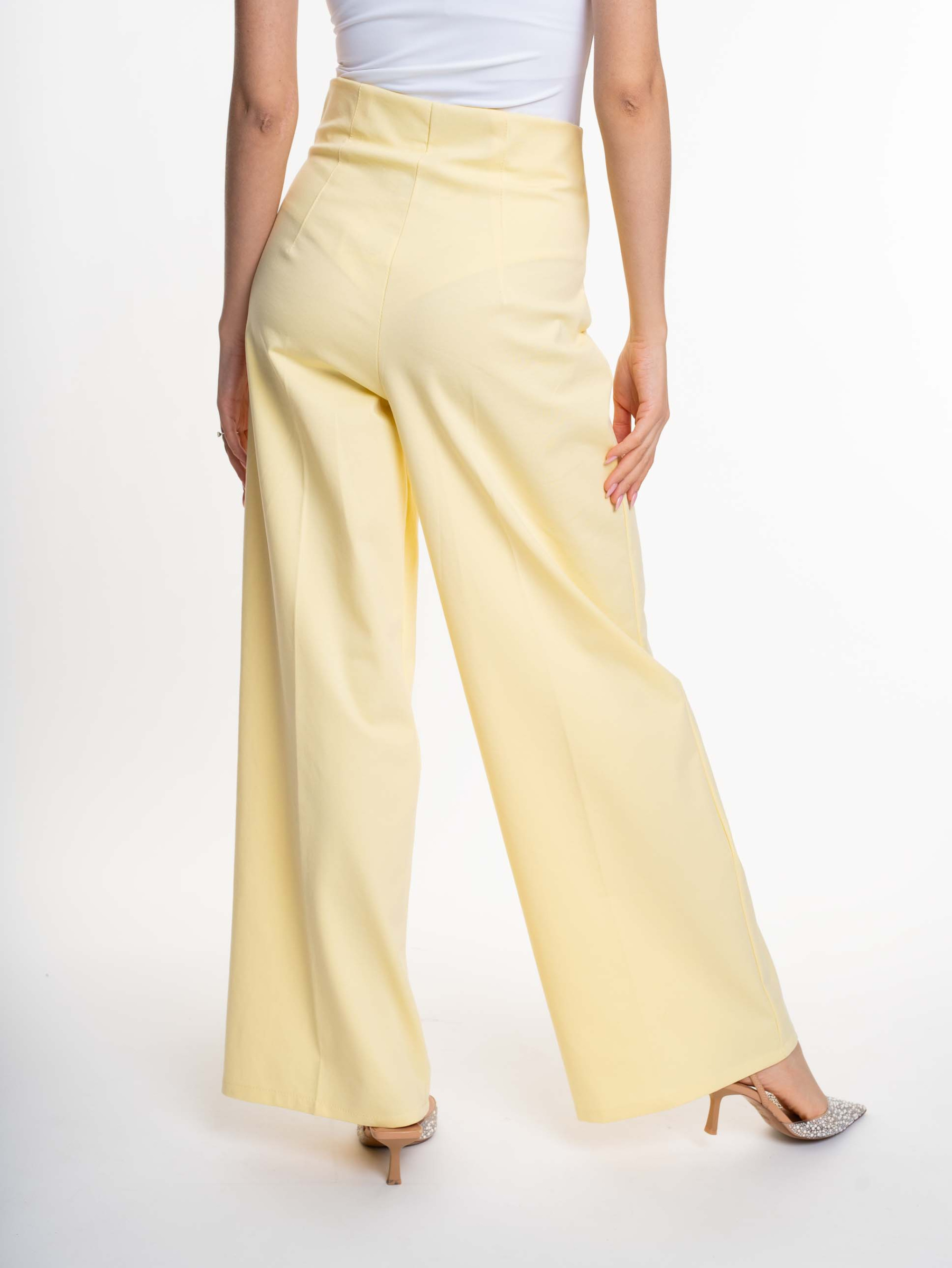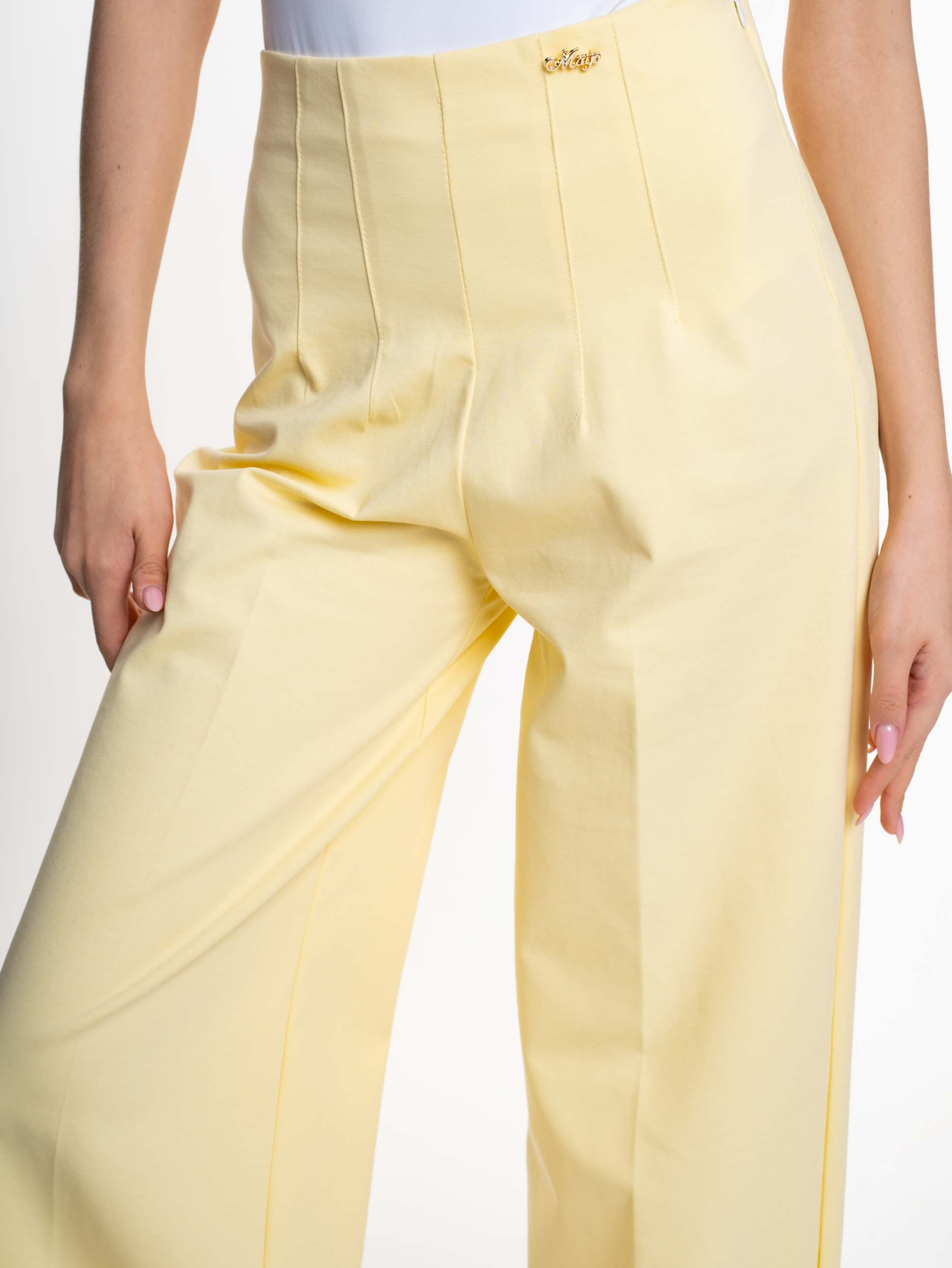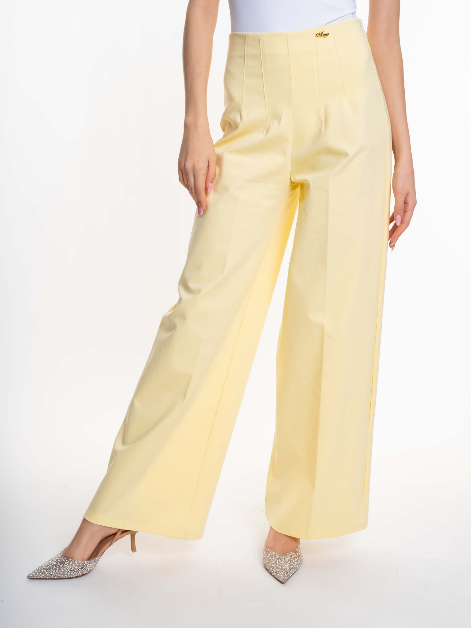 Elasztikus anyagból készült, bő szárú nadrág, emelt derékrésszel, cipzáras záródással, mosáshoz levehető fém bross márkajelzéssel.