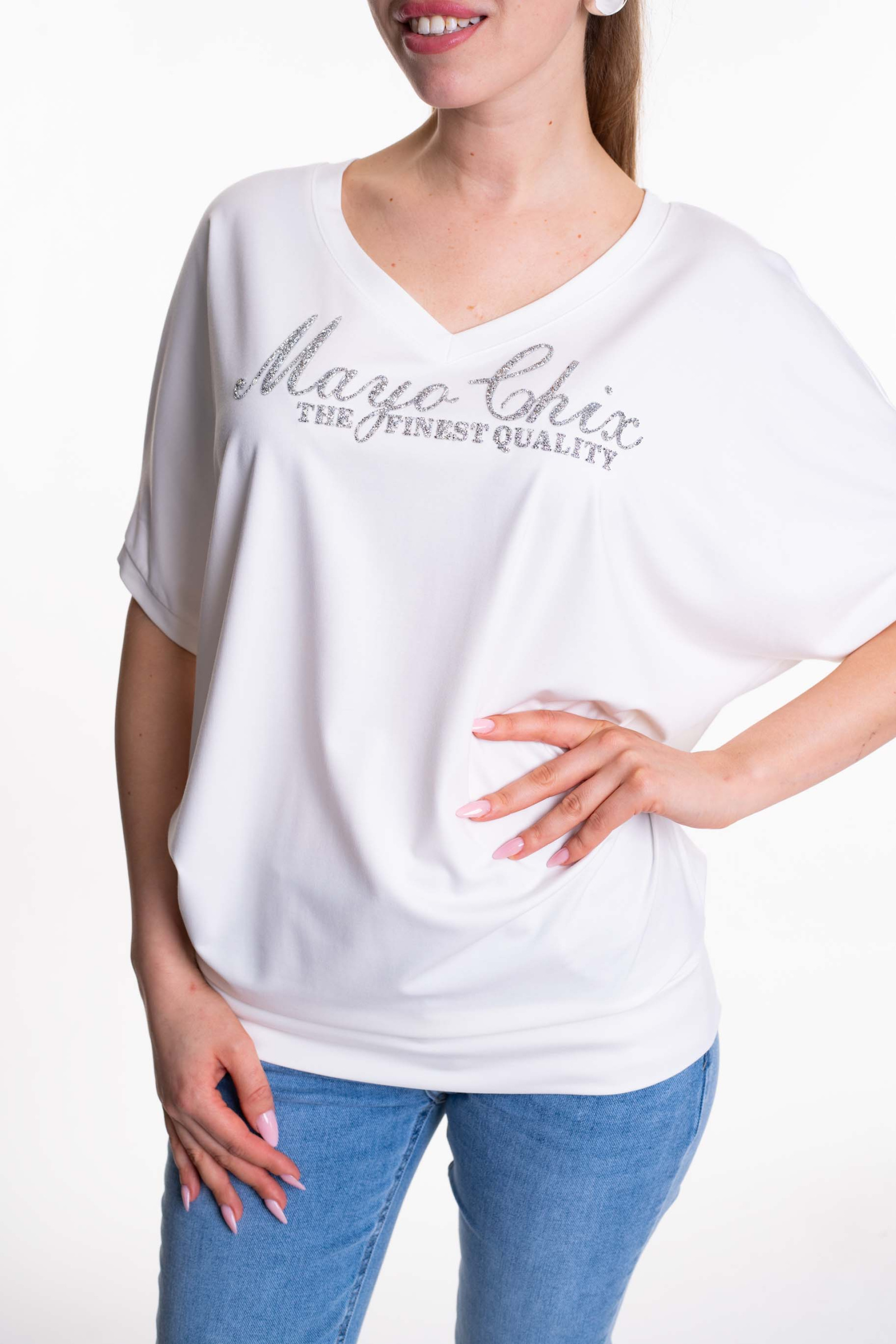 Elasztikus anyagból készült, lezser szabásvonalú tunika, strasszköves matrica nyomott márkajelzéssel.