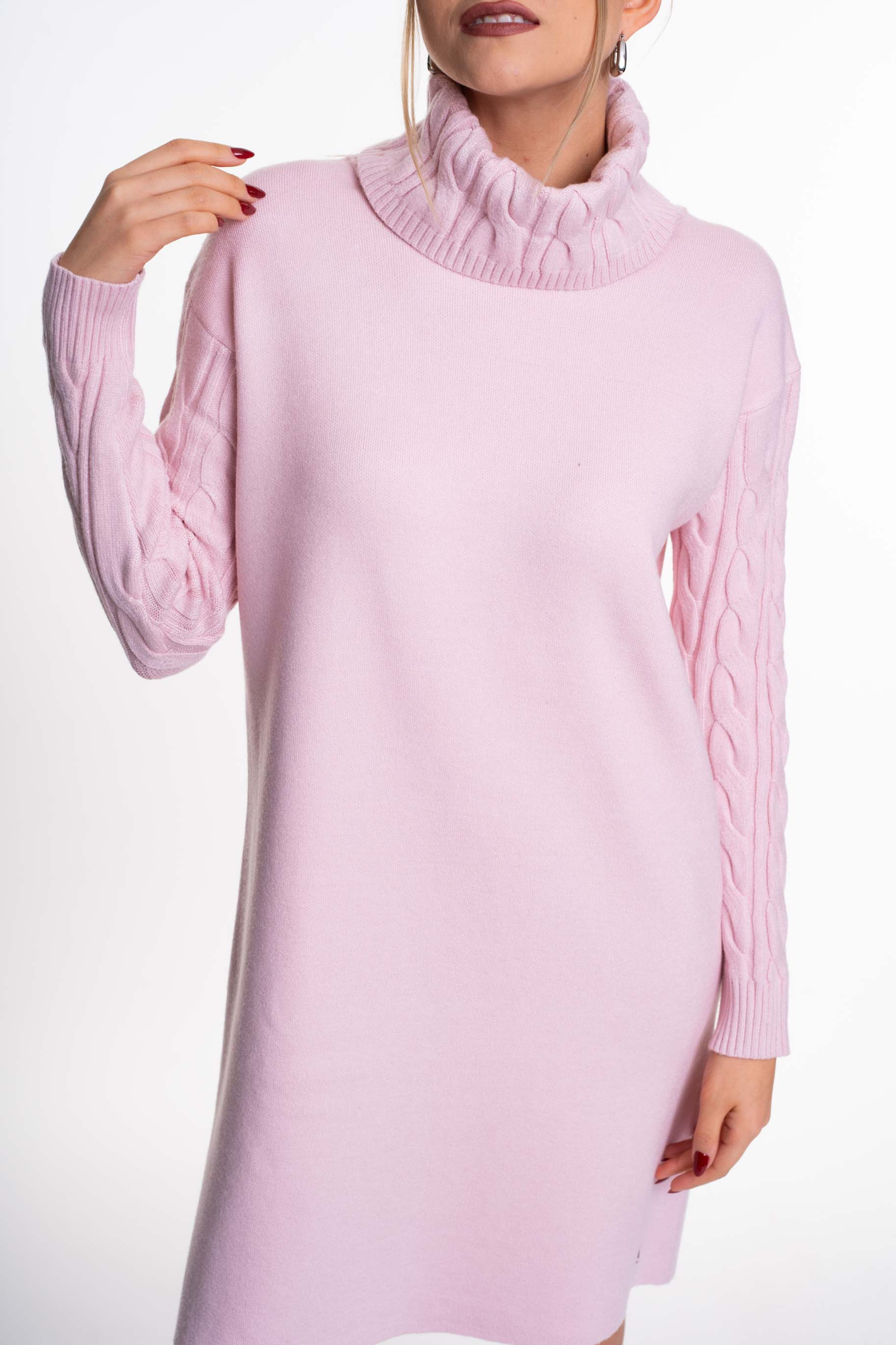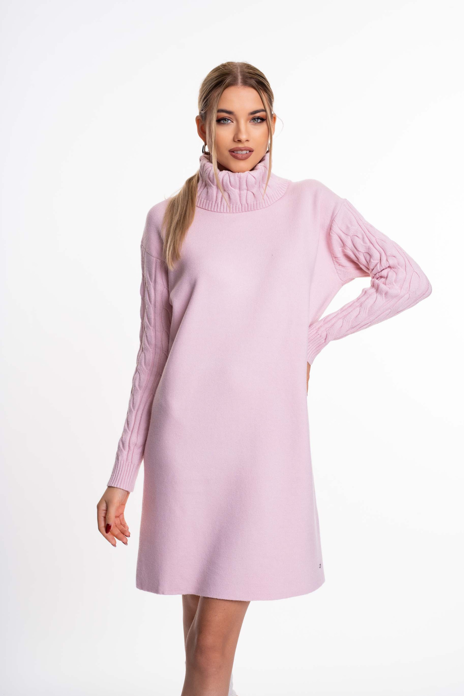 Puha kötött anyagú, lezser szabású ruha, garbóján és ujjain anyagában kötött mintával, alján kis fém márkajelzéssel.