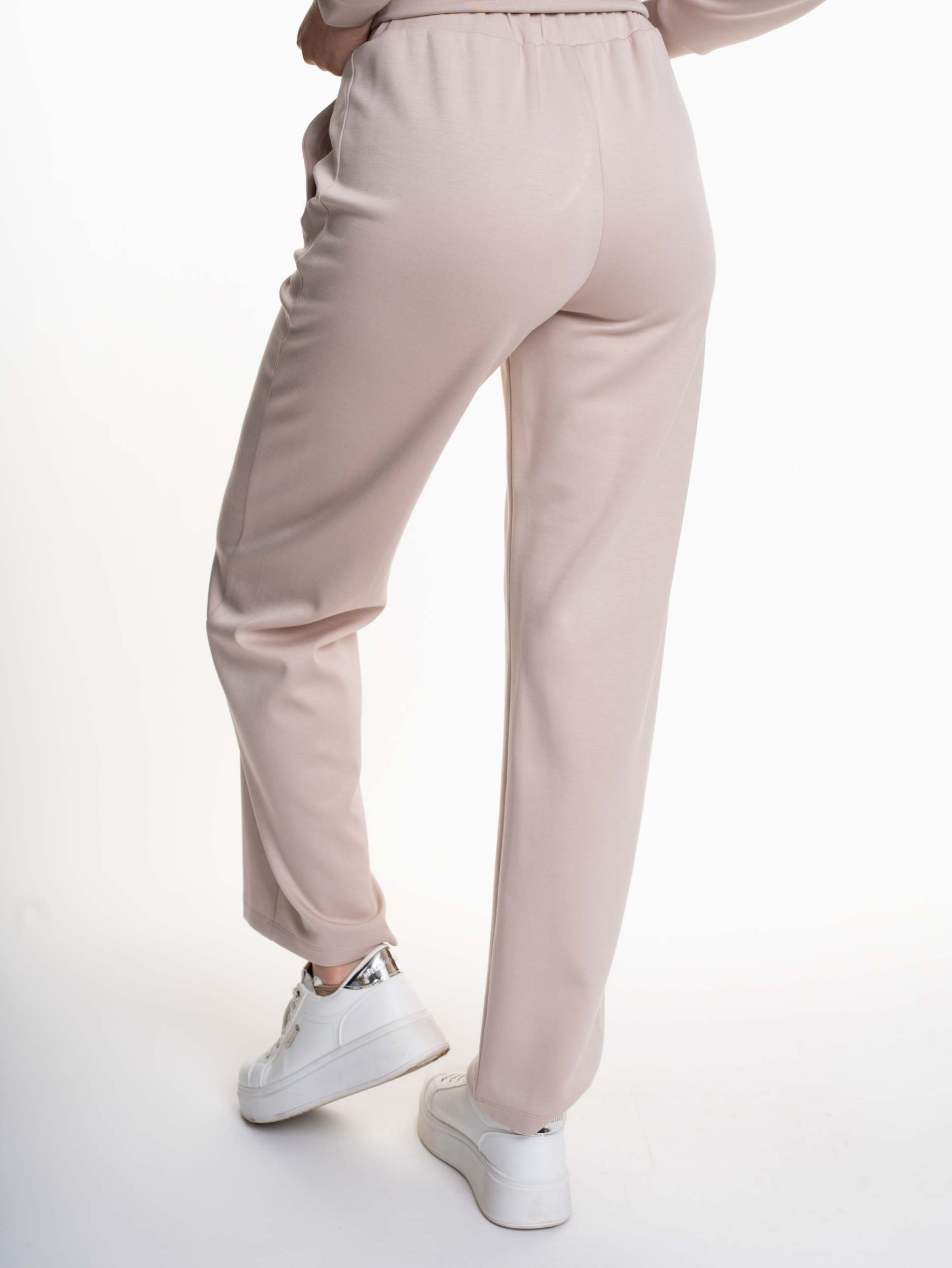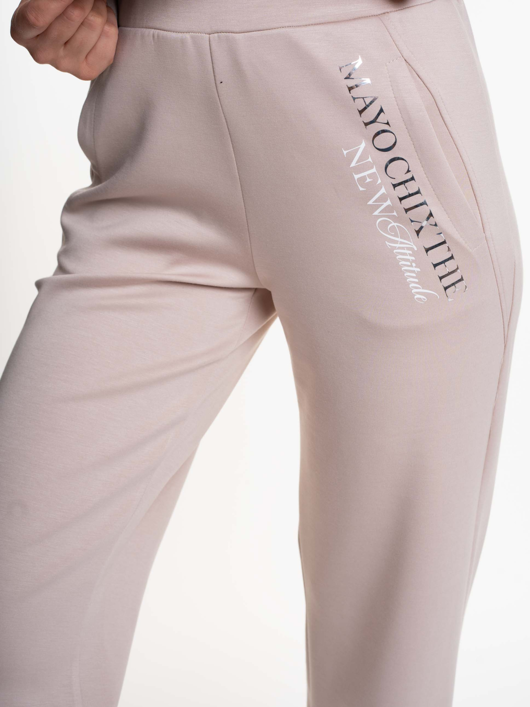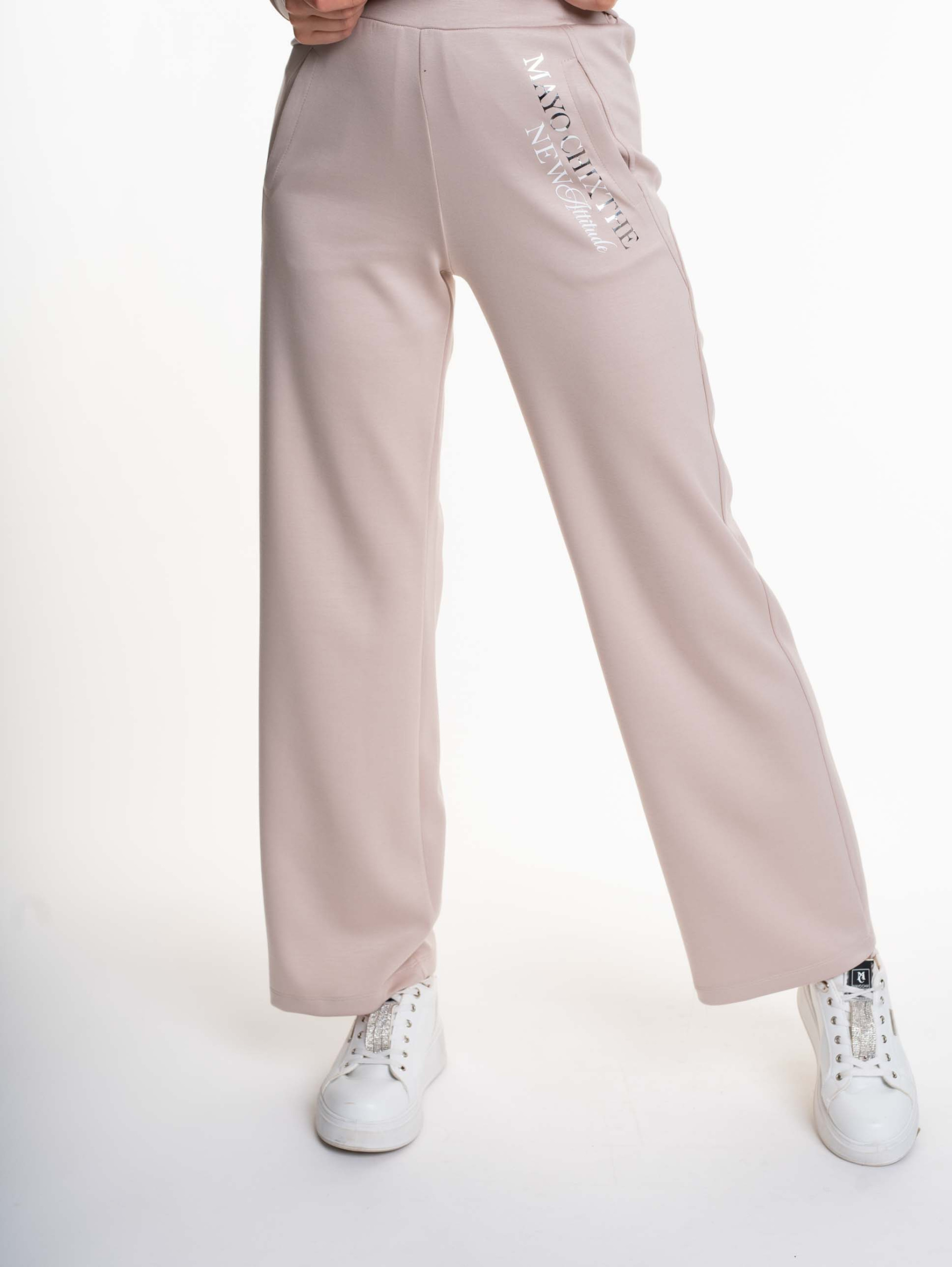 Elasztikus anyagból készült, bő szárú, gumis derekú nadrág svéd zsebekkel, matrica nyomott díszítéssel.