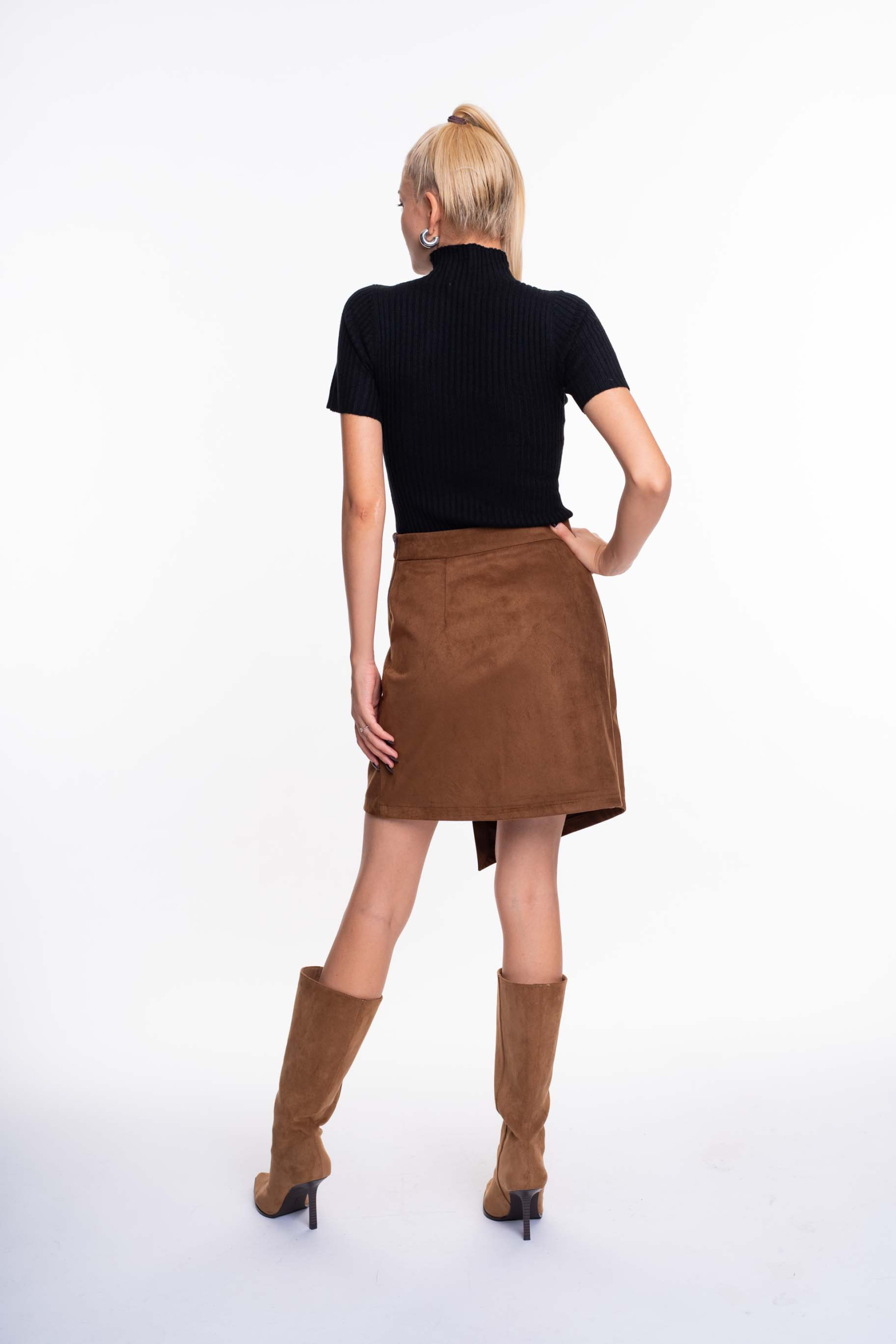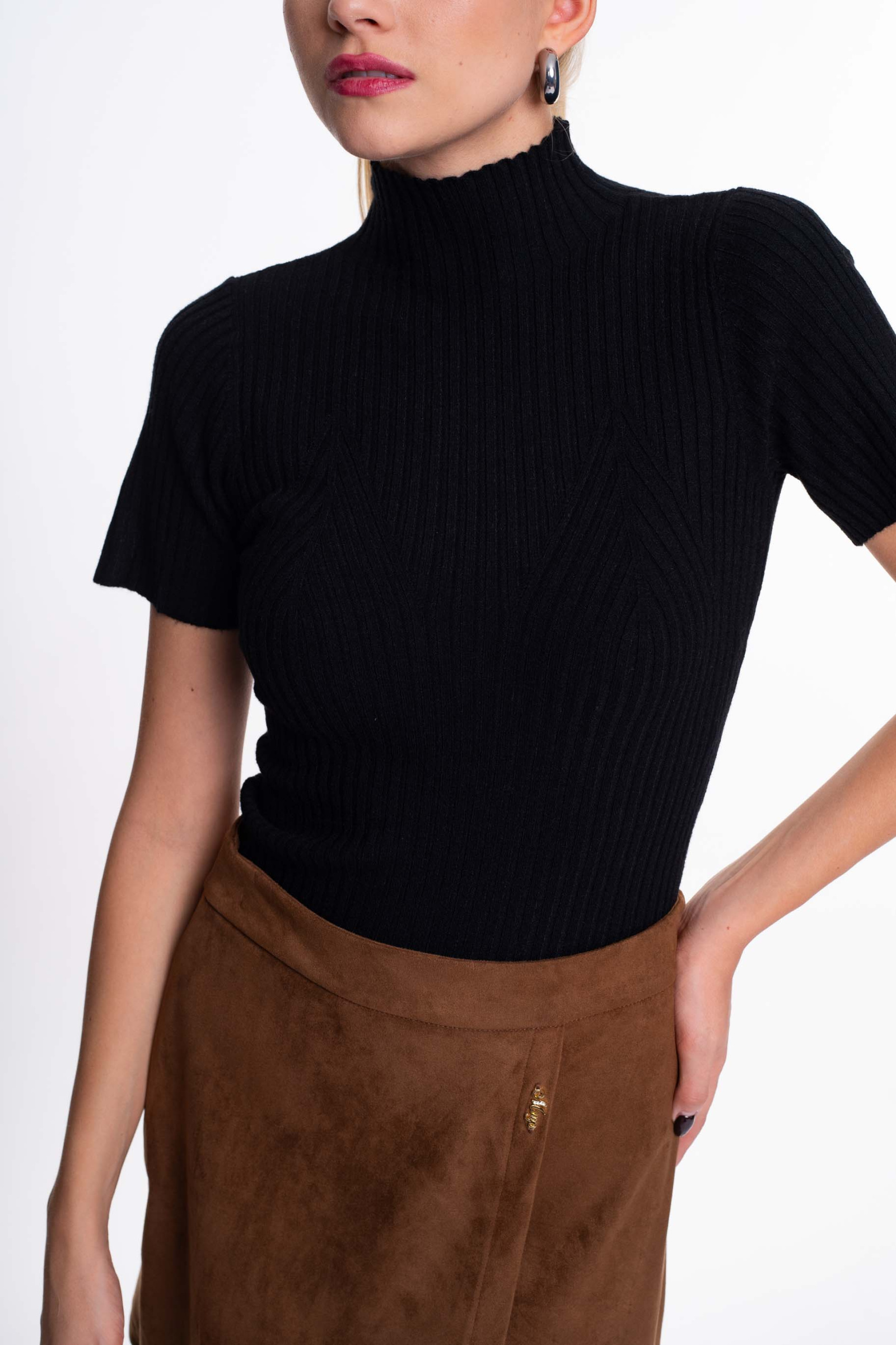 Karcsúsított fazonú, bordás kötött pulóver emelt nyakrésszel, strasszköves matrica nyomott márkajelzéssel.