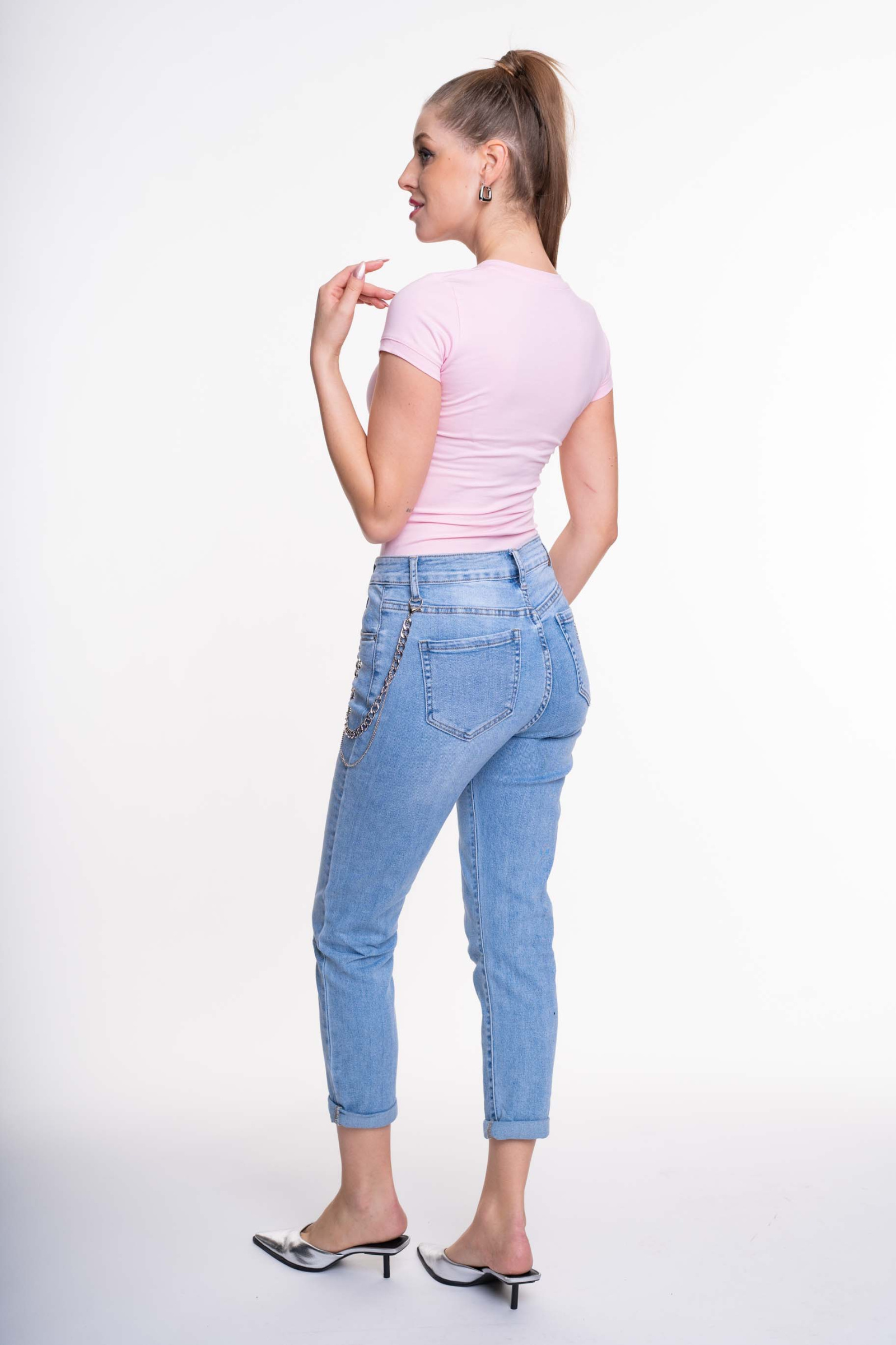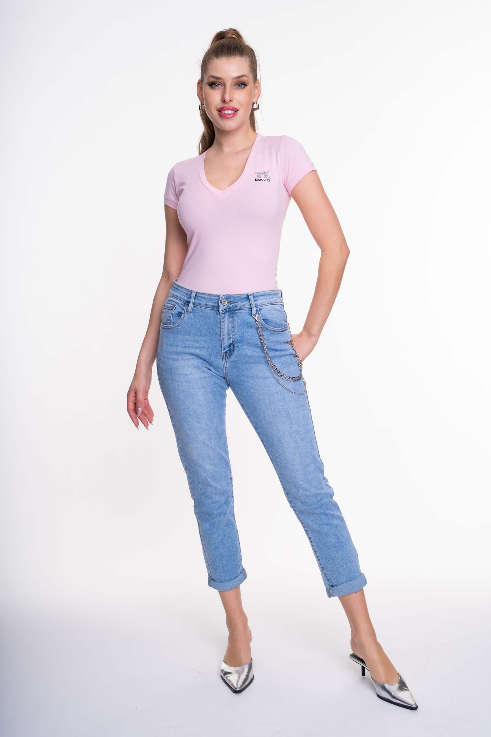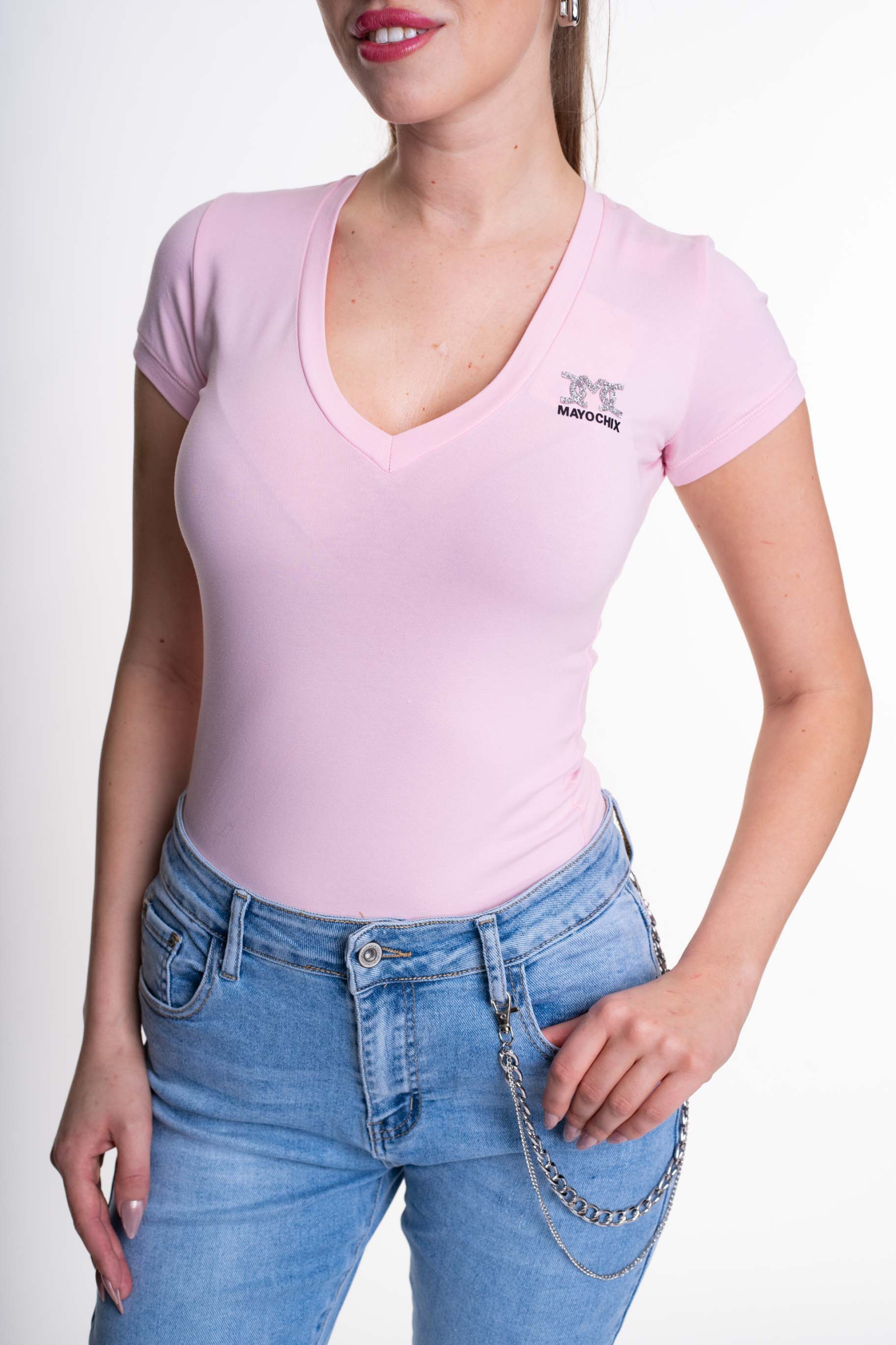 Elasztikus anyagból készült, V nyakkivágású póló, strasszköves matrica nyomott márkajelzéssel