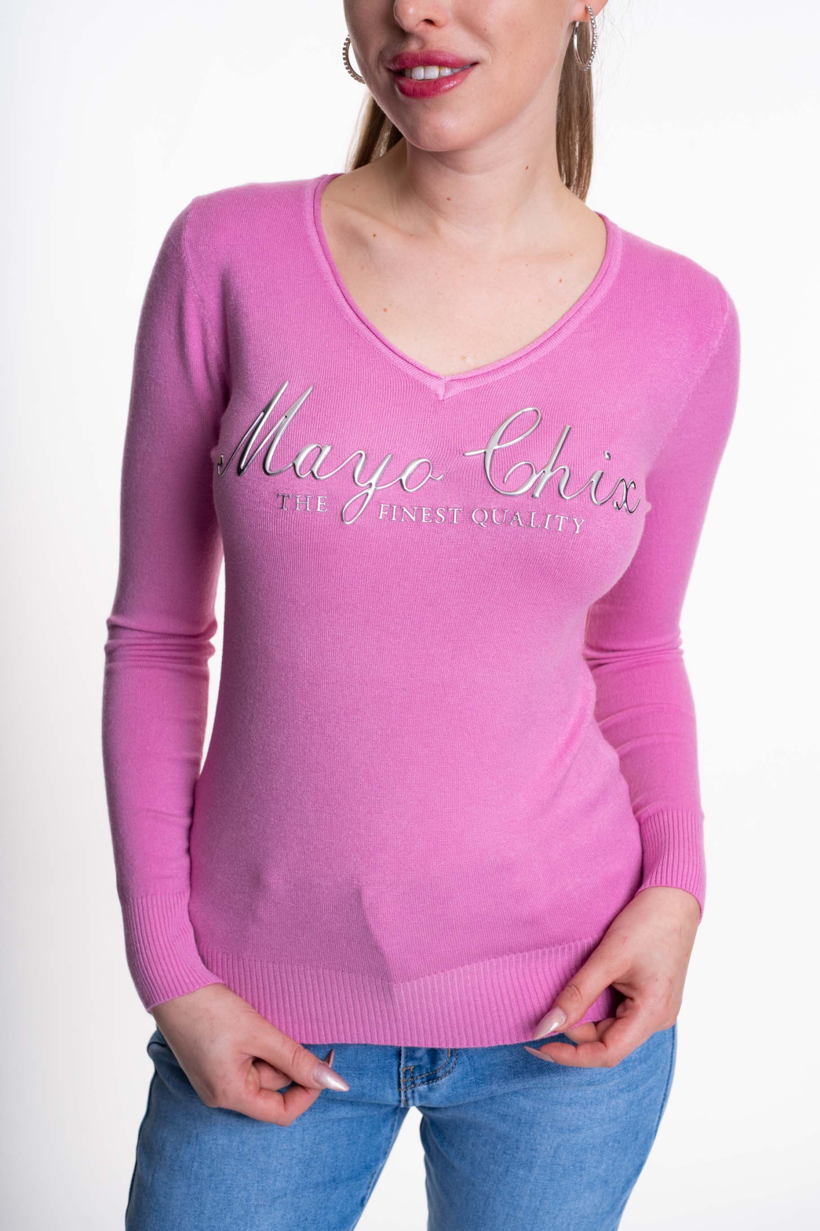 Elasztikus, vékony kötött anyagú pulóver, V nyak kivágással, domború matrica nyomott márkajelzéssel.