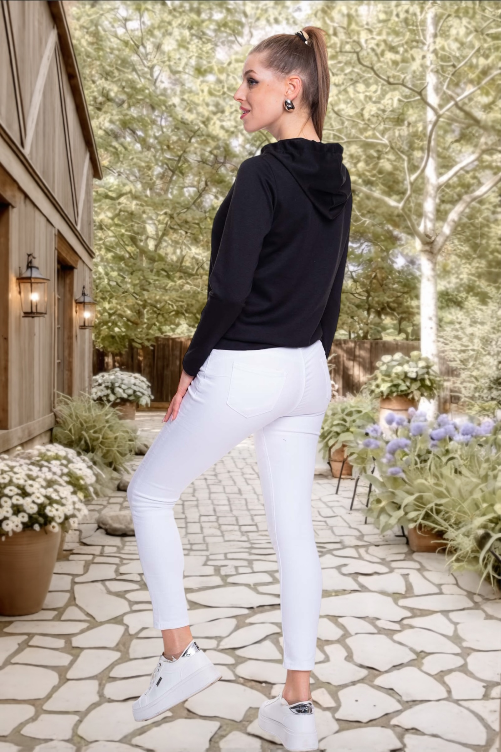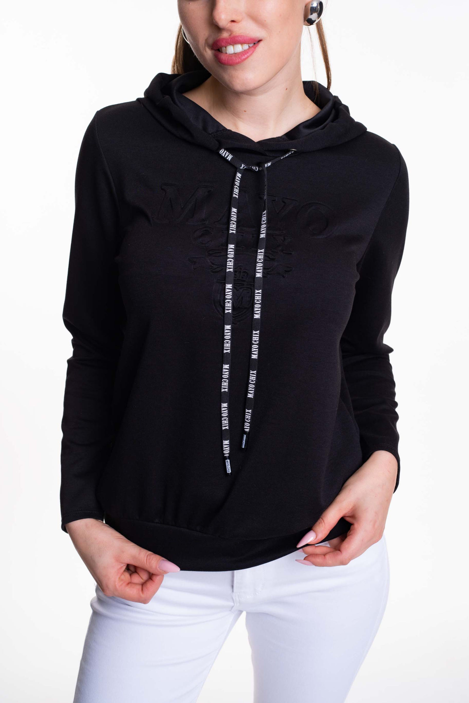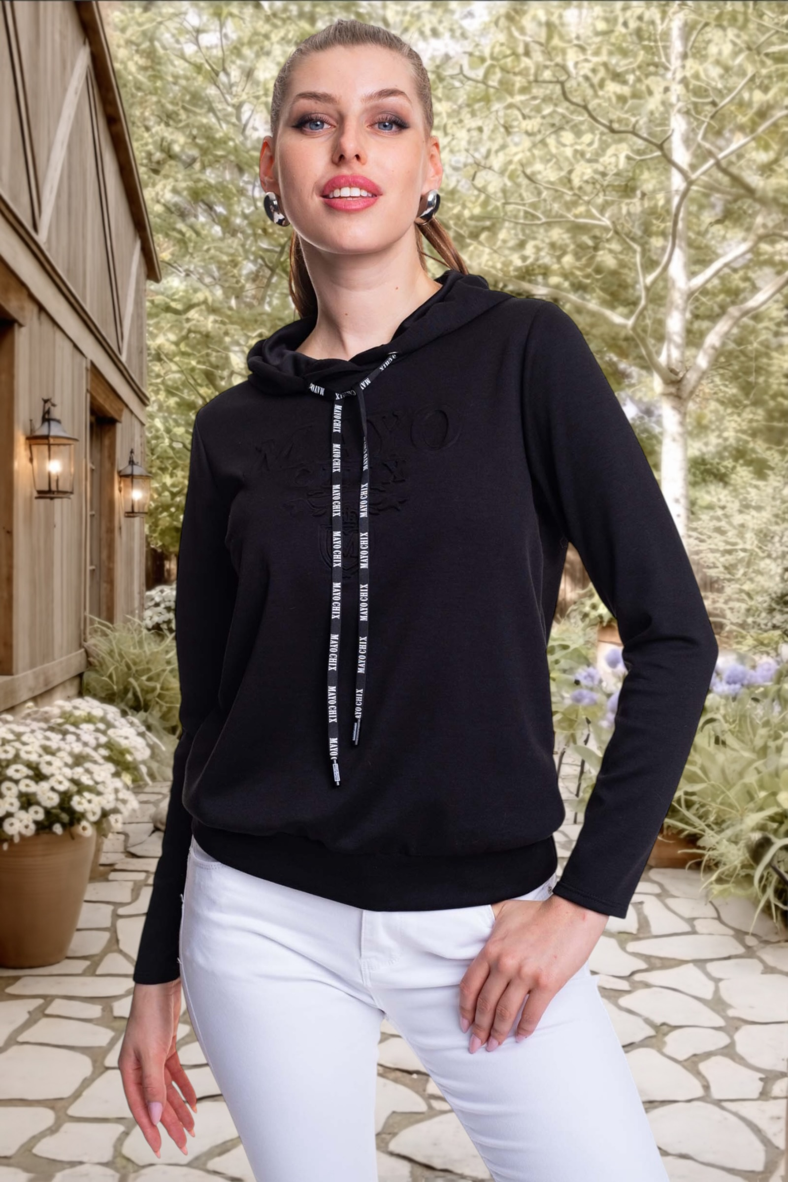 Elasztikus anyagból készült passzés és kapucnis felső, márkajelzett behúzóval, dombornyomott márkajelzéssel.