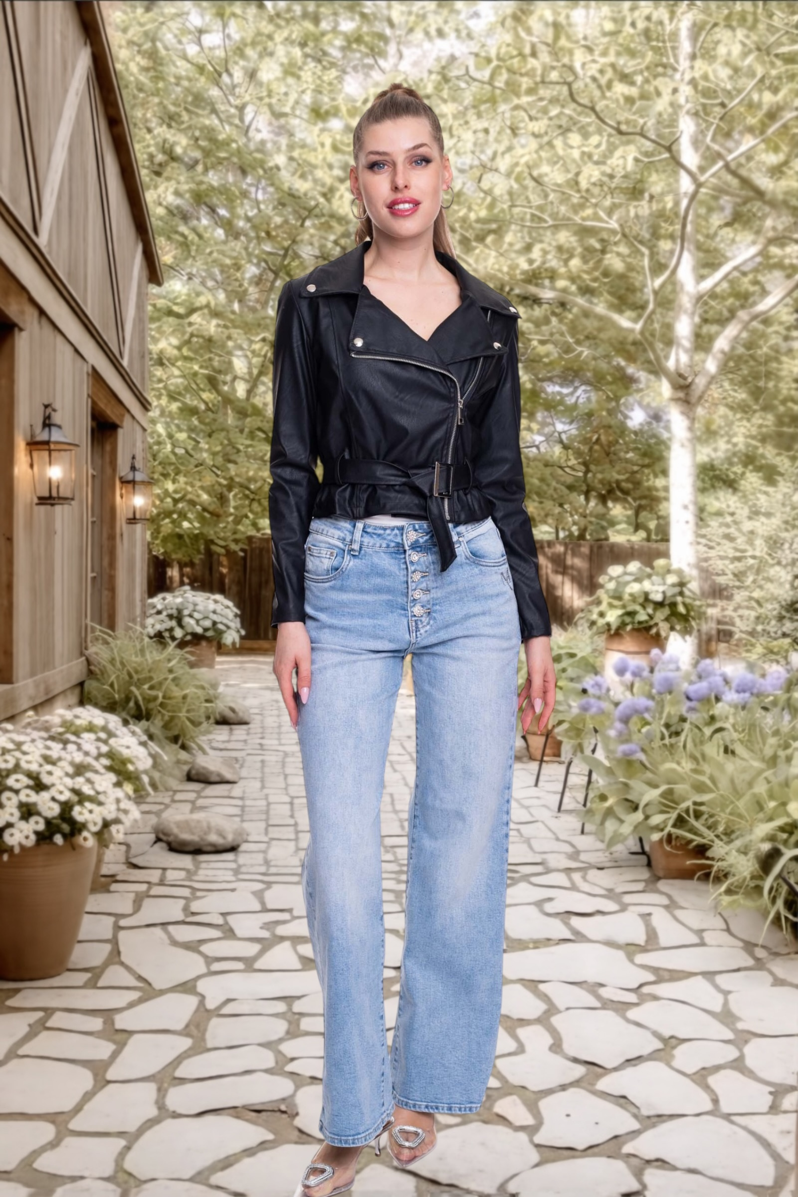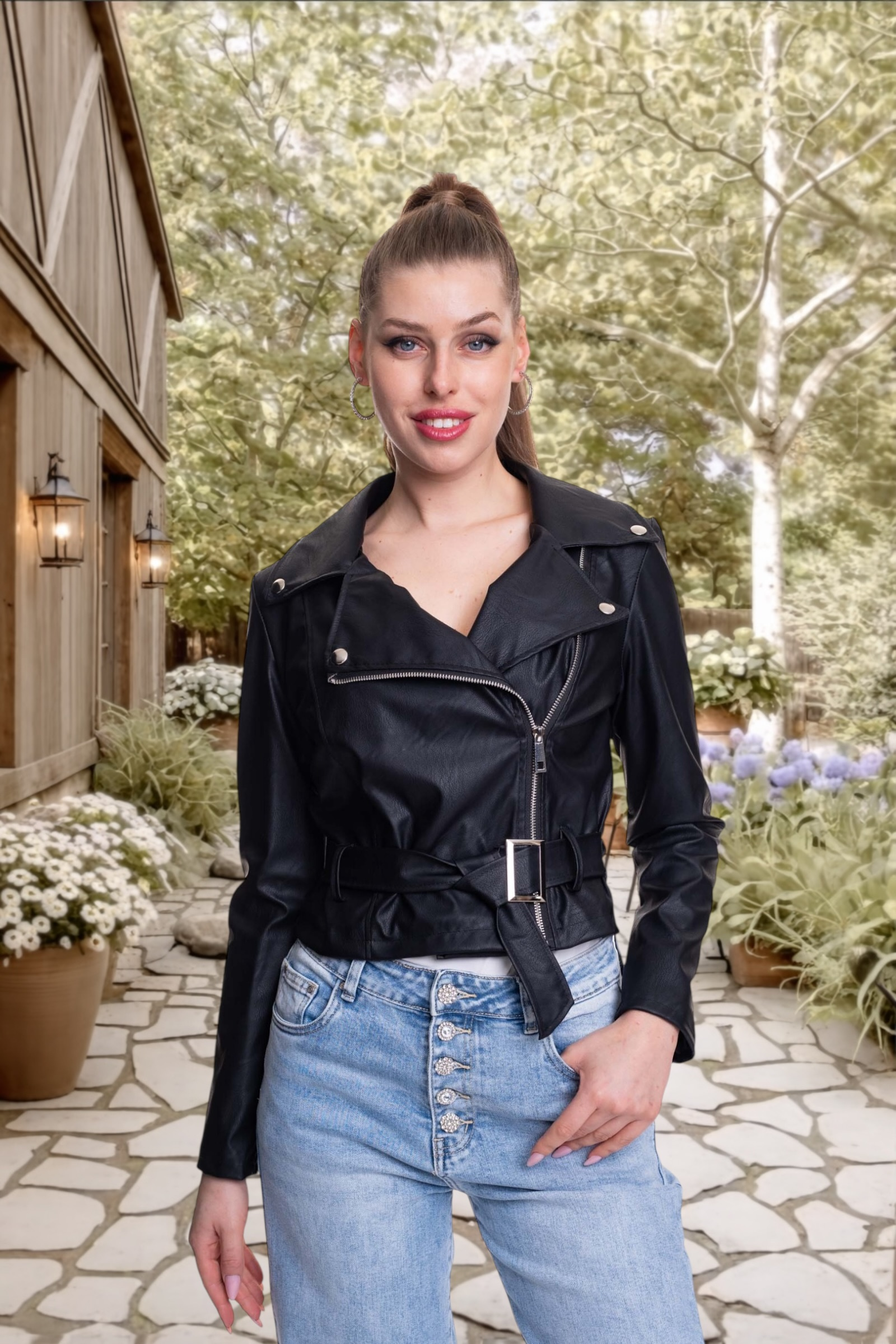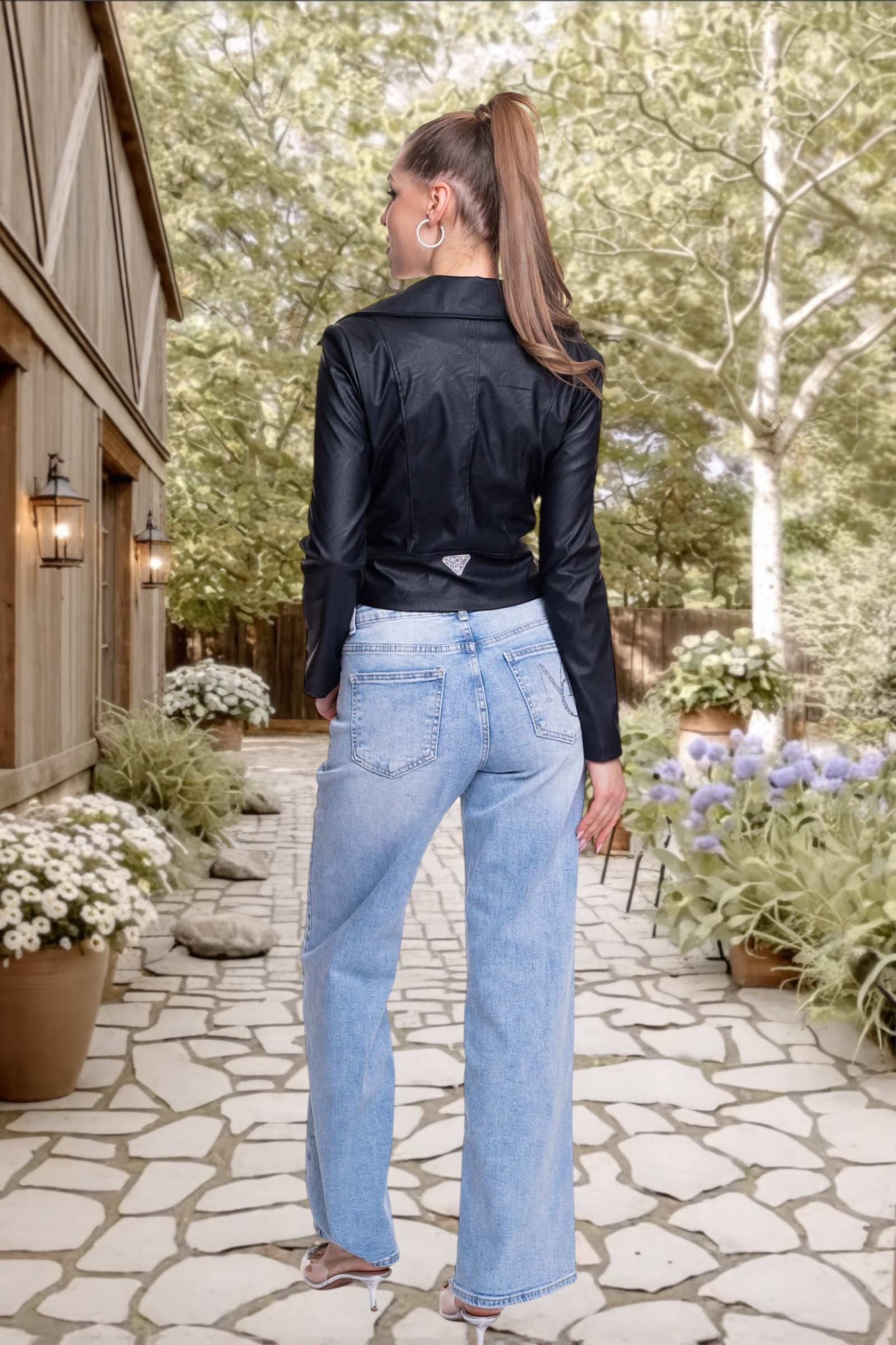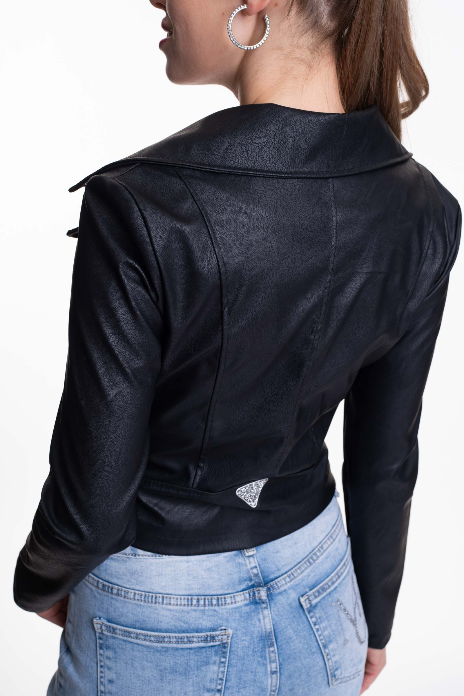 Műbőrből készült, aszimmetrikus záródású galléros dzseki, alján csatos szűkítővel, strasszos matricanyomott márkajelzéssel.