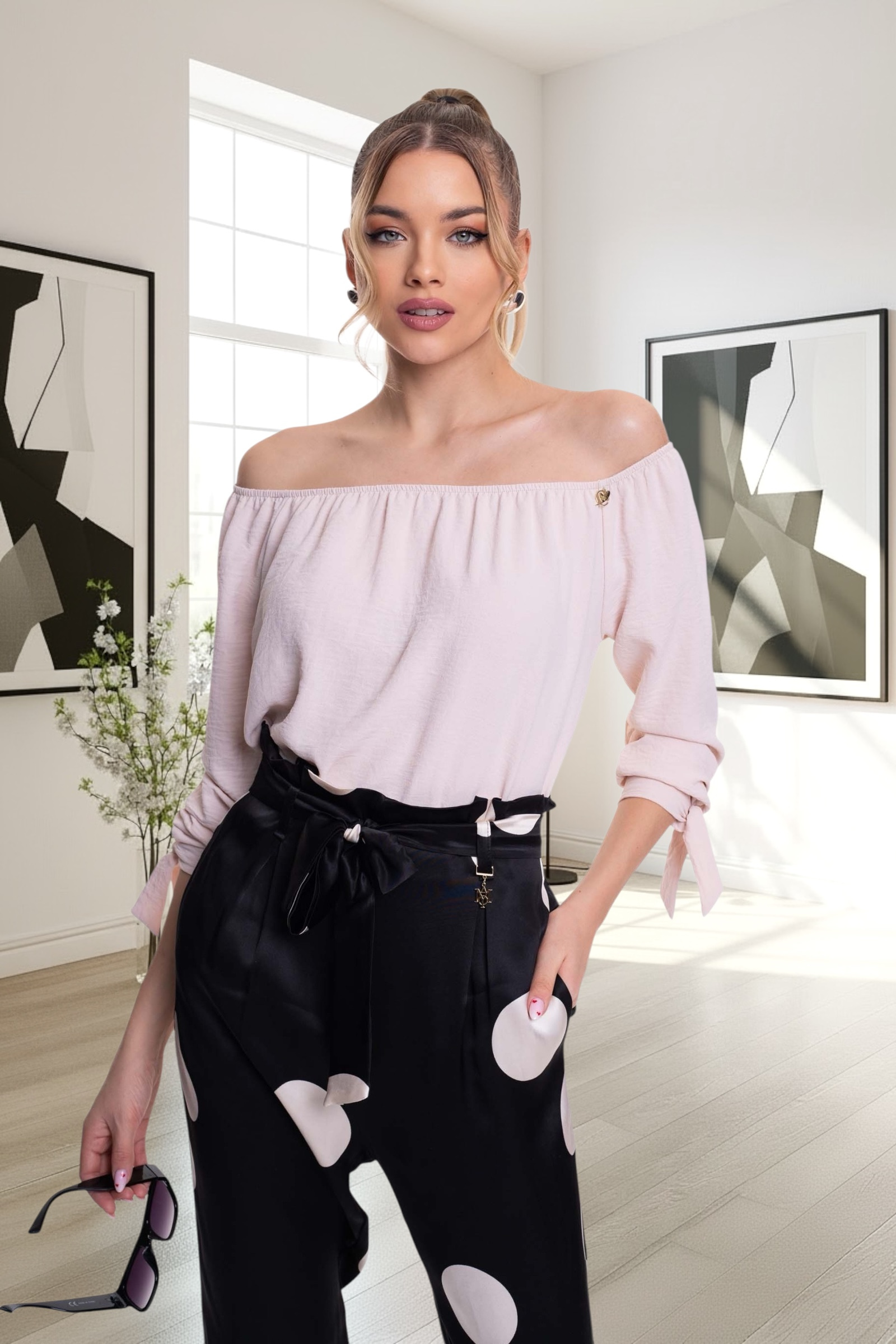 Elasztikus anyagból készült, lezser szabásvonalú póló íves alja vonallal, filmnyomással díszítve.