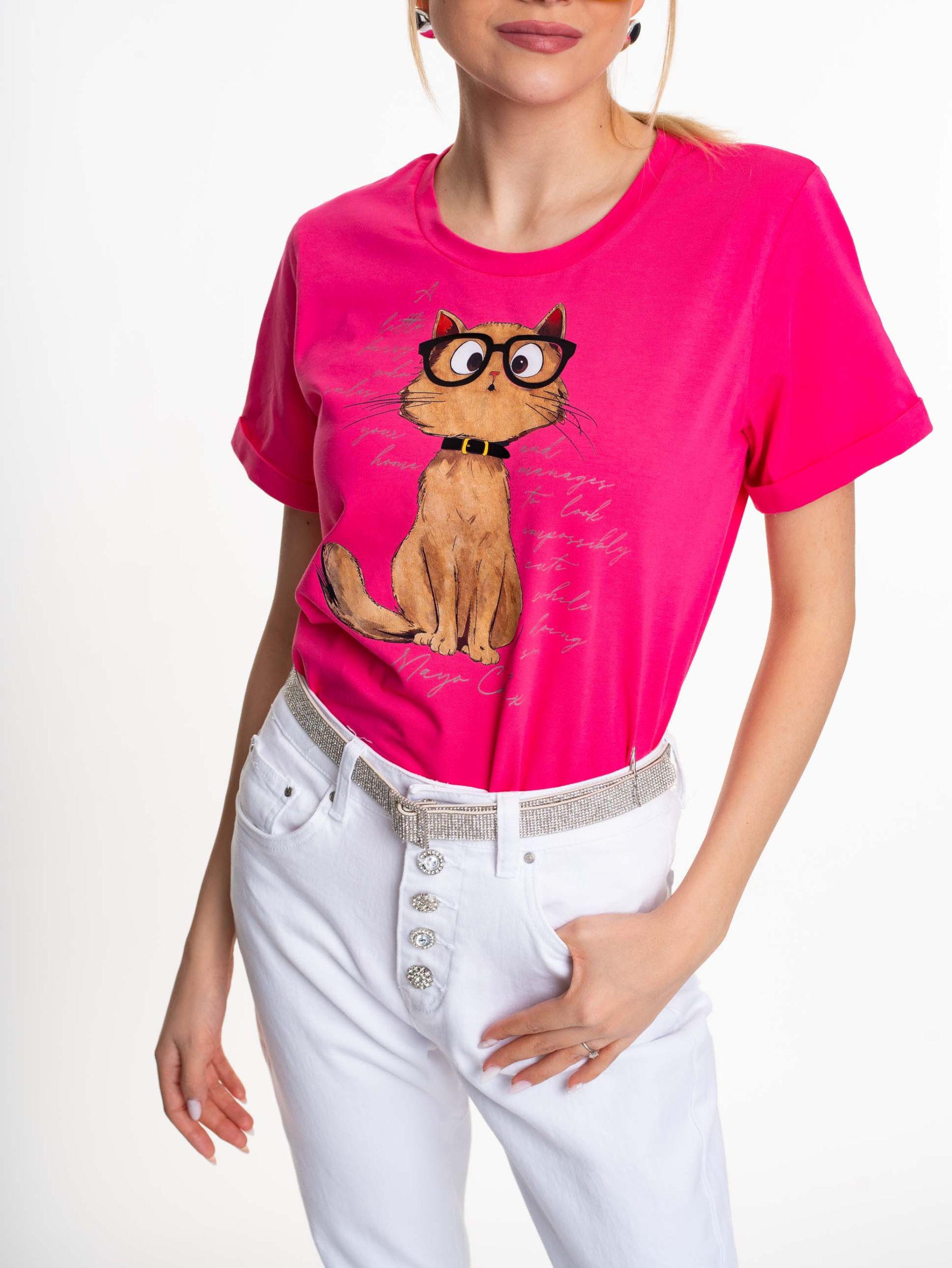 Elasztikus anyagból készült, egyenes szabásvonalú póló íves alja vonallal, matrica nyomott díszítéssel.
