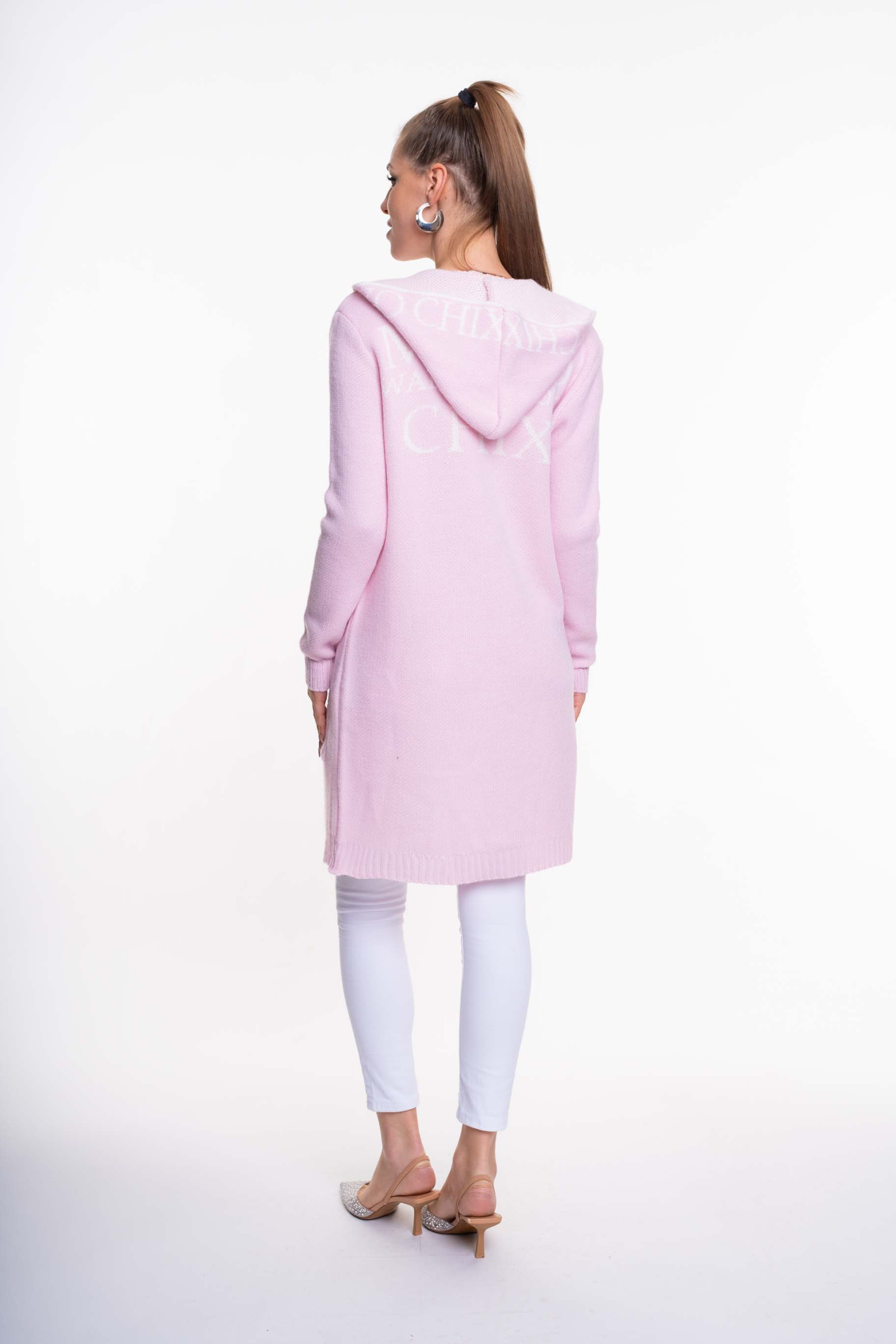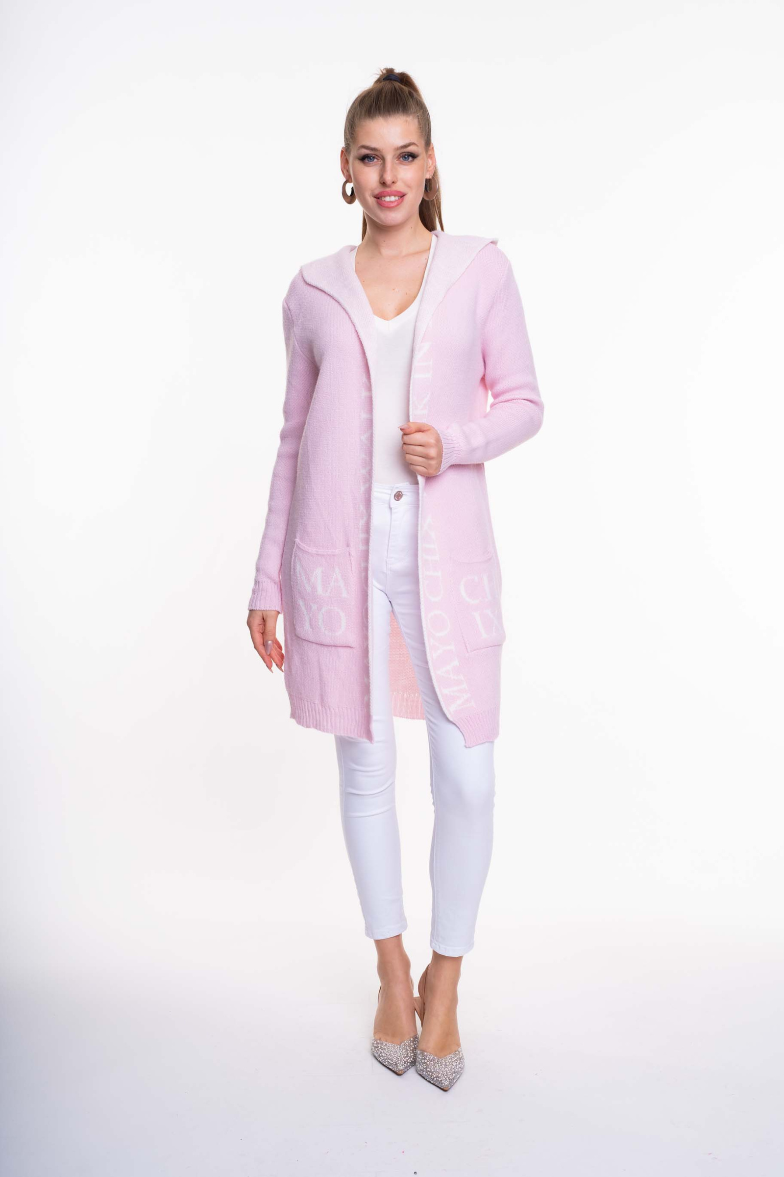 Elasztikus, kötött anyagból készült, zsebes, kapucnis, nyitott kardigán, anyagában kötött márkajelzéssel.