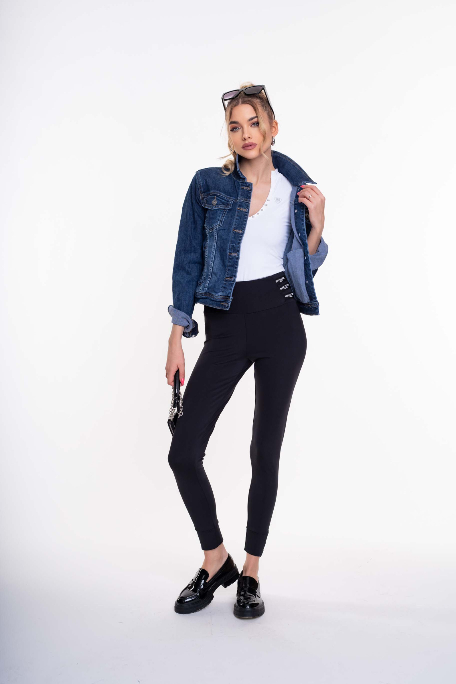 Elasztikus anyagból készült testhez símúló nadrág, márkajelzett gumiszalagokkal kiegészítve.