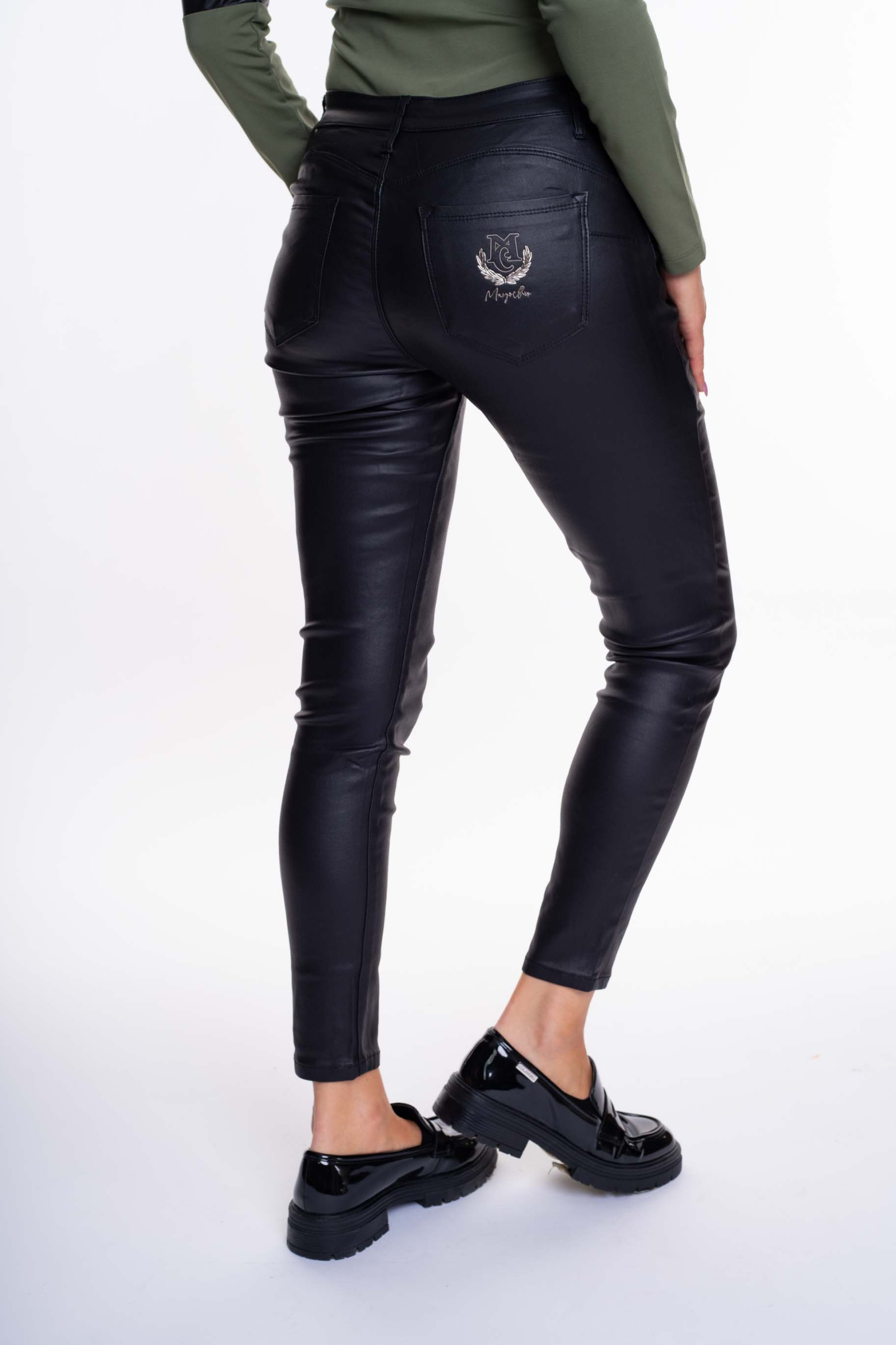 Elasztikus, kent anyagból készült szűkített fazonú nadrág, farzsebén matrica nyomott márkajelzéssel.