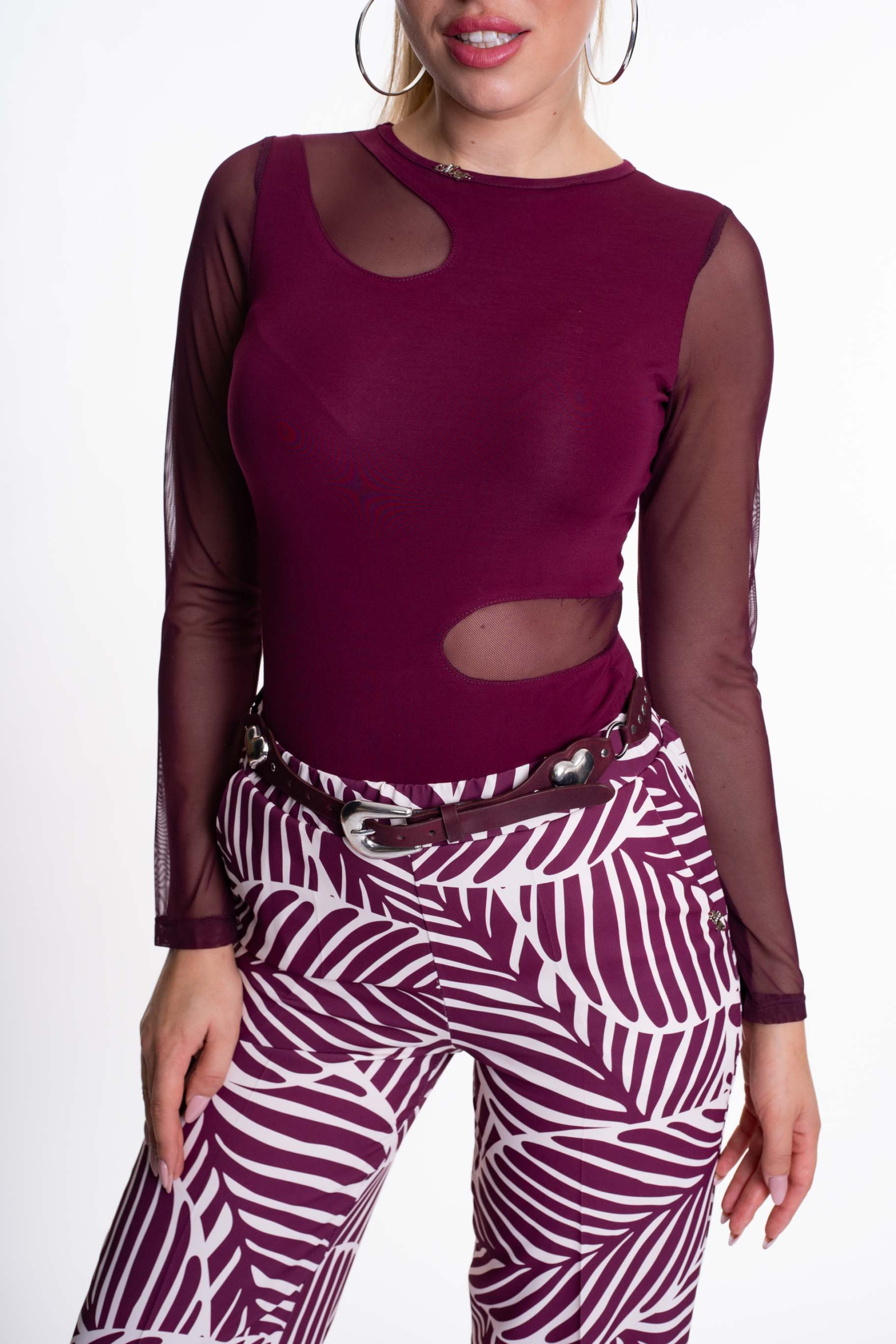 Elasztikus anyagból készült, necc anyaggal kombinált body, kis fém márkajelzéssel.