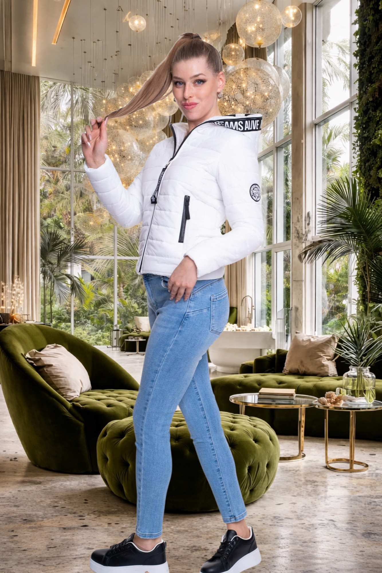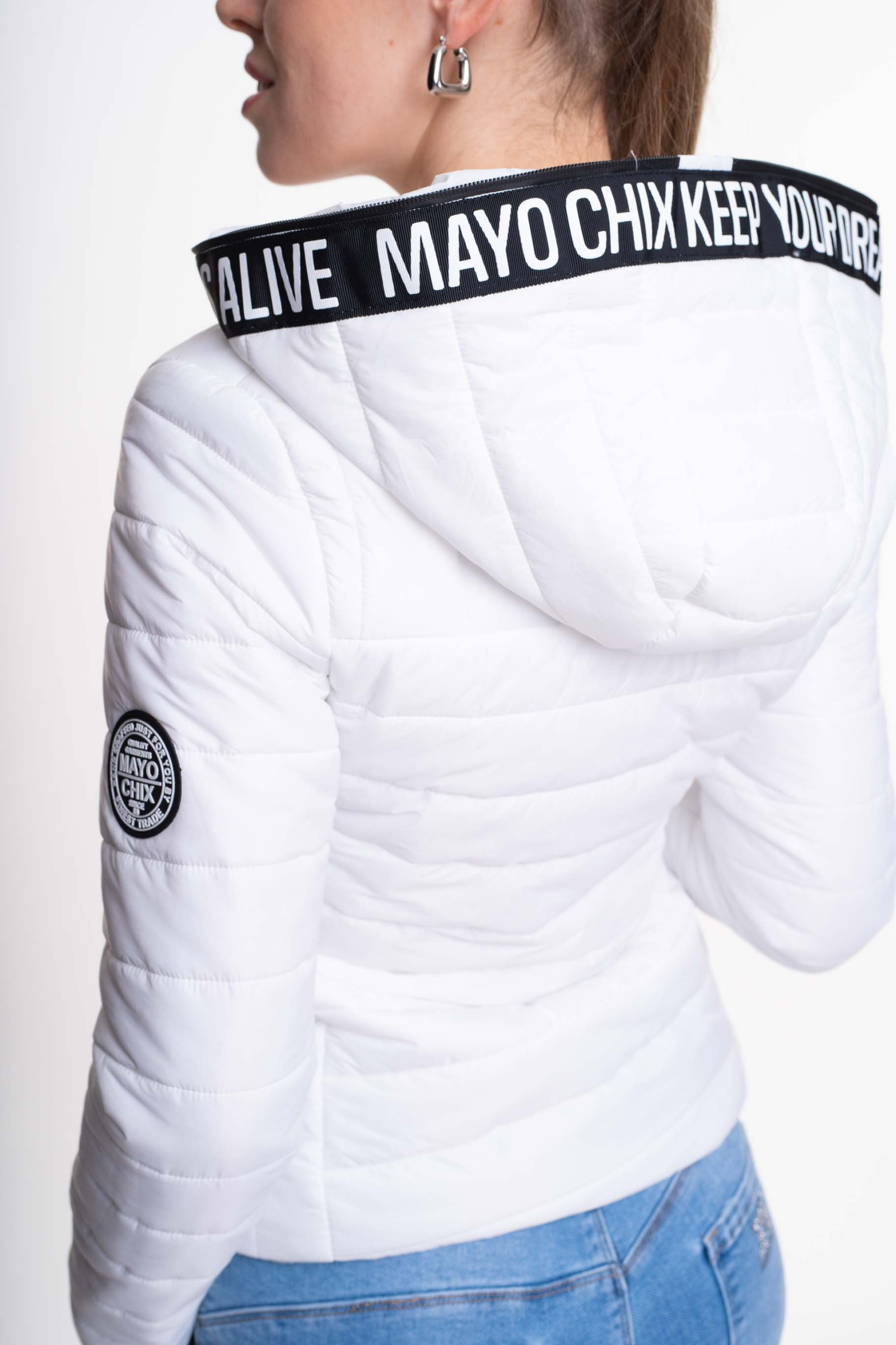 Steppelt anyagból készült átmeneti dzseki, márka jelzett cippzár húzókával, film nyomott és applikált márkajelzéssel.