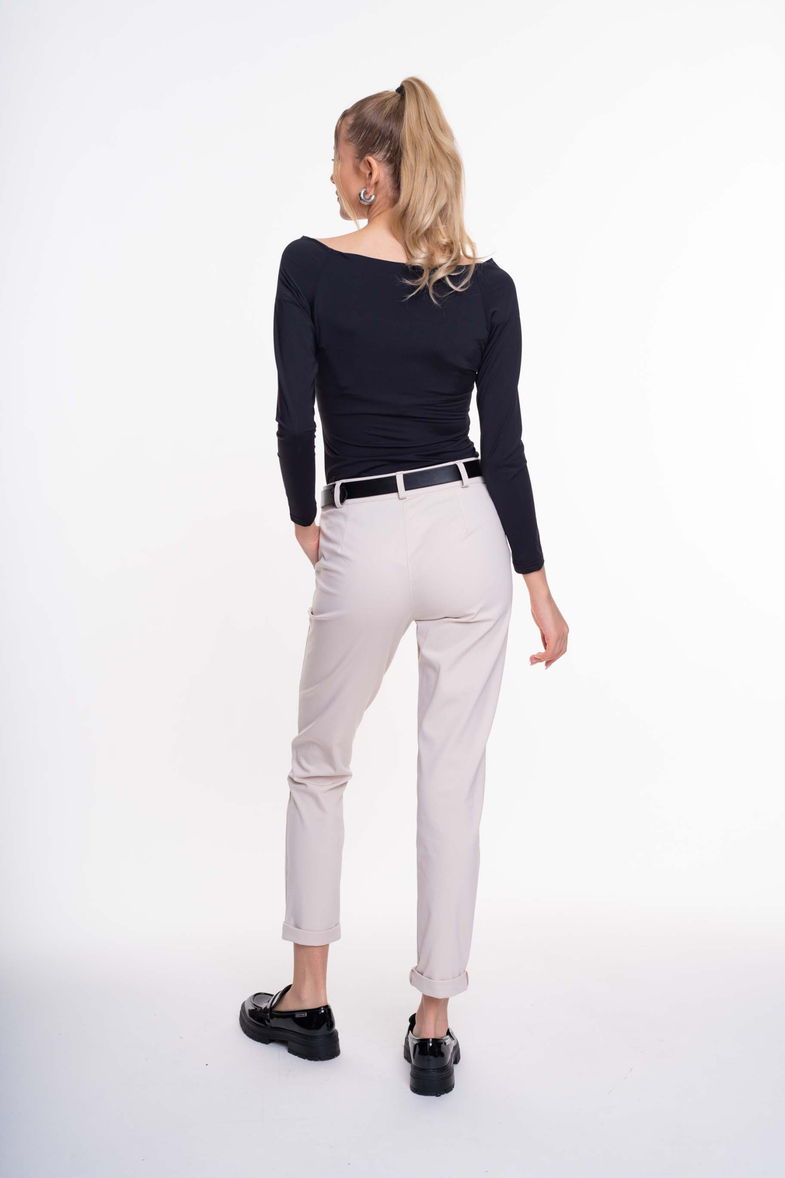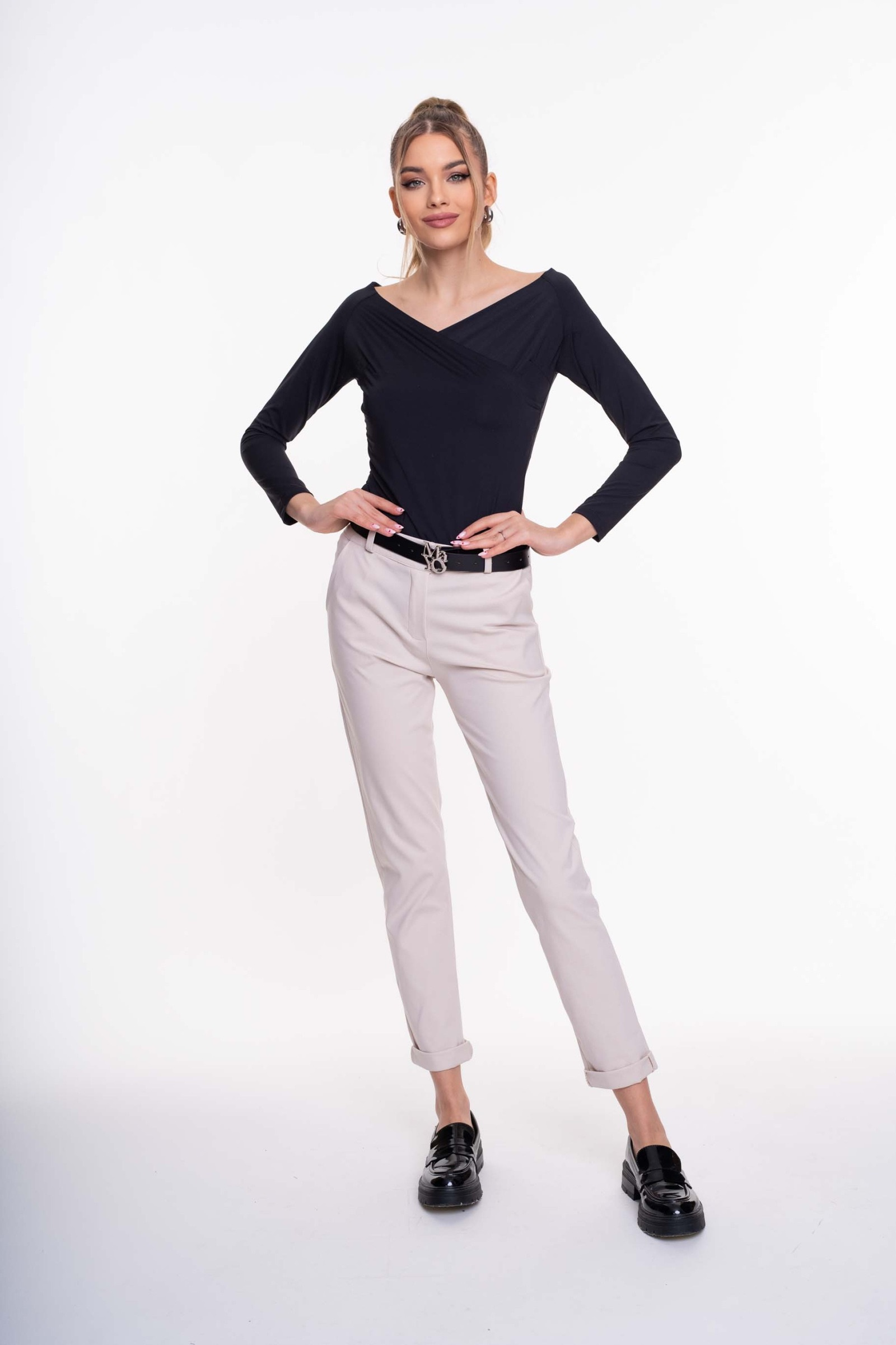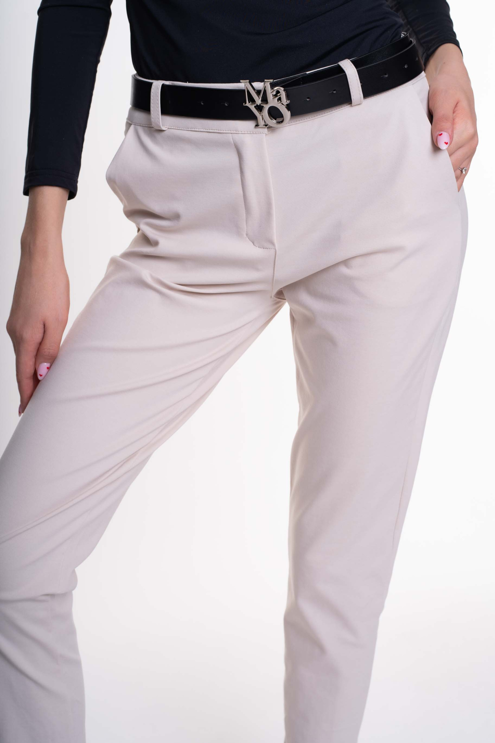 Elasztikus anyagból készült, svéd zsebes nadrág, gombos záródással, öv kiegészítővel, mosáshoz levehető kis fém márkajelzéssel.